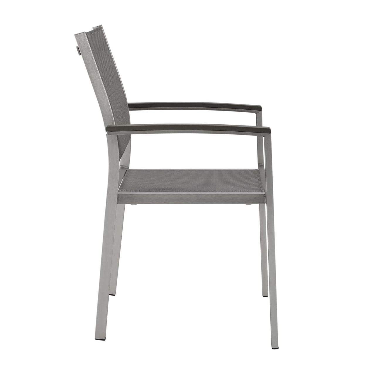 Enjoy your patio or backyard leisure time with the strong and durable Shore Outdoor Patio Dining Arm Chair in Mesh. Made with an anodized brushed aluminum frame and breathable Textilene® mesh, Shore Patio Dining Chair is a breeze to assemble and comes with non-marking black plastic foot caps under the legs. Chic and minimalist, the Shore Outdoor Dining Arm Chair complements your casual gatherings with a look and functionality you can rely on. Features: Includes: One – Shore Dining Chair Materials: Woven PVC coated polyester, anodized aluminum Finish: Silver, gray Breathable textilene® mesh Non-marking foot caps Specifications: Product Dimensions: 21.5″L x 22″W x 35″H Product Weight: 8 lbs Seat Dimensions: 18.5″L x 15.5″W x 17-18″H Product Dimensions: (Armrest Height) 25.5″H Product Dimensions: (Backrest) 17.5″H Product Dimensions: (Armrest) 18″L x 1″W x 7.5″H Product Dimensions: (Base) 15.5″W Product Dimensions: (Plastic Wood Arm Pad) 18″L x 1″W x 1/2″H
