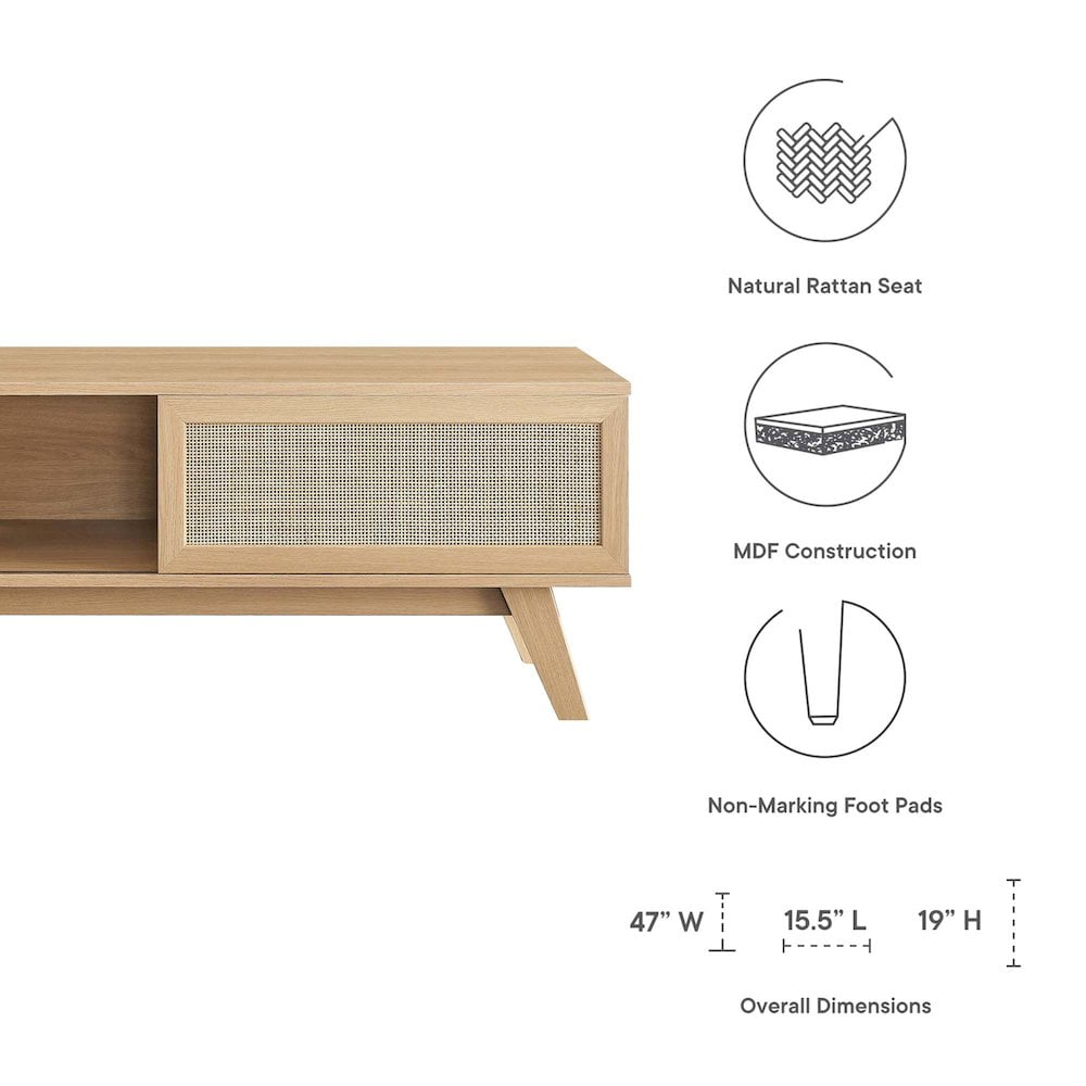 Modern TV Stand Natural Rattan Weave MDF and Particleboard Cable Management Holes Sliding Door Non-Marking Foot Pads Weight Capacity: 150 lbs.