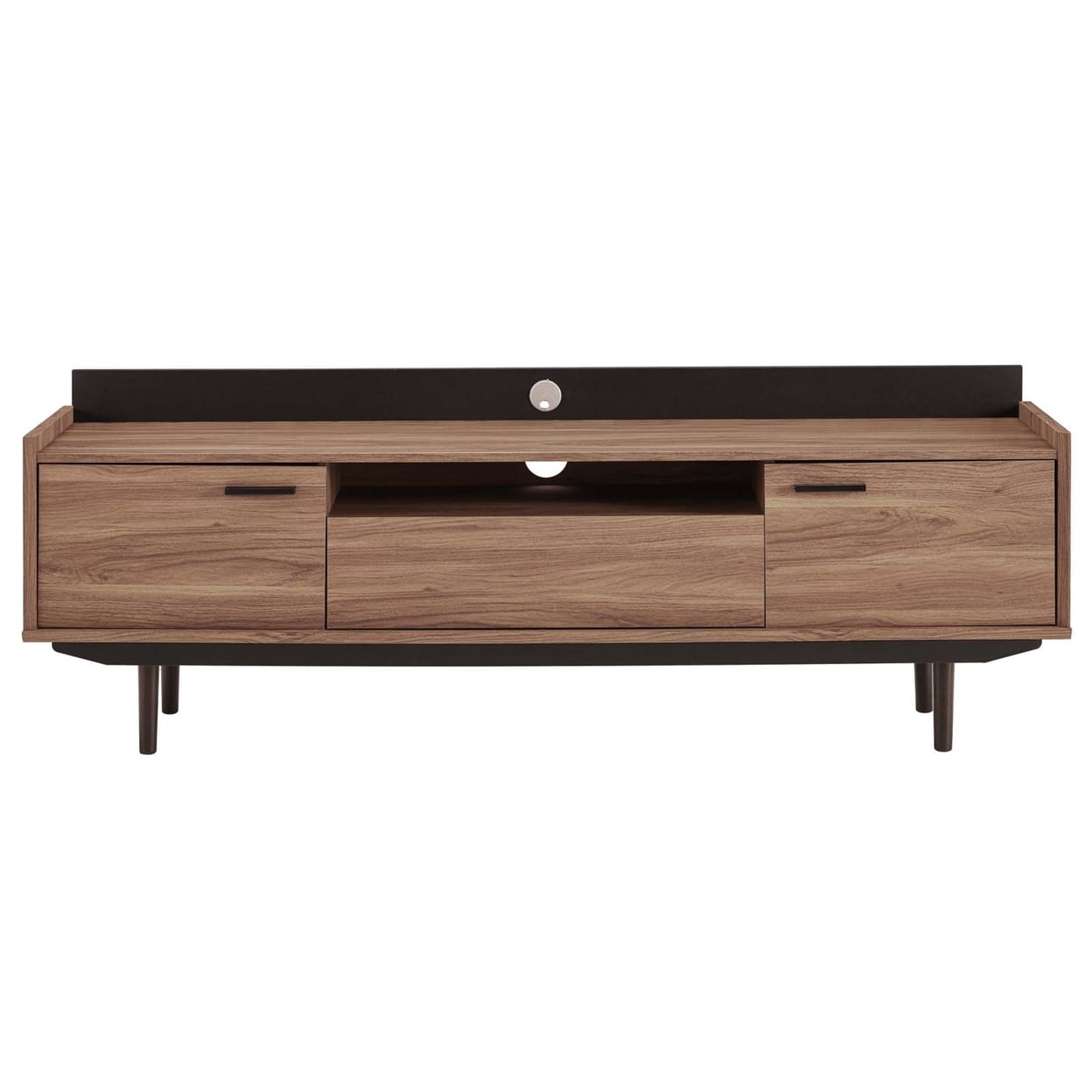 MID-CENTURY TV STAND – An organic aesthetic, clean lines, retro charm, and wood grain detail make this low-profile media console a thoughtful balance of mid-century style with modern usage in mind SPACIOUS STORAGE – Conceal media essentials, game systems, DVD players, and more with the full-extension center drawer with an open shelf on top and and two hinged doors on this wood TV stand MEDIA CONSOLE – An ideal addition to any recreation area, living room or bedroom, this modern stand accommodates flat screen TVs up to 78″, while two cable management keeps visual space clean DURABLE CONSTRUCTION – Sitting atop a matte black frame, this retro modern media stand features a particleboard frame with smooth walnut grain veneer and sleek black hardware TV STAND MEASUREMENTS – Complement a variety of contemporary décors with this sophisticated mid-century TV stand. Product Dimensions: 15″L x 71″W x 25″H