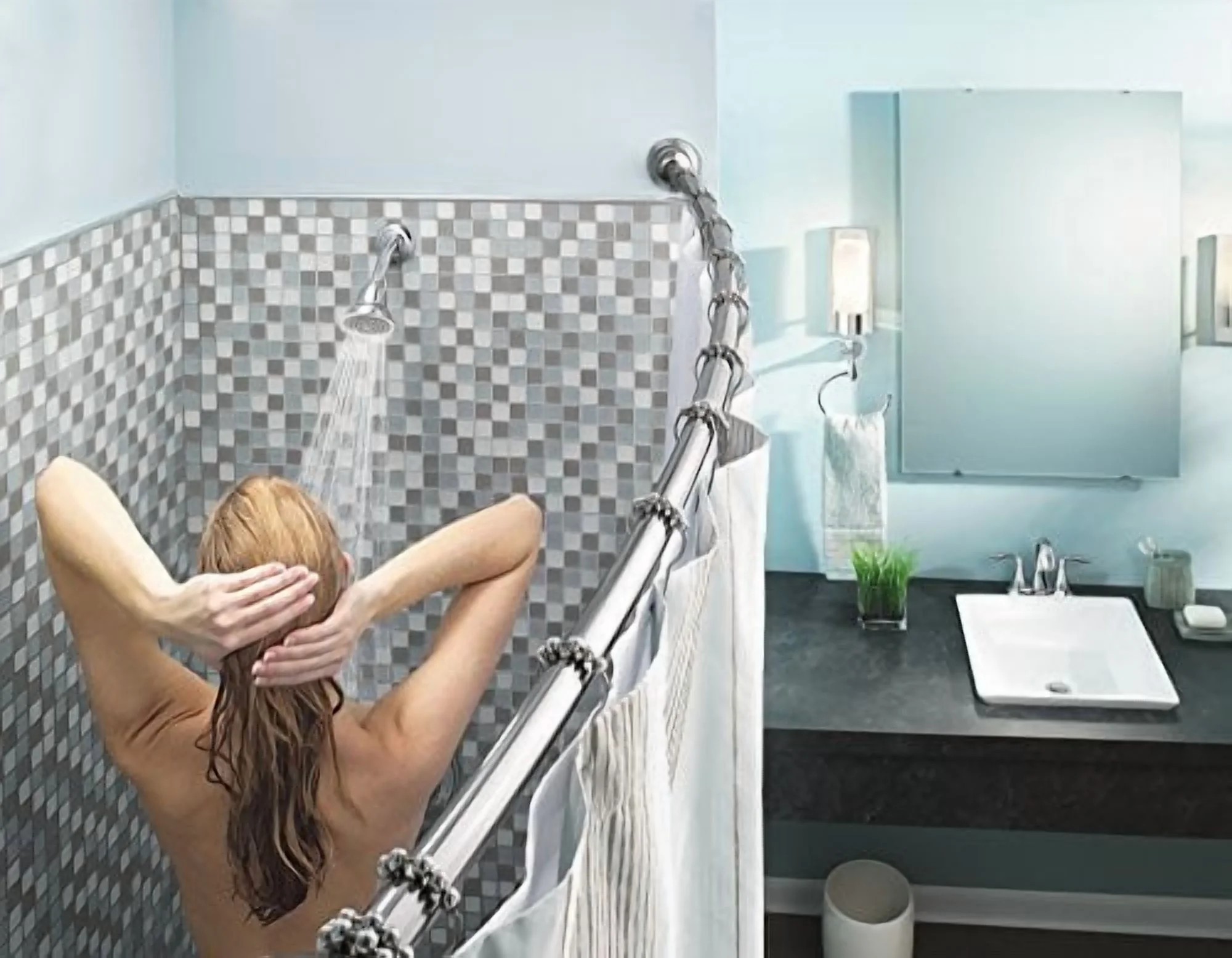 “With flowing curves, the Eva collection’s Transitional design is pure and organic. Petal-like handles and swan-like spout bring a relaxed feeling to the bath.”