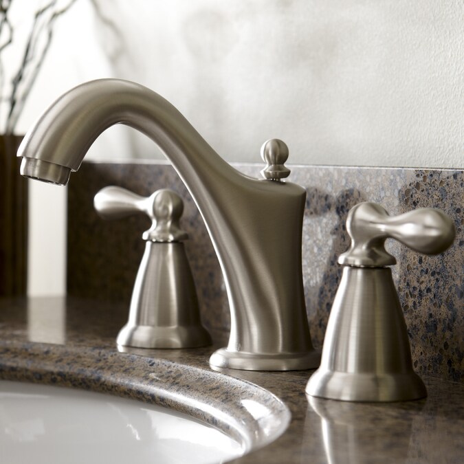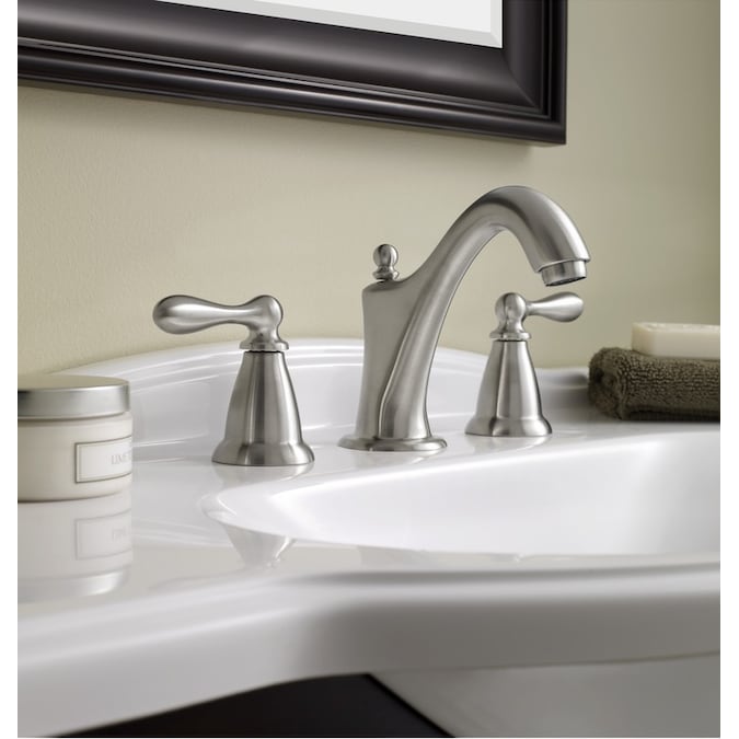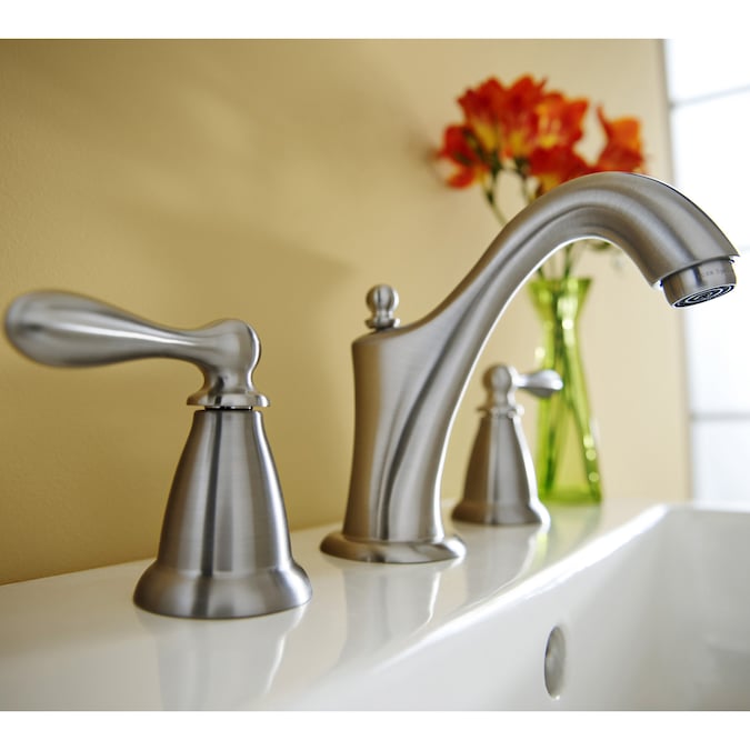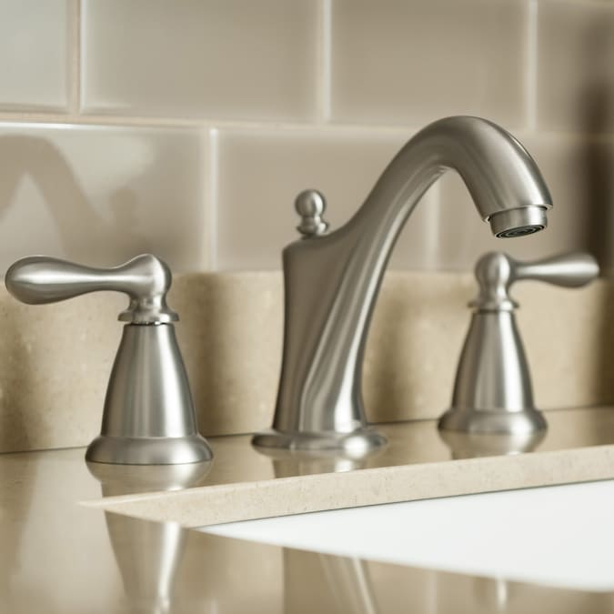 This elegant, understated Moen bathroom faucet from the Caldwell collection not only looks lovely, but conserves water with each use. The brushed nickel finish delivers a clean, polished appearance that blends beautifully with other brushed nickel fixtures and accessories in your bathroom. The WaterSense label means you’re conserving water without sacrificing performance. The two lever handles are classic in style and easy to use, allowing you to adjust hot and cold water until you reach just the right setting. They can be installed at any distance between 8-in and 16-in for a more customized widespread installation. The drain is included for your convenience, making installation quicker and easier. Add this faucet to your bathroom for a radiant look with the performance to match.