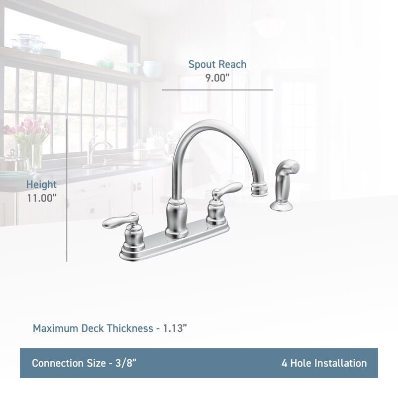 Moen Caldwell Collection offers homeowners classic styling with soft curves and rich details. Chrome finish is highly reflective for a mirrorlike look that works with any decorating style. Features Duralock quick connect system for easy installation. Twohandle lever handles make it easy to adjust the water. Included side spray for convenient cleaning at the sink. Complies with Americans with disabilities act ADA specifications. Meets current legislation, including AB1953 California and S152 Vermont.