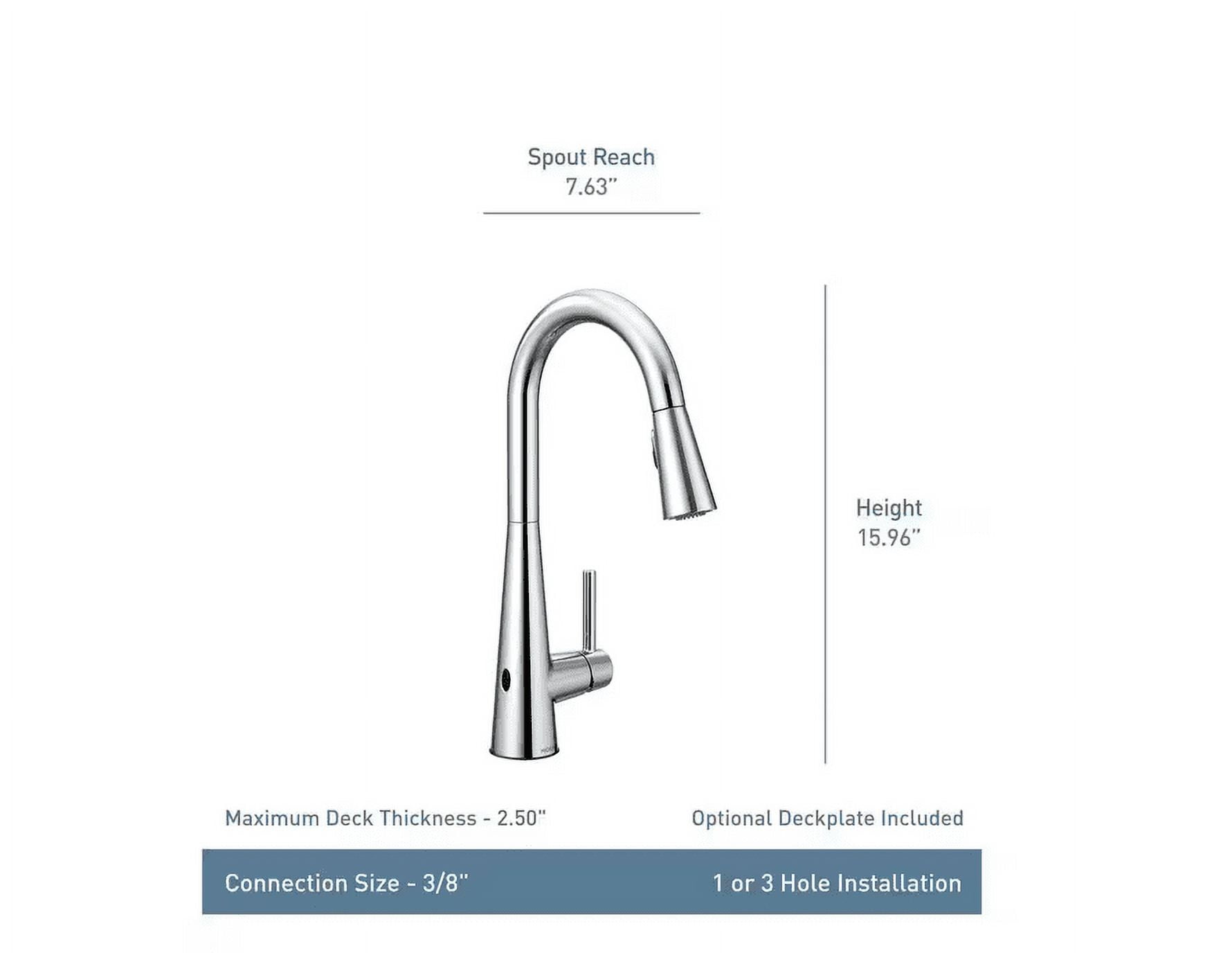 Desription Featuring a and cylindrical Modern style with soft, flowing lines, Sleek elevates Modern to a new level and defines the shape and function of things to come. The Sleek collection is a balance of elegance and function. This lustrous collection works seamlessly with today’s lifestyles. Features: featuring single-sensor touchless activation, MotionSense wave(tm) allows you to easily turn water on and off with the wave of a hand. no need to touch the faucet with dirty or wet hands. chrome finish is highly reflective for a mirror-like look that works with any decorating style ™ technology provides 50 percent more versus most of our pulldown and pullout faucets without the ™ technology. equipped with the Reflex(TM) system for smooth operation, easy movement and secure docking of the pulldown/pullout Specifications: Manufacturer Warranty: Finish:Chrome