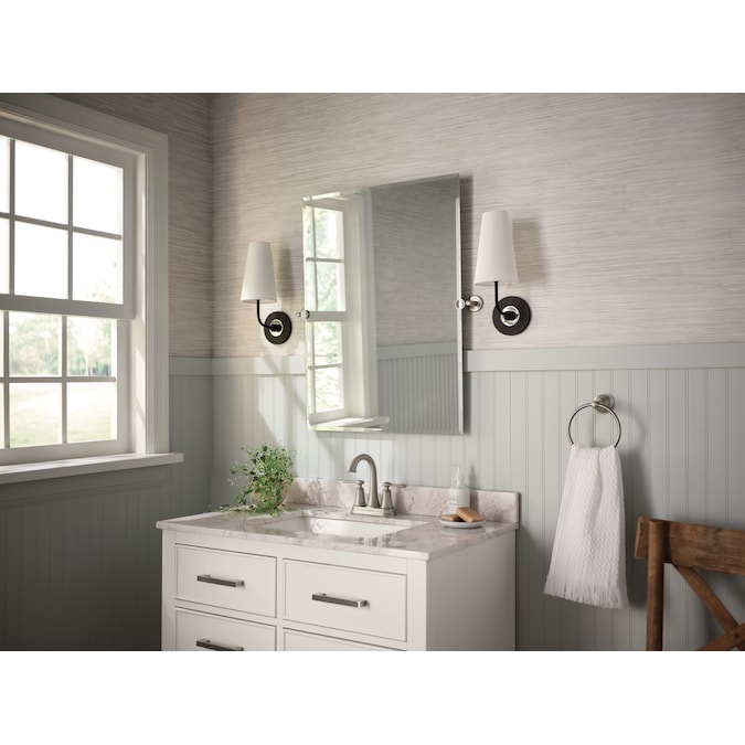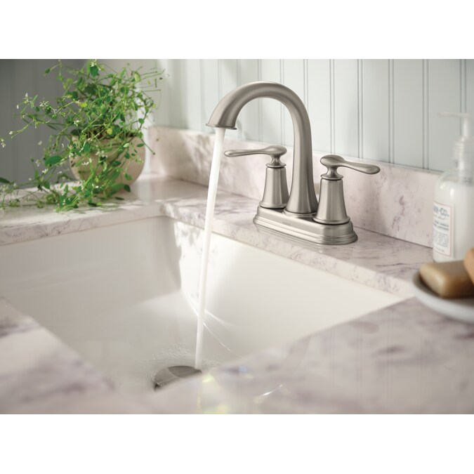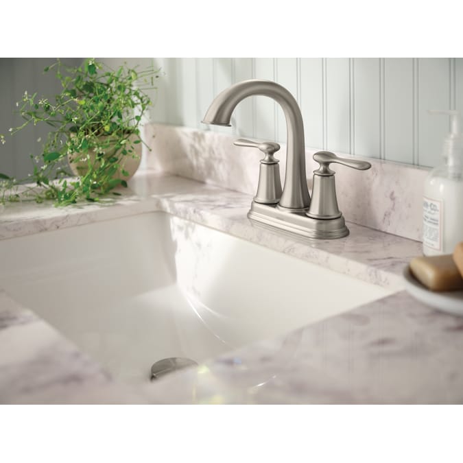 Offering timeless elegance, the Moen Ellicott two-handle centerset faucet is a beautiful complement to any bathroom design. The faucet is available in Moen’s exclusive Spot Resist Brushed Nickel finish, which resists fingerprints and water spots to maintain the fixture’s brilliance and minimize cleaning time. The faucet also comes equipped with an easy-to-install, push-down drain – simply press to seal and release.