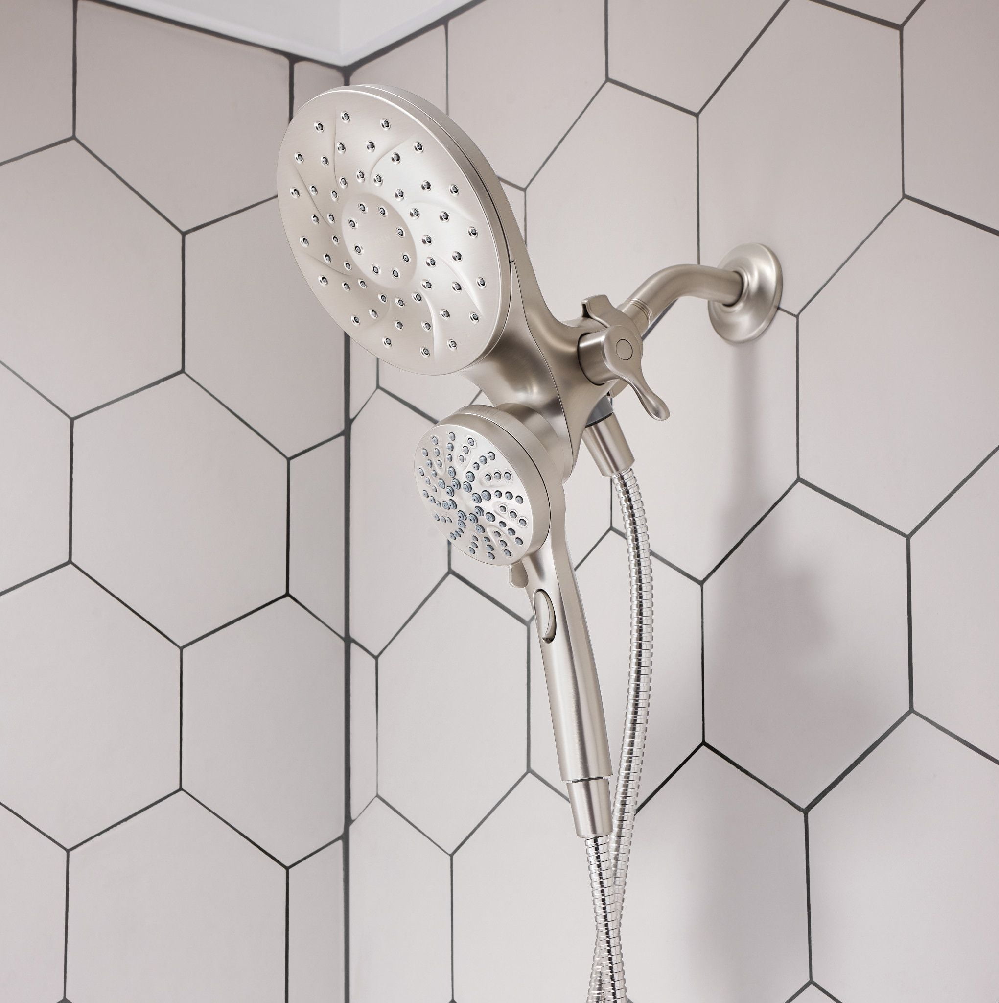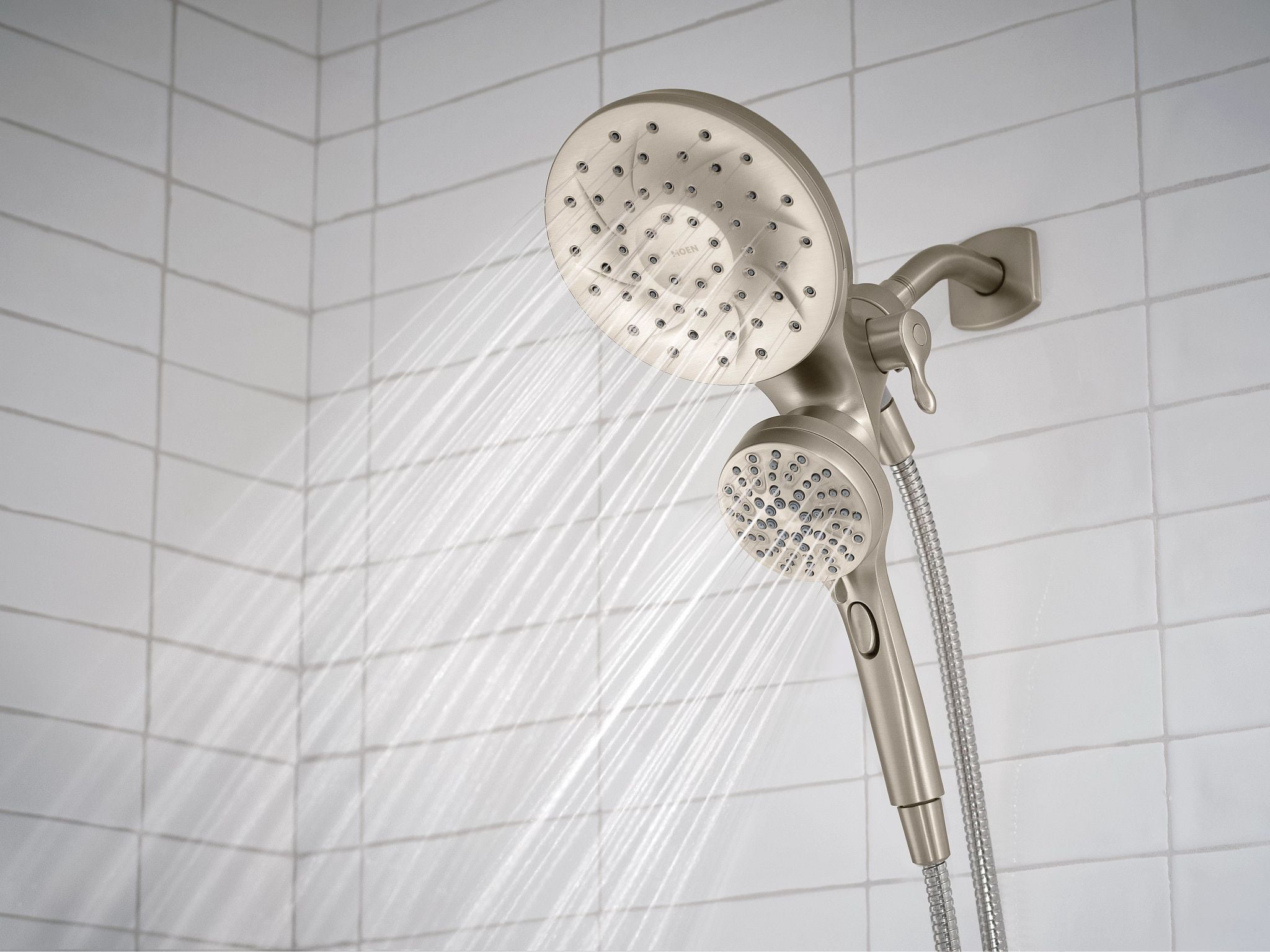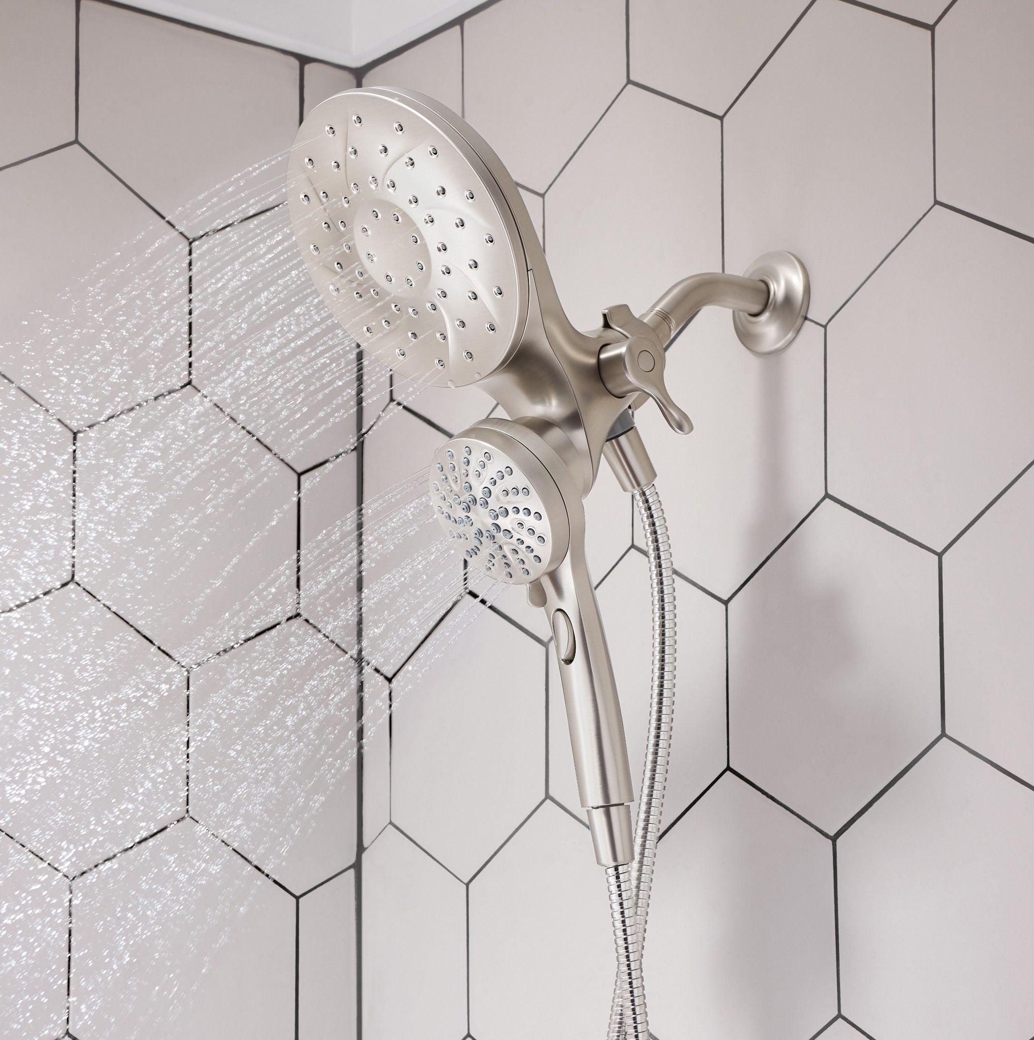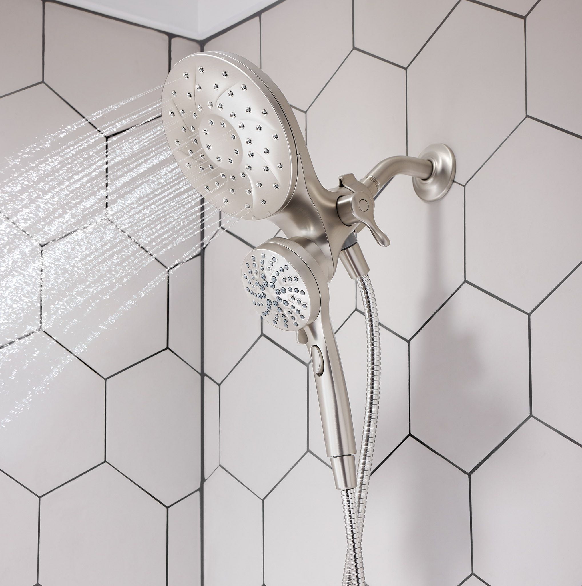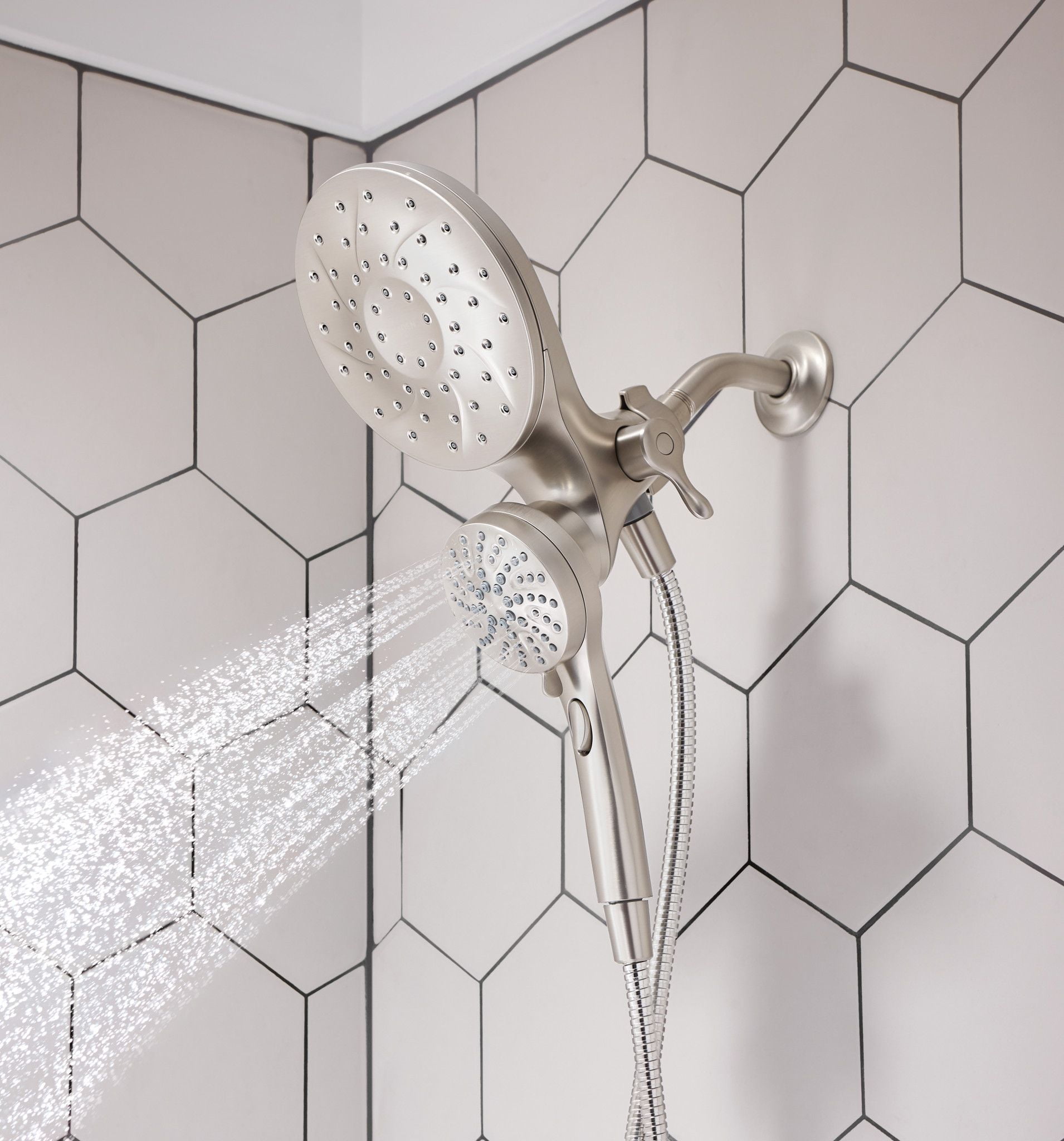 Spot Resist Nickel finish resists fingerprints and water spots for a cleaner looking bath The magnetic docking system allows you to easily detach and use as a handheld shower head or effortlessly replace it to dock with the snap of a magnet Multiple distinct shower settings gives flexibility and variety Features a 60″ kink-free metal hose that extends reach and flexibility Six-function pause, wide coverage, downpour, relaxing massage, massage, soothing massage, rinse Includes rain shower, hand shower, hose and magnetic docking system Limited 5 Year Warranty