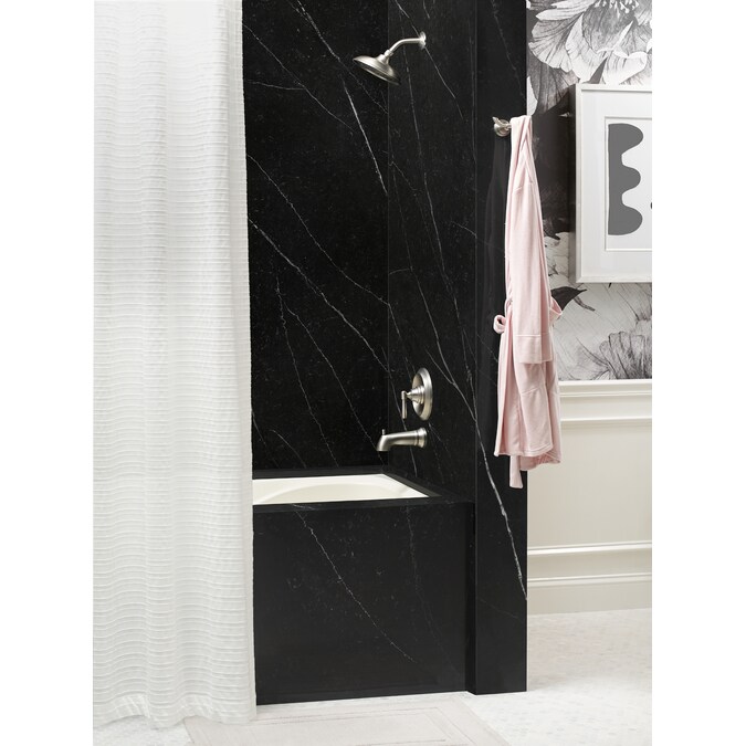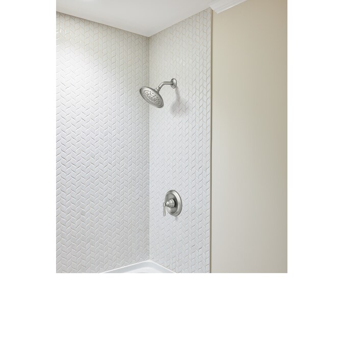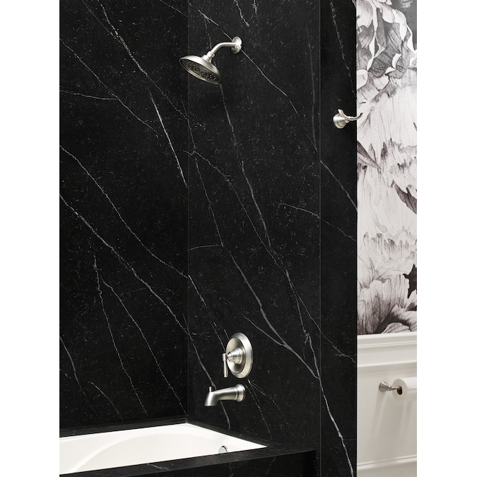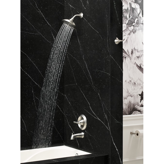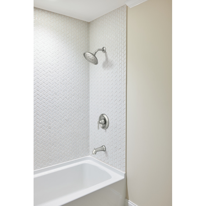 Inspired by timeless classical forms with a contemporary flair, the Halle tub/shower provides a stunning look for any bathroom. The fixture’s linear elements paired with crisp details offer an elegant look that perfectly matches the coordinating faucets, while the single-handle lever makes adjusting the water flow and temperature simple. Available in Moen’s exclusive Spot Resist Brushed Nickel finish, which resists fingerprints and water spots to maintain the brilliance of the fixture.