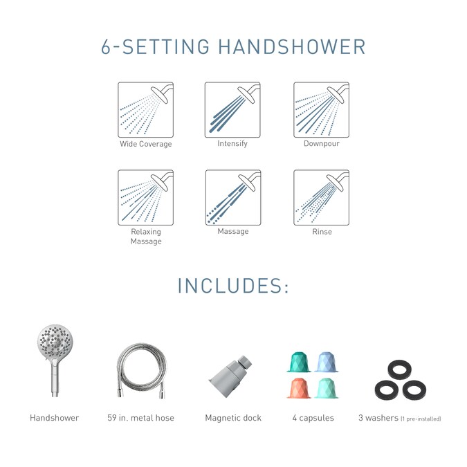 The Moen Aromatherapy Handshower creates a luxurious sensory experience. Six spray settings on the handshower provide optimal water pressure and excellent coverage. Add an INLY Aromatherapy Shower Capsule to your routine and infuse the shower with essential oils and spa-inspired fragrances. Relax. Rejuvenate. Reinvent your time in the shower with Moen.