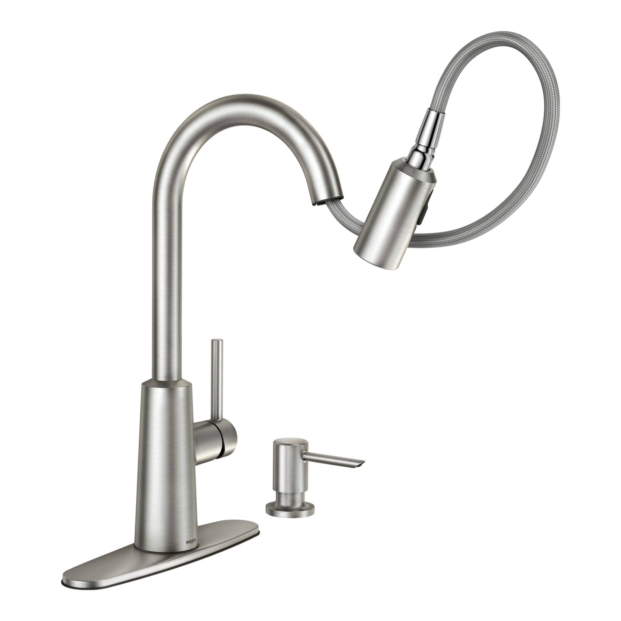 Brand Name: Moen Style: Nori Number of Faucet Handles: One Handle Finish: Stainless Steel Product Type: Pulldown Kitchen Faucet Side Sprayer Included: No Handle Type: Lever Flow Rate: 1.5 gpm ADA Compliant: Yes Number of Installation Holes Required: 1 to 4 Spout Type: High Arc Packaging Type: Boxed Supply Lines Included: Yes Spout Height: 17 in. Spout Reach: 8-9/16 in. Soap Dispenser Included: Yes Department – PLUMBING/HEATING mdseClass – FAUCETS prodGroup – KITCHEN FAUCETS
