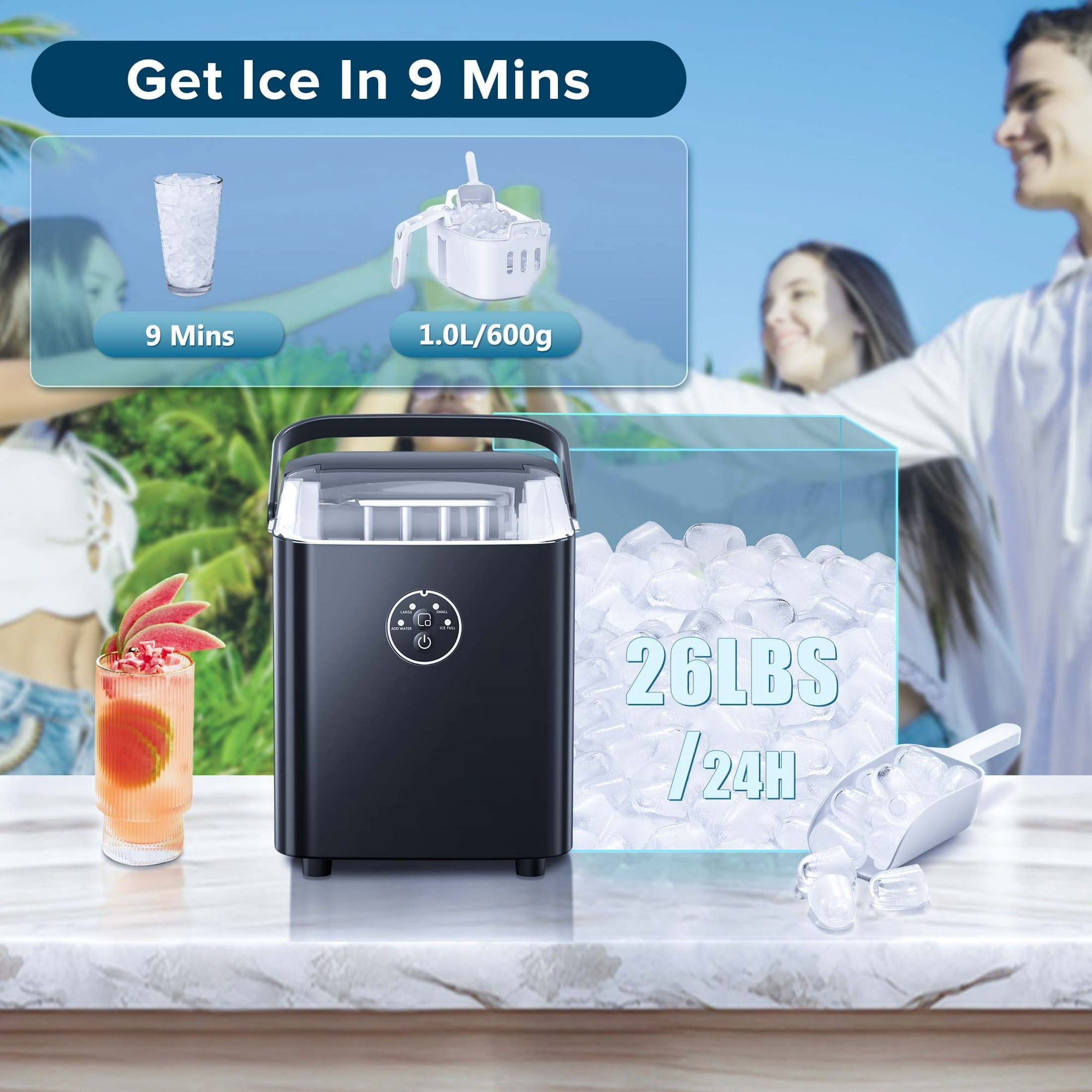 Moifoi Countertop Ice Maker, 26 lbs/24H, 8 Bullet Ice Cubes/9 Mins, S/L Ice Cube, Black