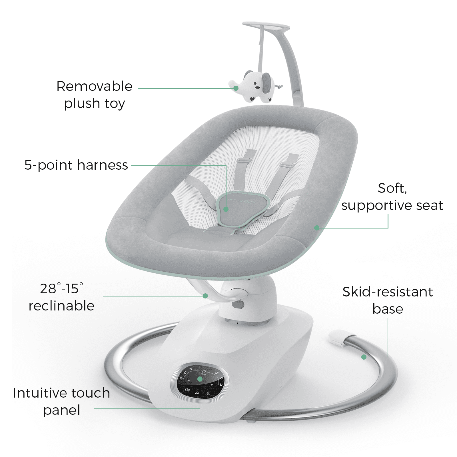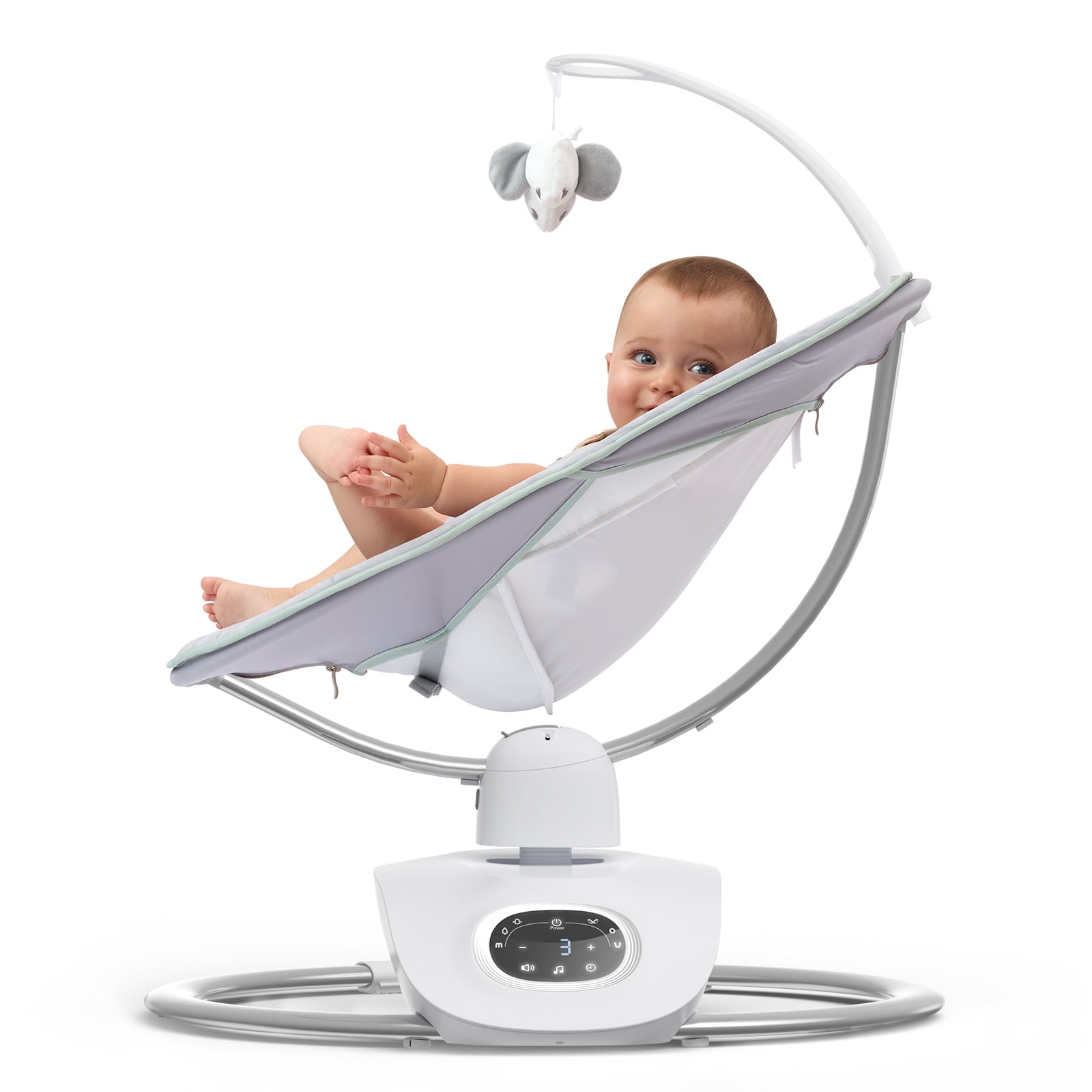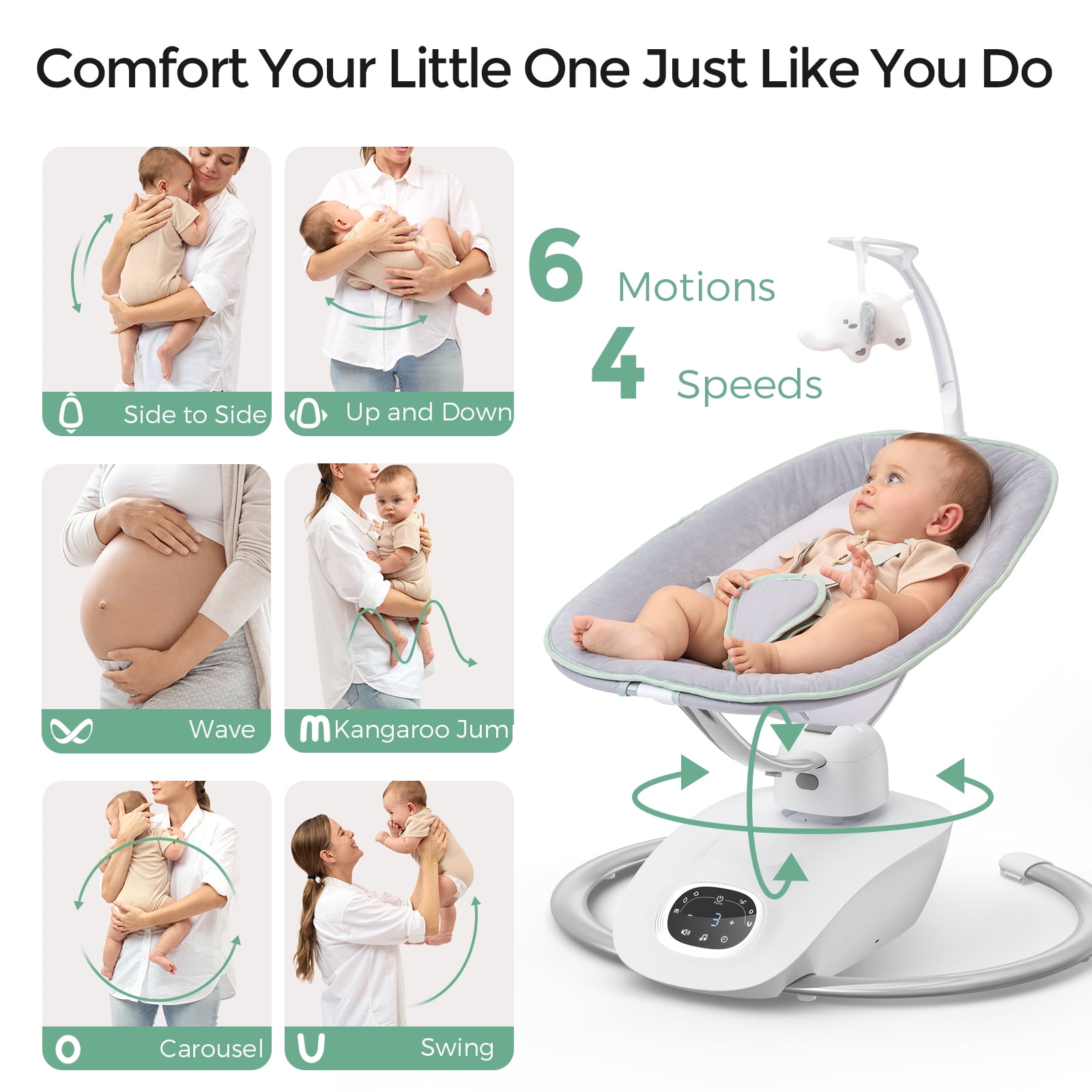 Soothe and Entertain Your Baby as You Do:Our exclusive patented 3D baby swing technology adds a new dimension to the swinging action, eliminating the boring side-to-side rocking and giving your baby more modes of fun. 6 Soothing Motions in 4 Speeds: Inspired by real parents. Baby swing for infants include side-to-side, bounce, figure 8, M, O, and U shapes. Choose from 4 swinging speeds to match the baby’s unique pace. Stay Connected with Baby: The baby swing seat easily rotates 180° degrees—no fuss moving the whole gear. Keep eye contact and interact with your baby as you move around the room. Enhanced Safety for Your Peace of Mind: A 5-point harness keeps the baby secure on the seat. The baby swing sturdy metal base prevents tipping.