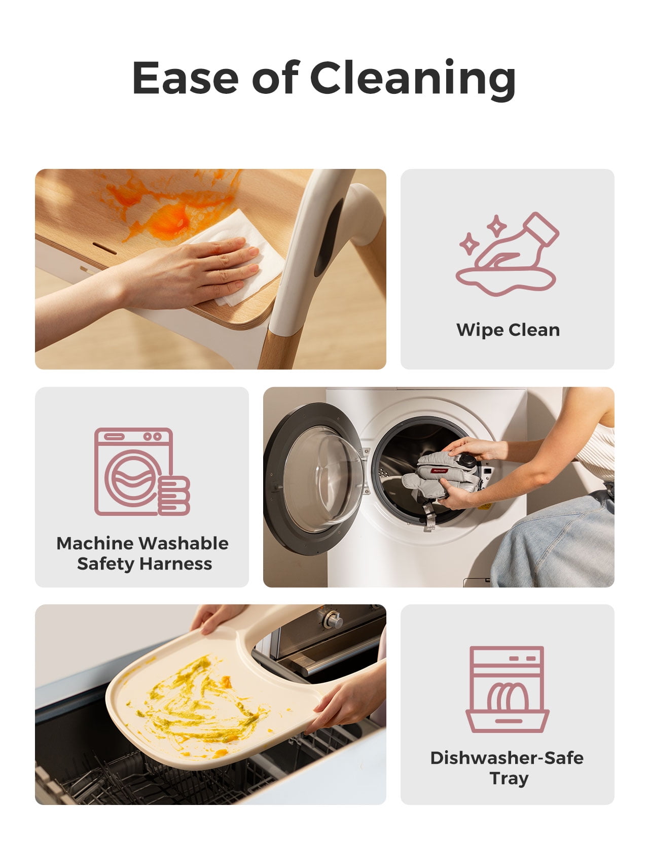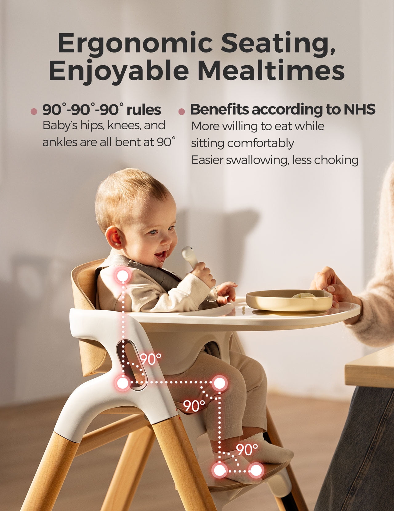 Grows with Your Child and Family – Designed for every stage, this high chair transitions from a baby set to a toddler seat, learning tower, and, when needed, an extra adult chair that supports up to 308 lbs. Chair modes (baby, toddler, and adult) require no tools for adjustment, making it easy to adapt to your family’s needs Adjustable Seat and Footrest – Press and slide to adjust the seat and footrest, each offering 7 height positions to ensure optimal support. The 16-inch wide seat with 2 depth positions provides lasting comfort, even for bigger kids Ergonomic Seating – Slightly curved back supports healthy upright posture, while the adjustable seat and footrest provide sturdy support for your baby’s comfort and stability Large, Dishwasher Safe Tray – The 23.5-inch wide tray fits most suction bowls, made of BPA-free, food-grade plastic, and is easy to remove with one hand Safety-First Design – Five-point harness keeps baby securely in place. The stable triangular frame and non-slip silicone feet prevent tipping or sliding. Made of FSC-certified beechwood and Food-Grade plastic, meeting ASTM and EN safety standards