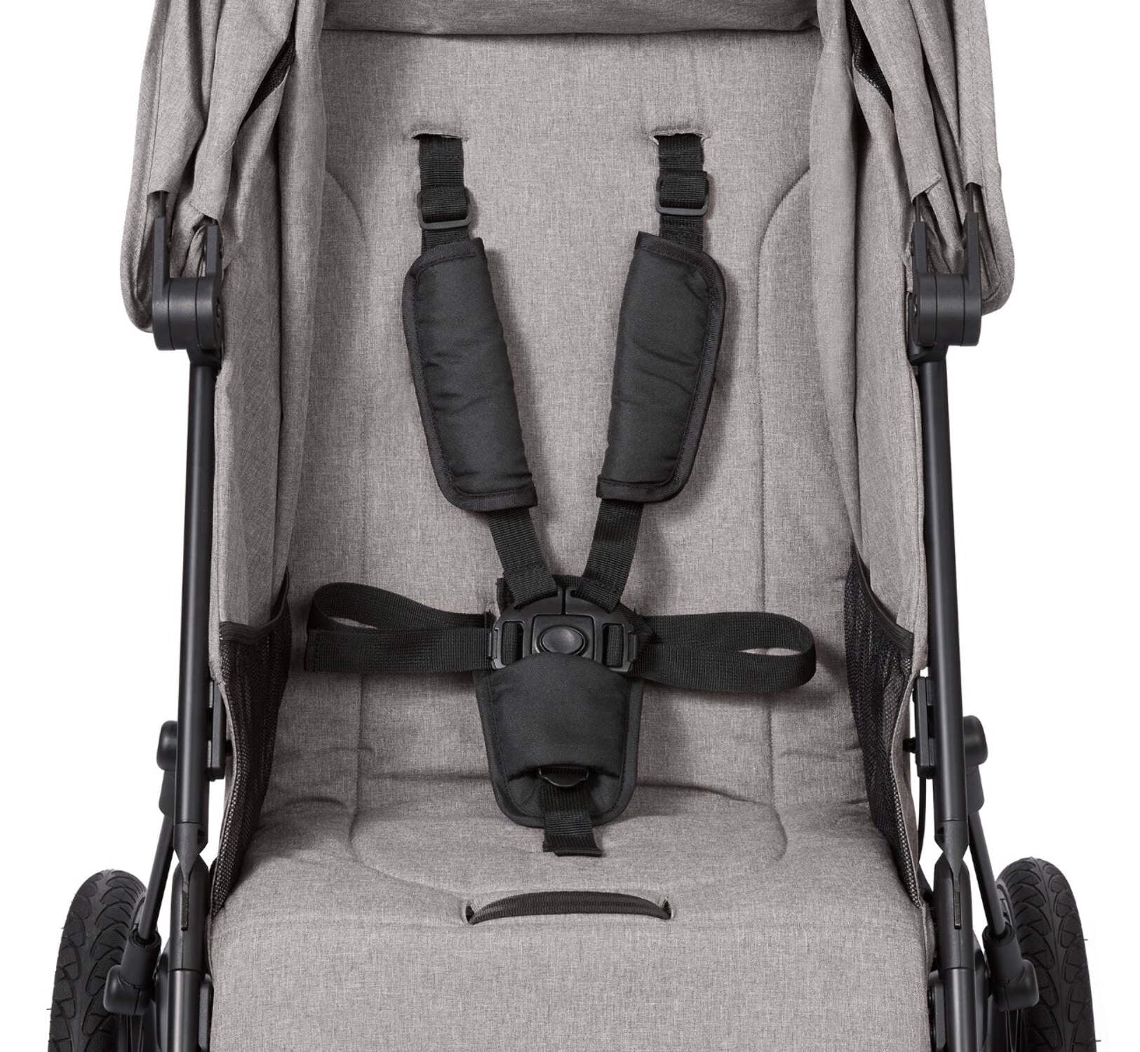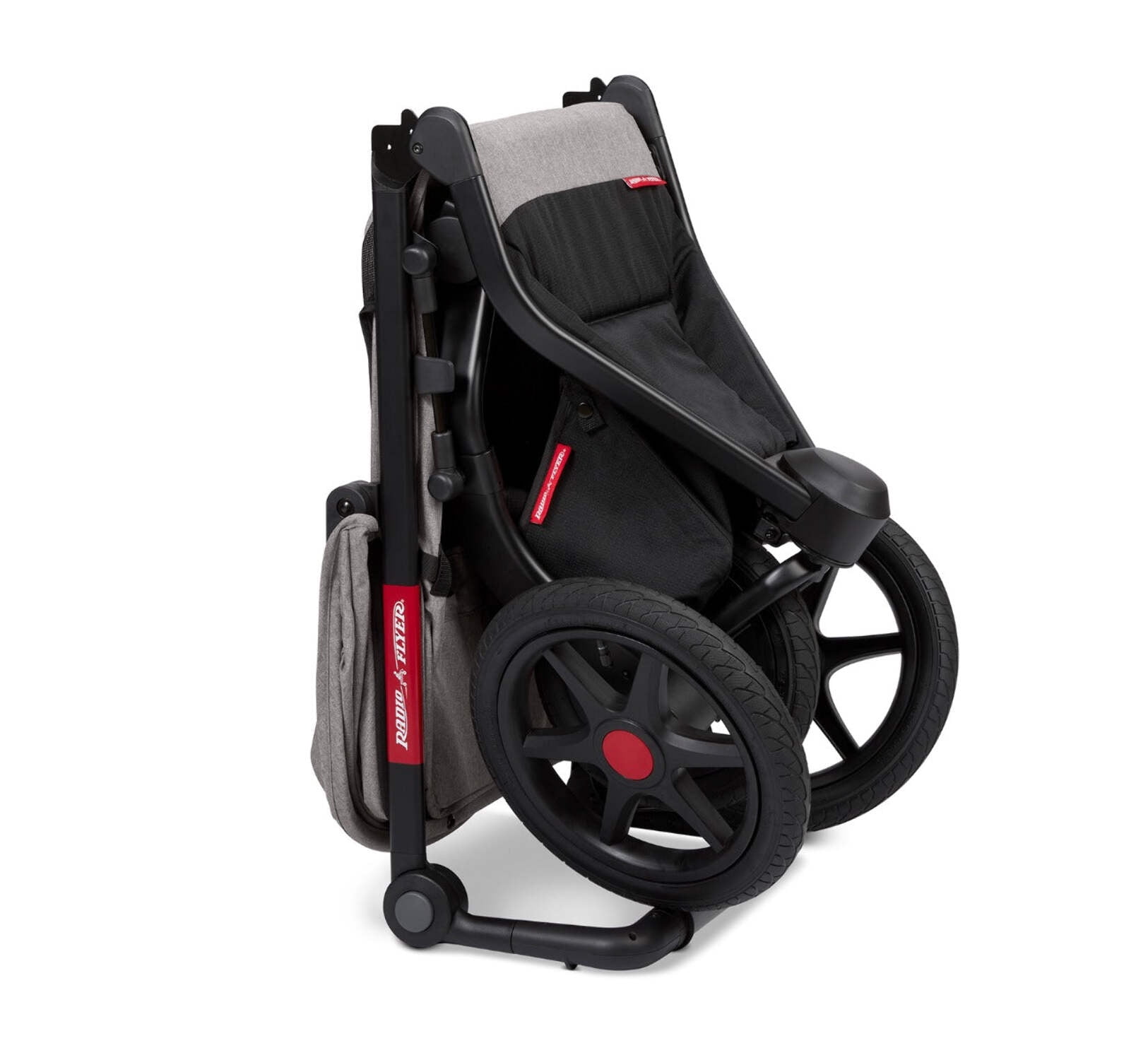 Quick Switch™ steering: twist the handlebar to easily unlock the 12″ front swivel wheel for on-demand steering One-hand compact fold for storage and convenient transport. Conveniently stand upright when folded Durable air tires absorb shock and provide a smooth ride 5-Point safety harness and internal storage pockets Extendable canopy with zippered mesh window and reclining seat back Height-adjustable handlebar with a comfort grip Wrist strap for safety while jogging Meets the Stroller Standard ASTM F833 Suitable for babies, toddlers, and kids ages 6 months – 5 years