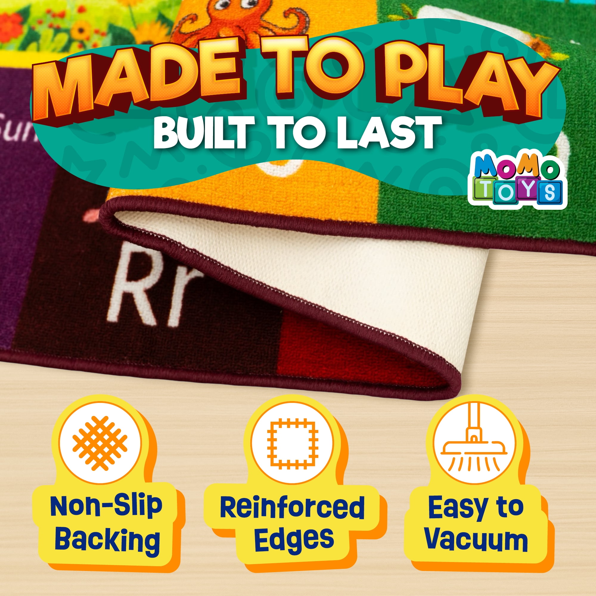 Make learning fun with the MOMOTOYS Educational Classroom Rug. This bright ABC rug has letters, numbers, animals, and shapes with colorful pictures that keep kids interested. The playroom rug turns learning into a game, so children enjoy playing while they discover new things on a soft play rug made just for them. This playroom mat is the perfect size for kids to move and explore safely. It fits well in any bedroom or playroom, giving plenty of space for play and learning. With this alphabet rug, your child can build skills while having fun on soft and safe floor mats for kids designed for comfort and activity. Made from soft, durable material, this kids rug is made to last. The strong stitching and non-slip backing keep the classroom rug in place, so kids can play without slipping. Plus, you get a fun coloring book with the playroom rug to boost creativity and keep your child entertained. This safe and sturdy ABC rug is a great addition to any child’s room. Bring home the MOMOTOYS Educational Classroom Rug today and help your child learn through play!