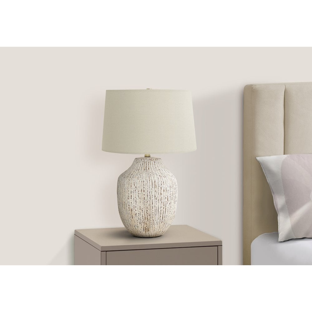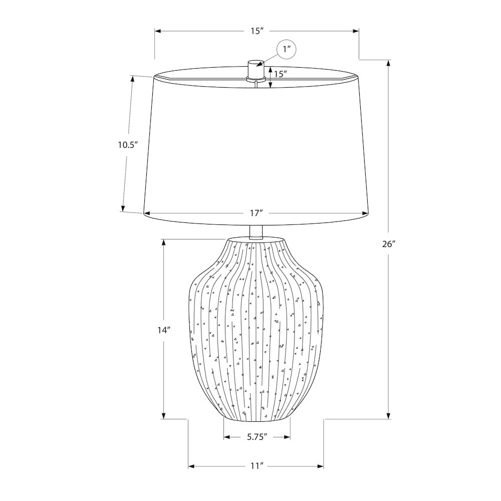 Bring some sophistication to any room with this transitional style 26″H table lamp. A beautiful blend of a textured cream ceramic vase shaped base topped with an ivory linen shade and finished with a gold finial on top, this stylish lamp is a great way to brighten any bedroom, living room or office. With a 3-way switch that houses a single bulb (not included) for a maximum output of 100W/120V, this lamp offers three levels of illuminating light for creating the ambiance you desire. Attached with a 5ft transparent cord, this is the perfect functional accent to place on an end or side table, nightstand or bedside table. Made with quality materials, this lamp includes a 2 year limited warranty against any manufacturer’s defects for a worry-free purchase. Features: Material: Ceramic Finish: Cream, ivory With a 5ft long black cord, this perfectly sized and practical decorative accent can be set on an end or side table in your living room or home office, or on your bedside table for some eclectic charm in your bedroom. Minor assembly is required with illustrated instructions included. Confidently designed using durable materials, this lamp is backed with 2-year limited warranty against manufacturer’s defects for your satisfaction. Transitional style with a vase-like shape, this 26″H textured cream ceramic table lamp topped with an ivory linen drum shade and finished with a gold finial on top, will bring fashionable, casual style to any space. This lamp features a 3-way rotary switch holding a single bulb (not included) for a maximum output of 100W/120V, allowing you to customize the lighting ambiance in your space. Specifications: Product Dimensions: 26″ H x 17″ W x 17″ D Product Weight: 8 lbs Product Dimensions: (Base) 14″ H x 11″ W x 11″ D; (Shade) 10.5″ H x 17″ W x 17″ D
