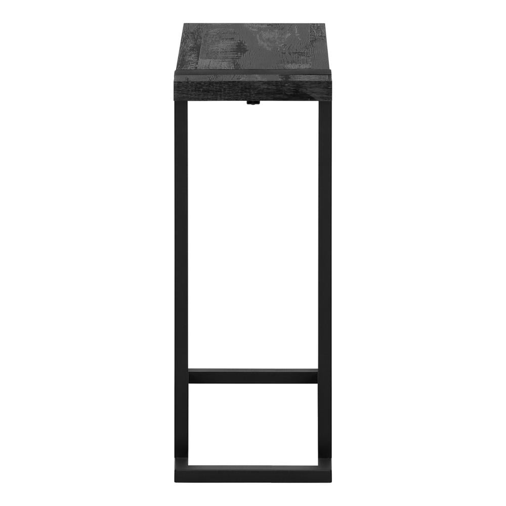 Accent Table, C-shaped, End, Side, Snack, Living Room, Bedroom, Black Laminate Industrial-farmhouse style combines modern metal with a rustic wood finish to create a warm inviting look. This C-shaped accent table embodies that popular style. The tabletop is finished in a black reclaimed-wood look with naturalistic color variations and a subtle wood-grain texture. The robust metal frame in a black finish is incorporated into the thick tabletop for a striking visual contrast and to provide stability. Lightweight and finished on all sides this C table can be slid under a sofa or chair in a living room or used as a side table in a bedroom. C-shaped accent table with a thick, rectangular tabletop in a black reclaimed wood-look finish Black metal frame provides stability and a modern touch Sturdy yet lightweight enough to be moved as needed in living rooms, bedrooms, or any room in need of a small table Assembly required: Illustrated instructions and all hardware are provided for convenience (additional tools may be needed) Product dimensions: 19.25 inches L x 9.5 inches W x 25 inches H – Material: Mdf,Hollow-Core,Laminate,Metal,Particle Board – Number of Pieces: 1 Pc – Style: Contemporary,Modern – Weight Capacity: 25 – Item Depth: 9.5 – Item Height: 25 – Item Dimensions: 9.5W x 19.25D x 25H – General Color: Black – FINISHED ON ALL SIDES: YES – ITEM 1LBS: 7 – ITEM 1LENGTH: 19.25 – Vendor Color: Black