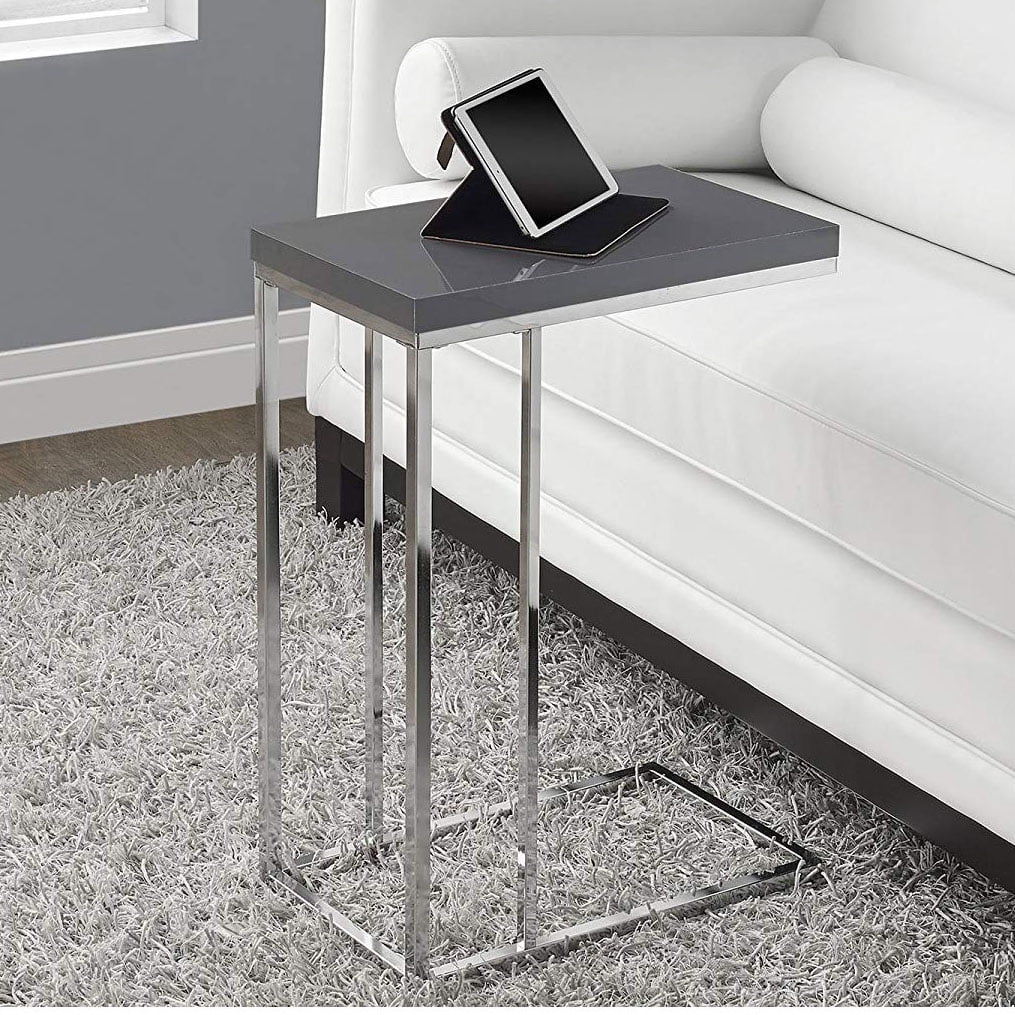 Elevate the modern tone of your living room, office space, family room or den with this stylish glossy grey and chrome metal C end table Use it conveniently as a snack table or sofa side table This C shape side table slips easily under your sofa, chair or bed and sits slightly off the ground to prevent damage to your floor Solid chrome metal base delivers optimal stability Product Dimensions: 18.25 Inch L x 10.25 Inch W x 25.25 Inch H