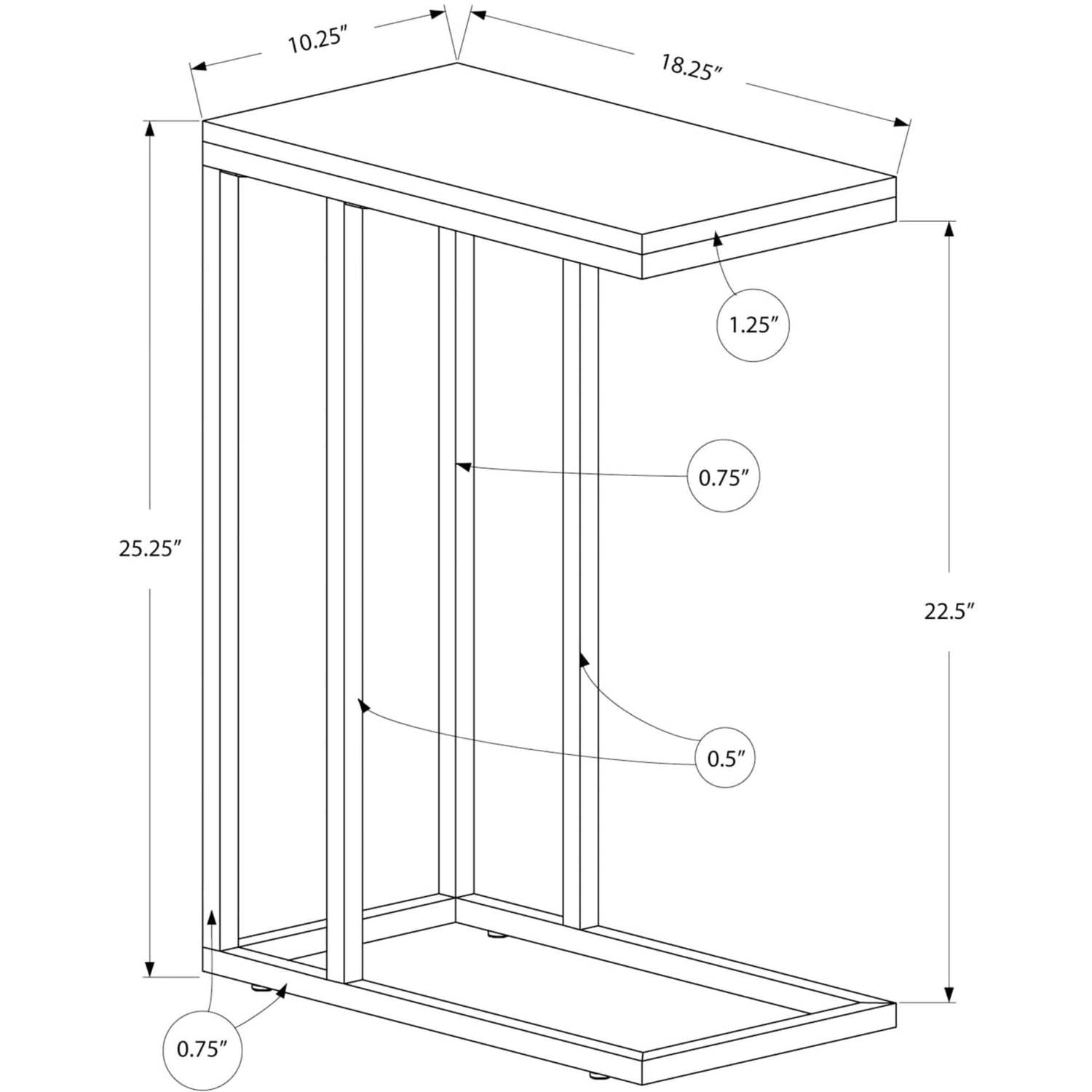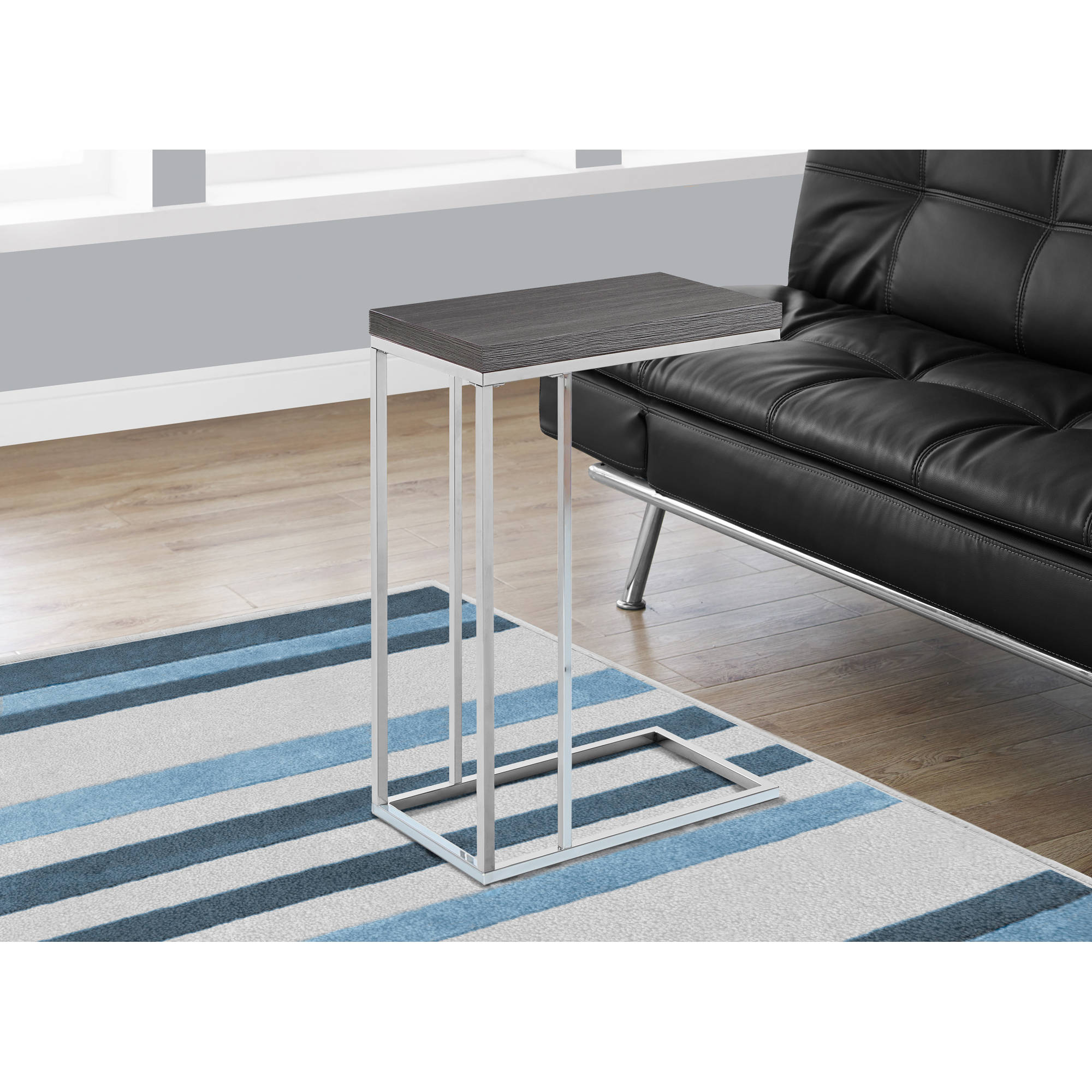 Bring a wood look tone to your living room, office space, family room or den with this stylish grey tone / chrome metal C end table Use it conveniently as a snack table or sofa side table With a trendy grey wood textured surface, this C shape side table slips easily under your sofa, chair or bed and sits slightly off the ground to prevent damage to your floor Solid chrome metal base delivers optimal stability Product Dimensions: 18 Inch L x 10 Inch W x 25 Inch H