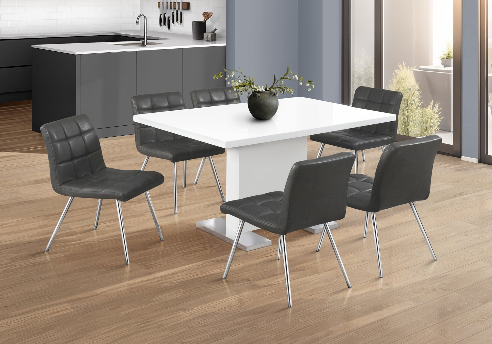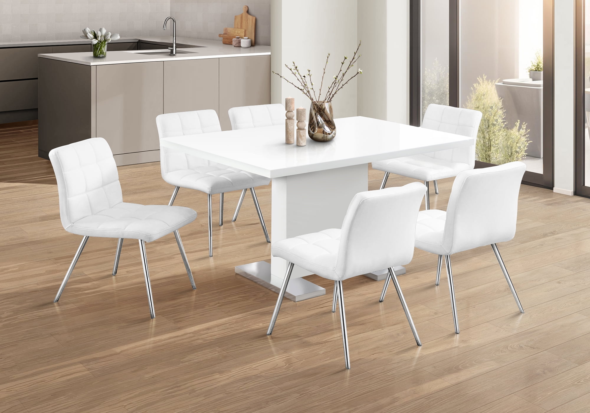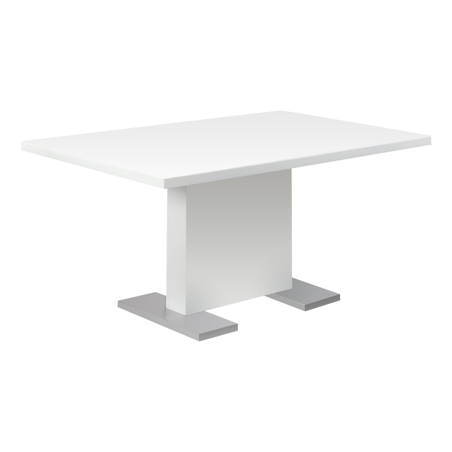 Finished in a modern glossy white color Ample table top surface space with a thick sturdy support Attractively accented with high shining chrome-look feet Looks great in a formal or casual dining space easily seating up to 6 people Mix and match with your favorite chair Color:White Shape:Rectangle Country Of Origin:China Product Dimensions(L x D x H):59″ x 35.5″ x 30″ Product Weight (Lb):94