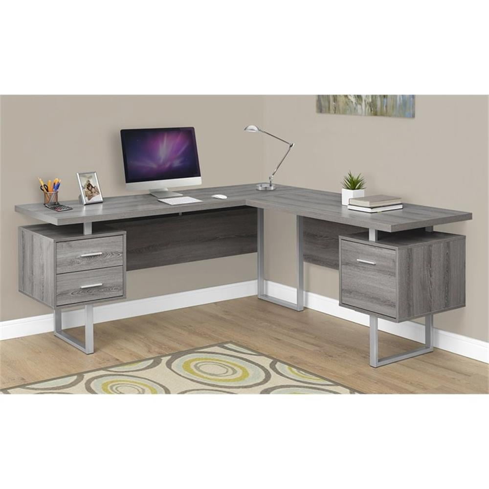 Spruce up your office or study with the perfect workspace for you and your computer L-shape goes great with a variety of contemporary, modern, and art deco stylings Ready to assemble with either a left or right side drawer configuration Features 3 large storage drawers for plenty of storage space Sturdy silver u-shaped metal legs provide maximum stability Specifications: Assembly time: 30 minutes Material: Hollow-core, laminate, MDF, metal Color: Taupe Dimensions (L x W x H): 71 x 71 x 30 inches Weight: 139 pounds Manufacturer warranty: 1-year warranty