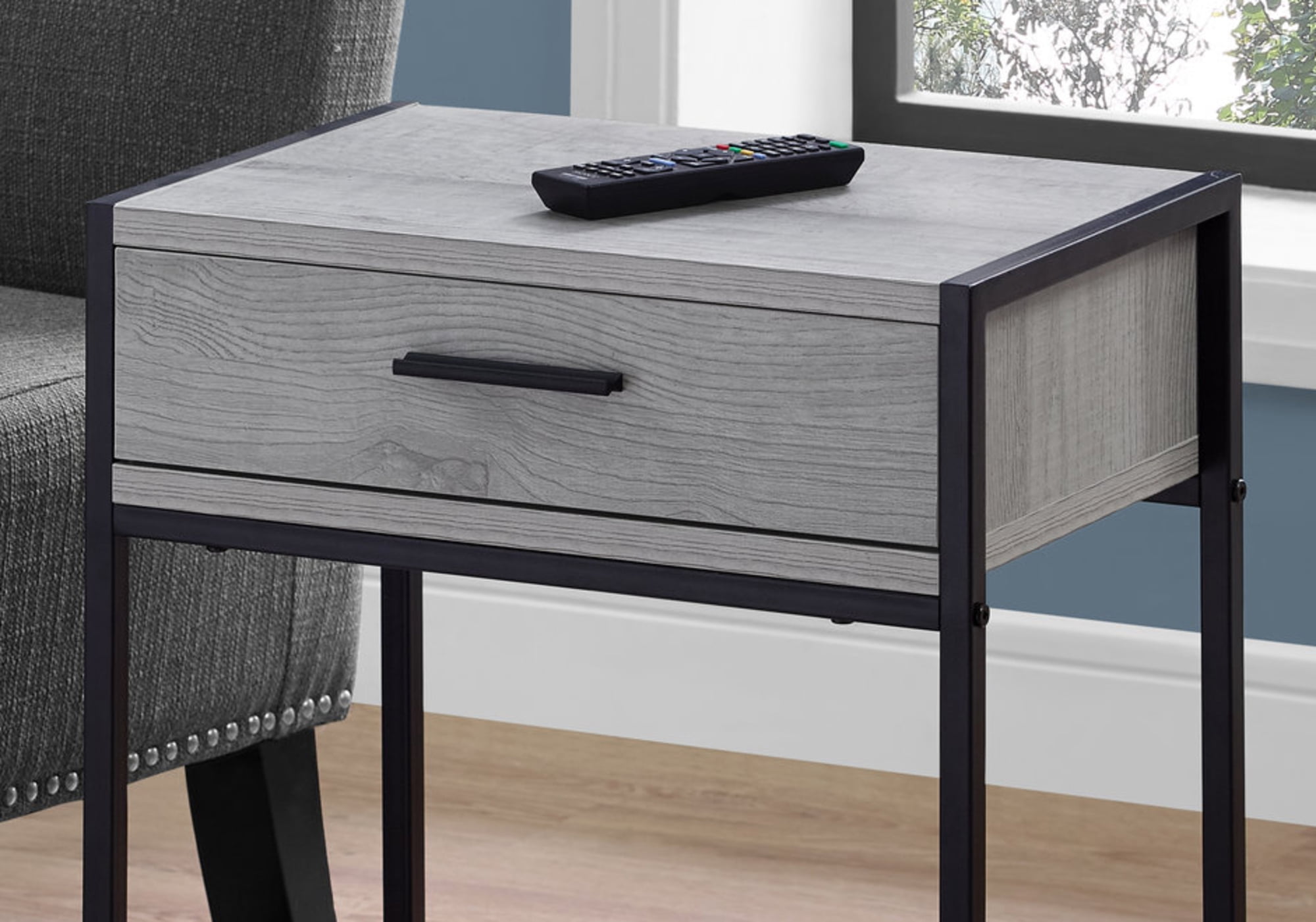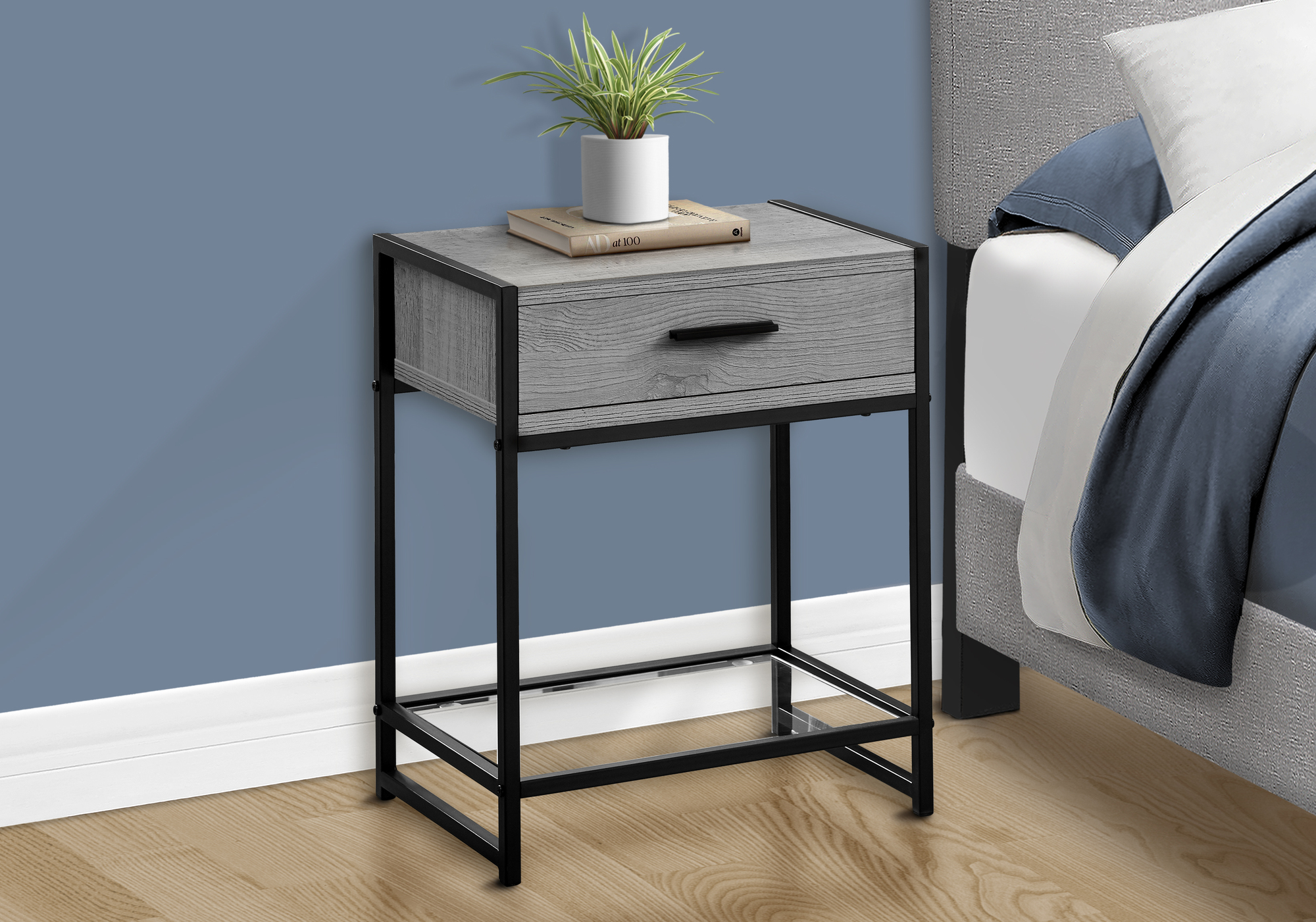 One storage drawer on metal glides with a sleek black metal handle Clear tempered glass bottom shelf for added storage or to showcase a decorative object Modern design with a stylish grey wood-grain finish Strong black metal frame Compact size and versatile to use as an end table or nightstand