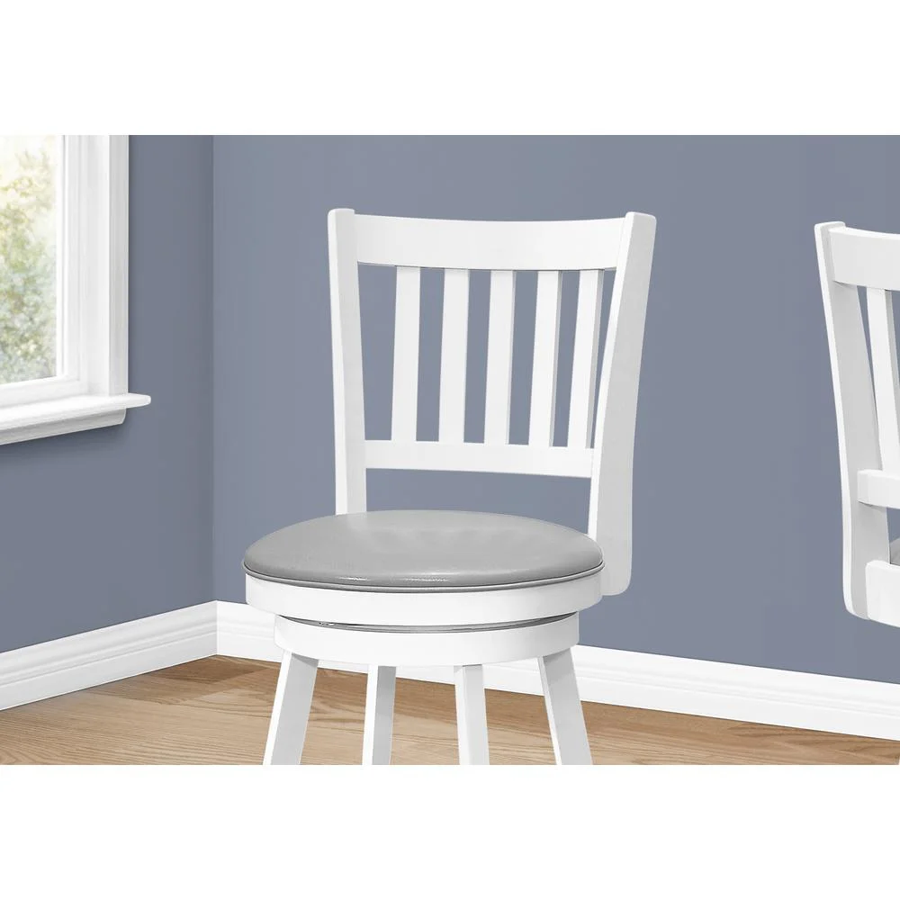 Bar Stool, Set Of 2, Swivel, Counter Height, Kitchen, White Wood These counter-height swivel barstools with backs have a style that is as timeless as it is versatile. Gently curved backrests offer support and feature a classic slat-back design. The seats are cushioned for a soft feel and upholstered in a smooth grey leather-look fabric. The round shape of the padded seats mirrors the ring-shaped footrests below that offer a place to relax your feet. Flared solid wood legs provide stability when the seats are rotated 360 degrees and are in the same crisp white finish as the backrests and footrests. Sold as a set of 2 these traditional barstools are a great choice for a kitchen island or casual dining areas with a counter-height table. Set of 2 counter-height barstools that swivel 360 degrees Round seats are upholstered in a grey leather-look fabric and padded for comfort Supportive, curved backrests with a slat-back design, sturdy solid wood legs, and convenient footrests are in a white finish Assembly required: Illustrated instructions and all hardware are provided for convenience (additional tools may be needed) Product dimensions: 17.5 inches L x 18.25 inches W x 38 inches H – Material: Solid Wood,Foam,Mdf,Veneer – Number of Pieces: 2Pcs Set – Style: Transitional – Weight Capacity: 200 – Set Type: Bar Stools – Item Depth: 18.25 – Item Height: 38 – Secondary Color: Grey – General Color: White – FINISHED ON ALL SIDES: YES – ITEM 1LBS: 18 – ITEM 1LENGTH: 17.5 – Vendor Color: White,Grey – Detailed Item dimensions: Item 1: 18.25W x 17.5D x 38H, Item 2: 18.25W x 17.5D x 38H
