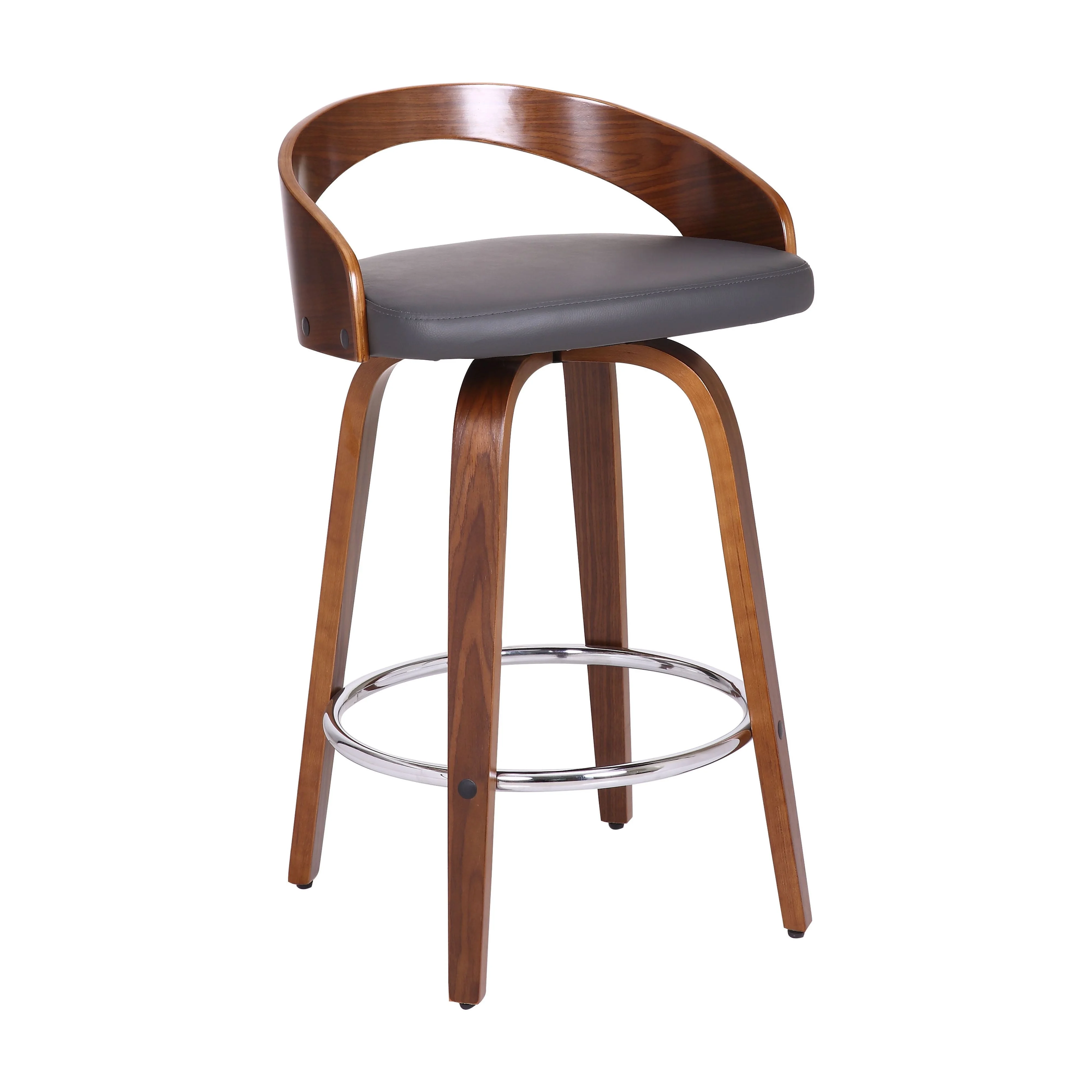 Set of 2 counter-height barstools that swivel 360 degrees Round seats are upholstered in a grey leather-look fabric and padded for comfort Supportive, curved backrests with a slat-back design, sturdy solid wood legs, and convenient footrests are in a white finish Assembly required: Illustrated instructions and all hardware are provided for convenience (additional tools may be needed) Product dimensions: 17.5 inches L x 18.25 inches W x 38 inches H