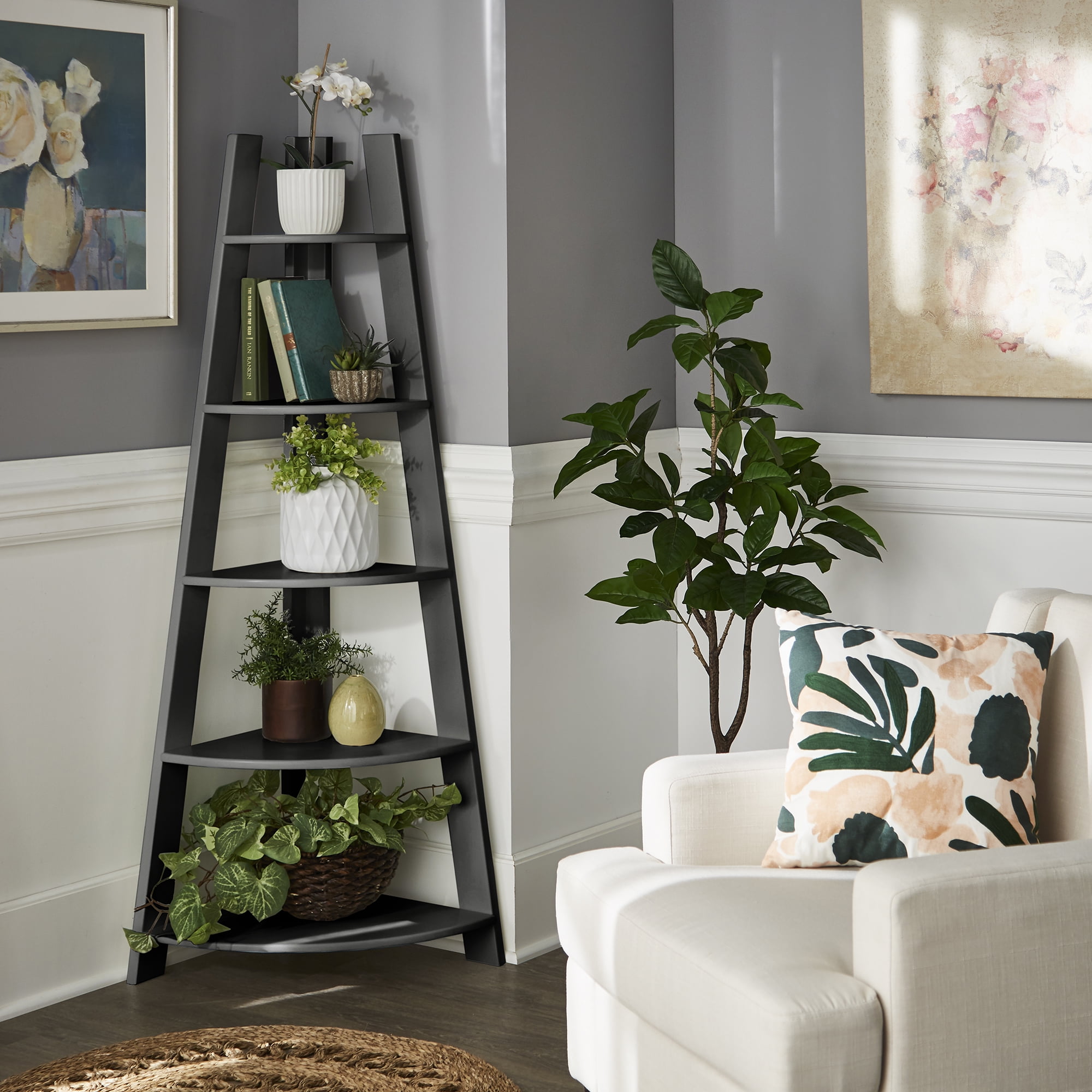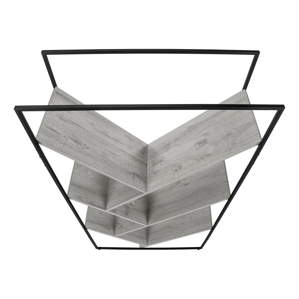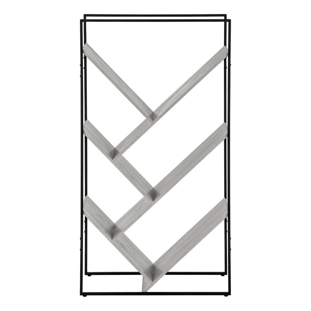 Look at storage from a different angle with this unique bookcase. Slanted shelves in a smooth, gray wood-look finish create eye-catching geometric angles that form V-shaped display areas in different sizes. The sleek shelving, supported by a black metal frame, give this 5-tier bookshelf a trendy urban style. Finished on all sides, this striking etagere with open shelves will become the center of attention in any room. Features: 5-tier etagere bookshelf with slanted shelves that form V-shaped storage areas in multiple sizes Open shelves are finished on all sides in a smooth, gray wood-look finish Slim black metal frame Assembly required Specifications: Product Dimensions: 60.25″ H x 32.00″ W x 12.00″ D Product Weight: 32 lbs Assembly Required: Yes