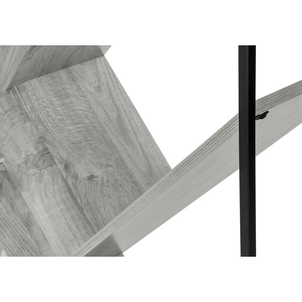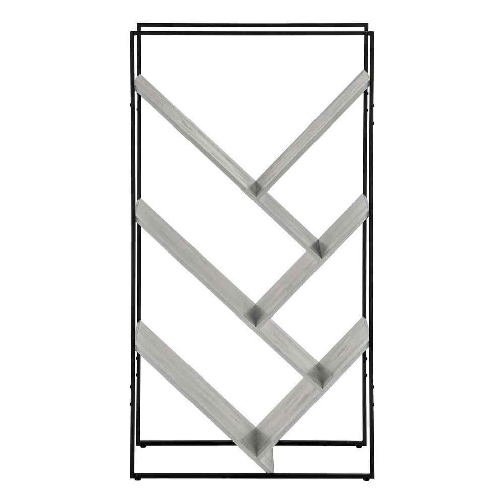 5-tier etagere bookshelf with slanted shelves that form V-shaped storage areas in multiple sizes Open shelves are finished on all sides in a smooth, gray wood-look finish Slim black metal frame Assembly required
