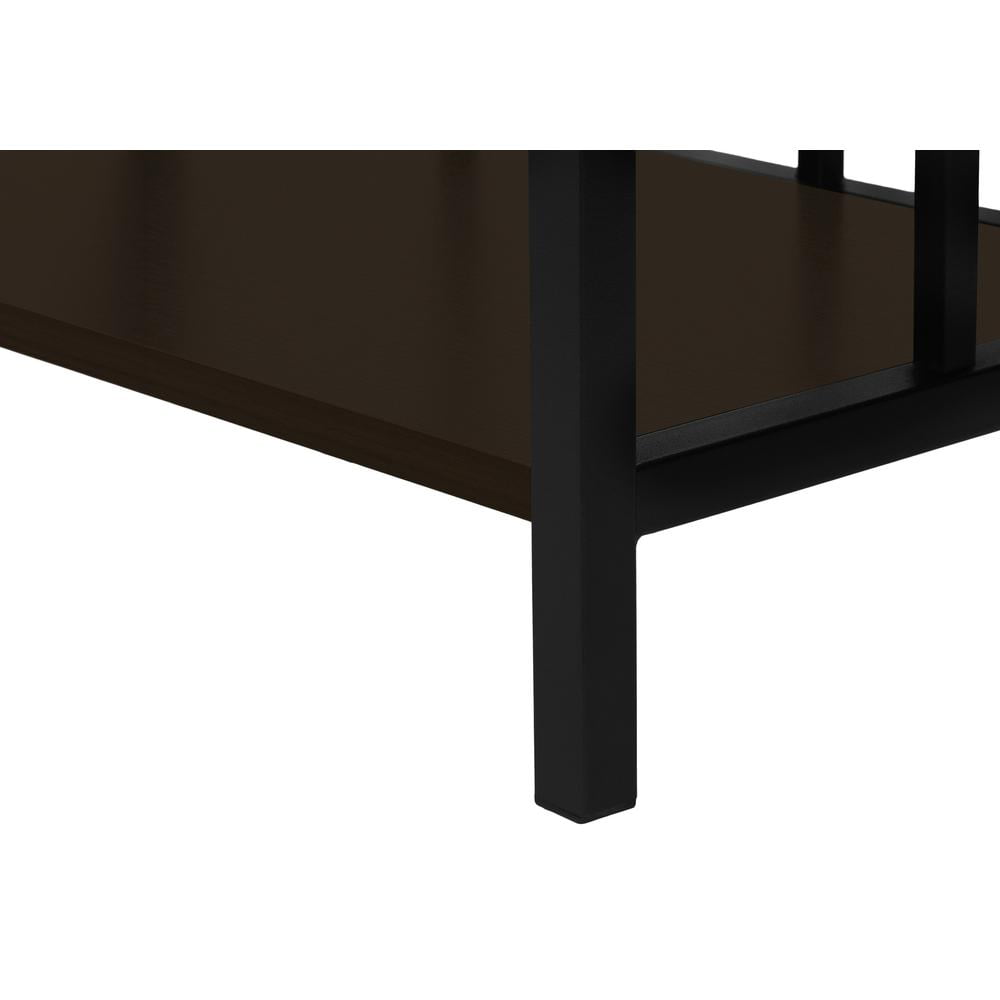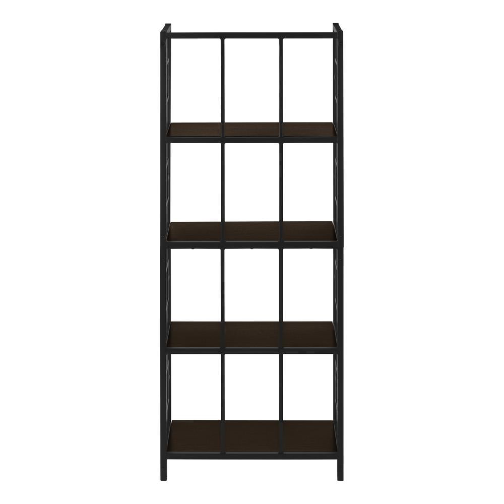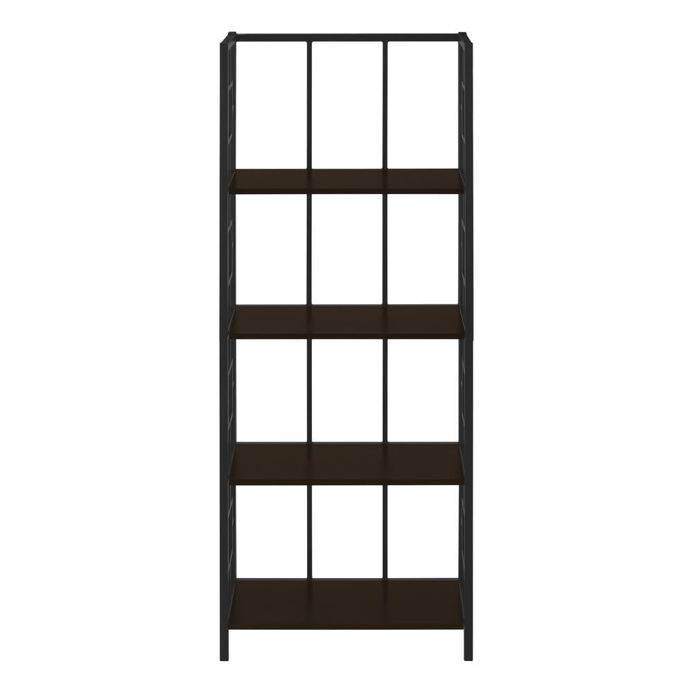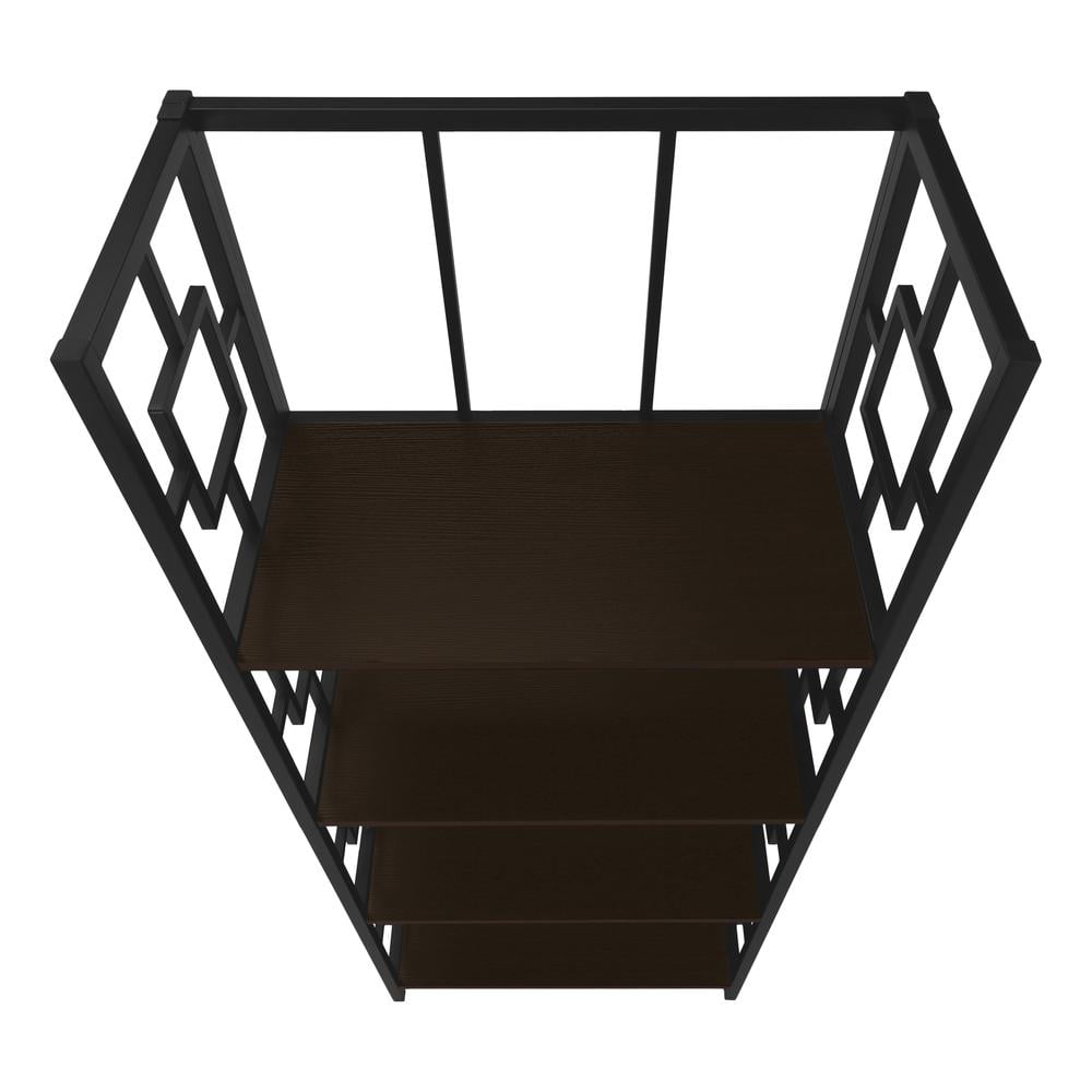 Finish: Black and Espresso Materials: Metal, and Particle Board Style: Transitional 4 Tier metal etagere bookshelf with large evenly-spaced storage shelves finished in dark brown Perfect space-saving narrow tall display unit for photo frames, books, or even kitchen accessories Featuring a solid black metal frame, this open bookcase with laminate open shelf will be a favorite in any house, apartment or condo A stylish transitional design for living room office or bedroom