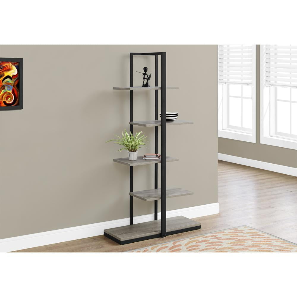 Impressive asymmetrical zig-zag style bookcase with 5 taupe wood look display shelves for your favorite decorative items Solid black metal base solidifies this structurally-sound accent piece for your living room, entrance, bedroom or office Modern industrial bookshelf in an open concept design is ideal in small homes, condos or apartments Pair it with many matching pieces (sold separately) to complete the collection Product Dimensions: 32 Inch L x 13 Inch D x 60 Inch H
