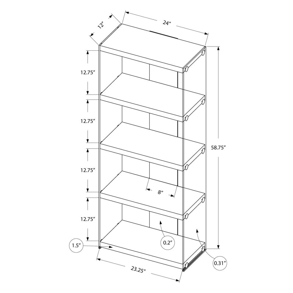 Featuring 4 fixed display shelves and chic tempered glass sides that create an inviting look, making your room appear more spacious Finished on all sides in dark taupe wood-look, this accent display case is a great way to show off your books, favorite decor items or electronics Polished chrome accents provide added elegance to complement any home or office space; bookshelf also includes rear glass panel for sturdiness This wood look 5 tier bookcase takes advantage of height to offer a generous amount of storage space in small homes, apartments or condos