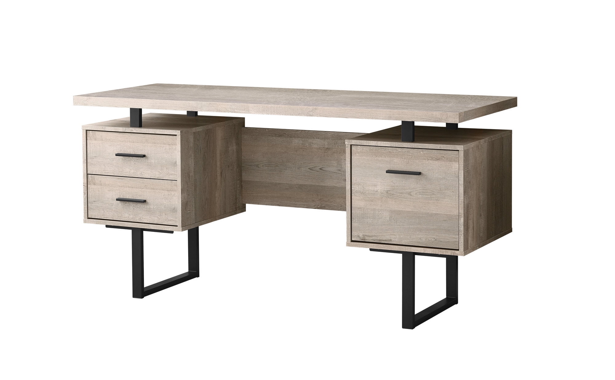 Computer desk with 3 storage drawers and a large, thick-panel floating desktop in a taupe reclaimed wood-look finish Reversible configuration allows the 2 small drawers and 1 file drawer to be installed on either side as desired Drawer handles, desktop supports, and sturdy U-shaped metal legs are in a contrasting black finish