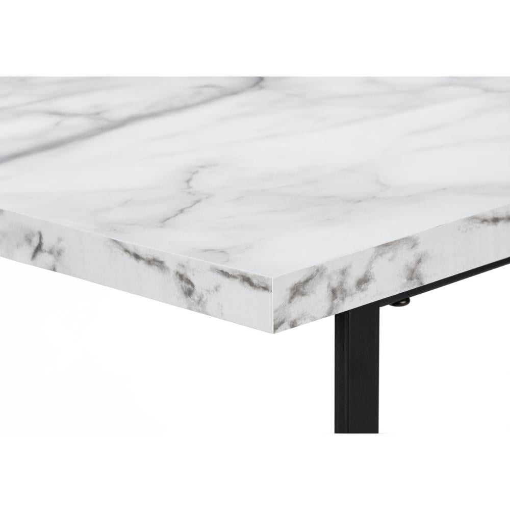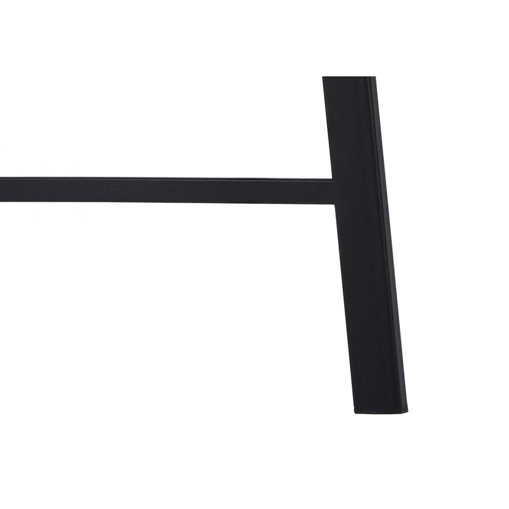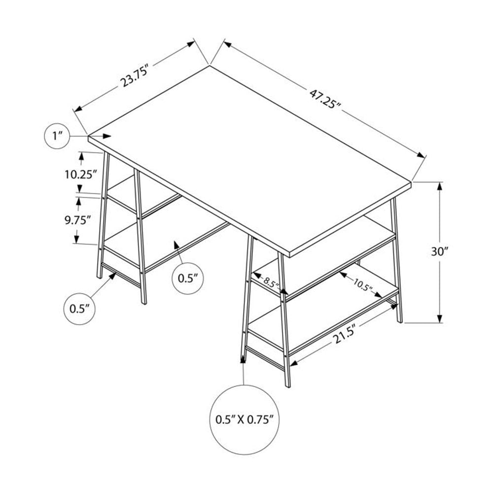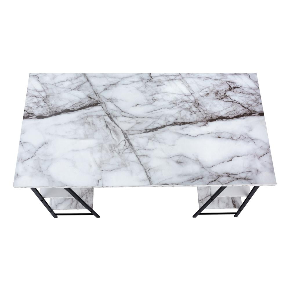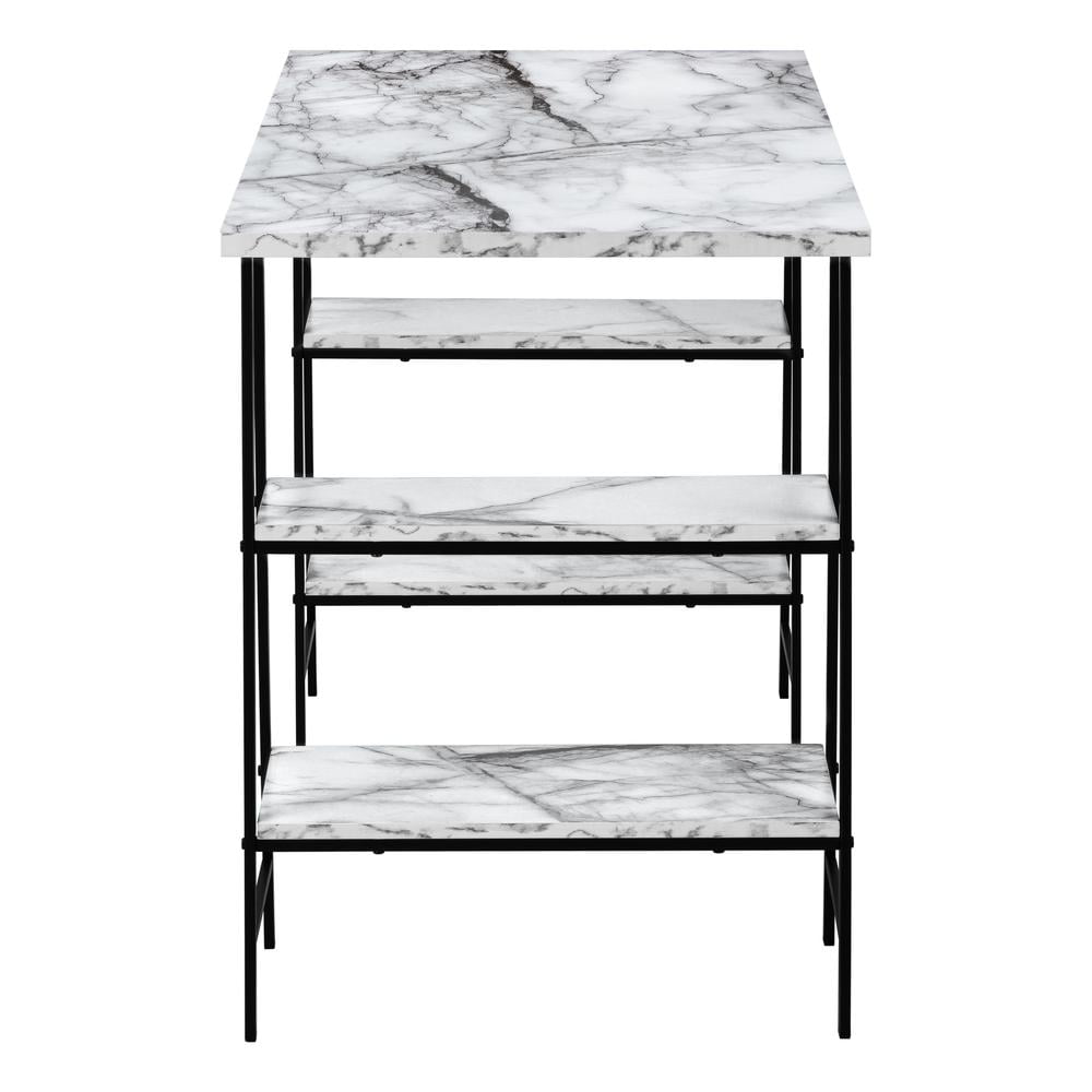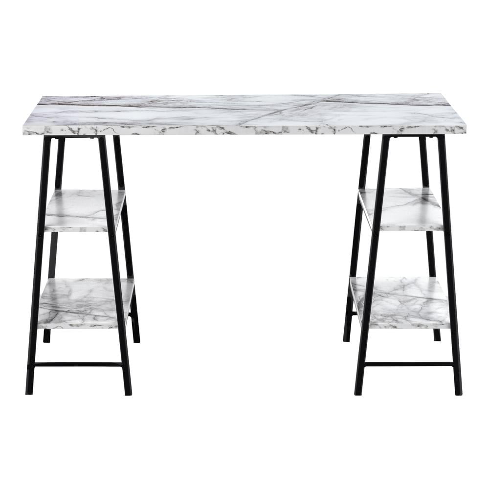 Materials: Metal, particle board Industrial-style computer desk with 4 fixed, open shelves supported by sawhorse-style legs in a black metal finish Thick, rectangular desktop and 4 shelves in 2 different sizes are finished in a non-glossy, white marble-look finish Great for small workspaces in need of storage options, this 3-tier writing desk has a space-saving, open-concept design and is finished on all sides for flexible placement anywhere in your home office
