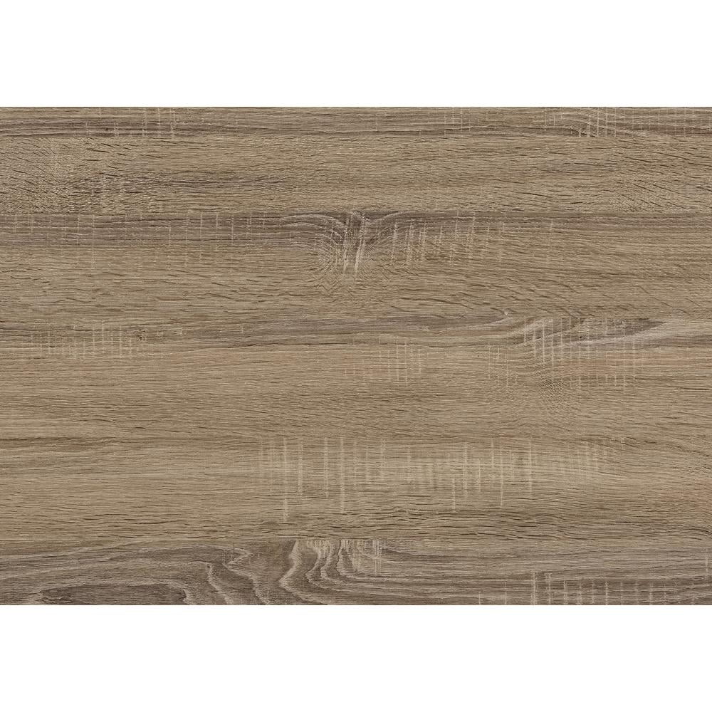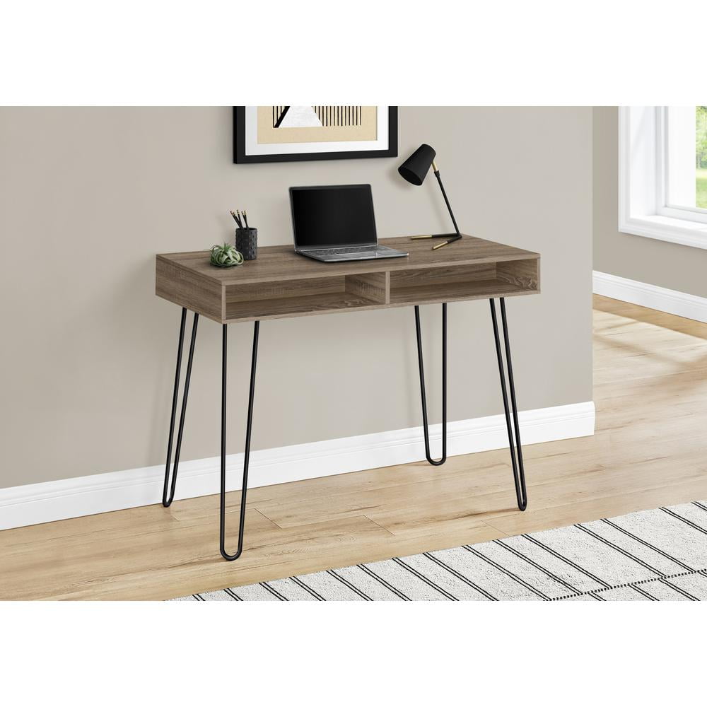 Materials: Particle board, metal Finish: Dark taupe, black Computer desk in a dark taupe wood-look laminate finish featuring 2 open storage cubbies Metal base featuring black metal hairpin leg for maximum stability Finished on all sides for flexible placement anywhere in your workspace Assembly required: Illustrated instructions and all hardware are provided for convenience (additional tools may be needed)