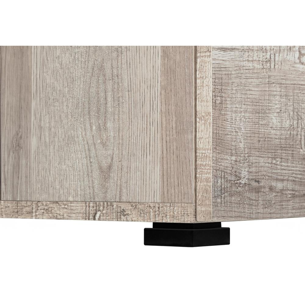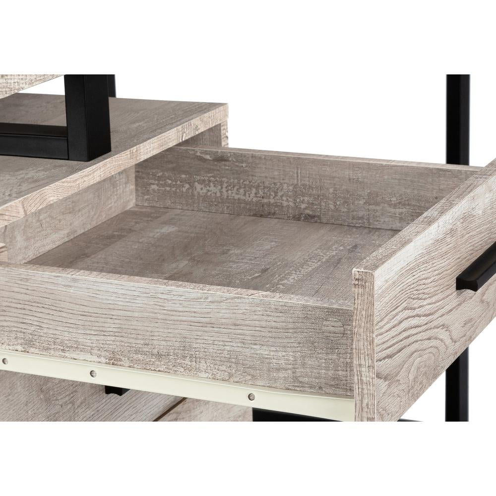Computer desk with 2 small drawers, 1 file drawer, and a thick-panel floating desktop in a taupe reclaimed wood-look finish The 3 storage drawers can be installed on the left or right side as desired Drawer handles, desktop support, and sturdy U-shaped metal leg are in a contrasting black finish