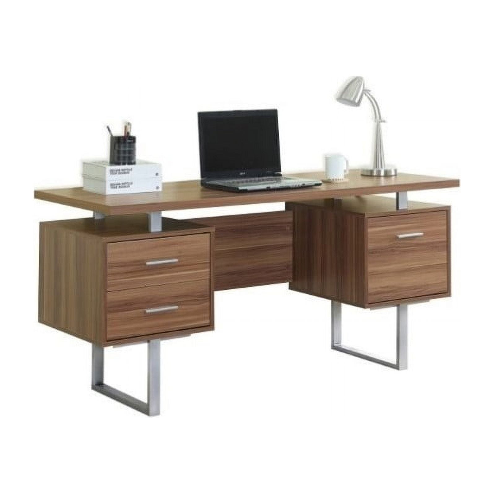 Feel like a boss in your home office when you sit down to work at this mid-size computer desk with 3 storage drawers. The thick-panel floating desktop provides generous room for a laptop and writing materials, and allows you to use the tops of the drawer units as extra surfaces. Finished in the same walnut wood-look laminate as the desktop, 2 small drawers and 1 large drawer with a bar for hanging files offer space for items you want to keep off the work surface. For flexibility, the drawer units are reversible and can be installed on either side according to your preference. Supporting the desk are metal legs in a silver finish with a modern, stylish U shape. Features: Finish: walnut Includes 2 drawers and 1 filing drawer Large floating top work surface Silver colored hardware Sleek silver track metal legs Specifications: Product Dimensions: 30″ H x 60″ W x 24″ D Product Weight: 99 lbs