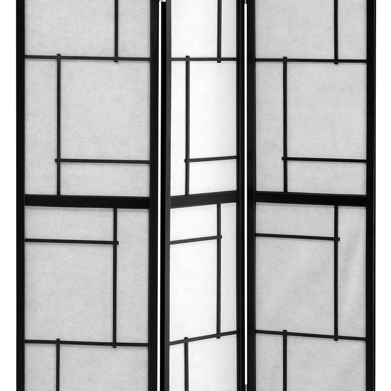Includes: One (1) folding screen Panel: White paper Finish: Black Materials: Pine, Wood Japanese style three panel screen with modern linear design Wood frame in black finish White paper panels FSC certified wood frame Frame construction: 3 panels Undercoat: 1 layer