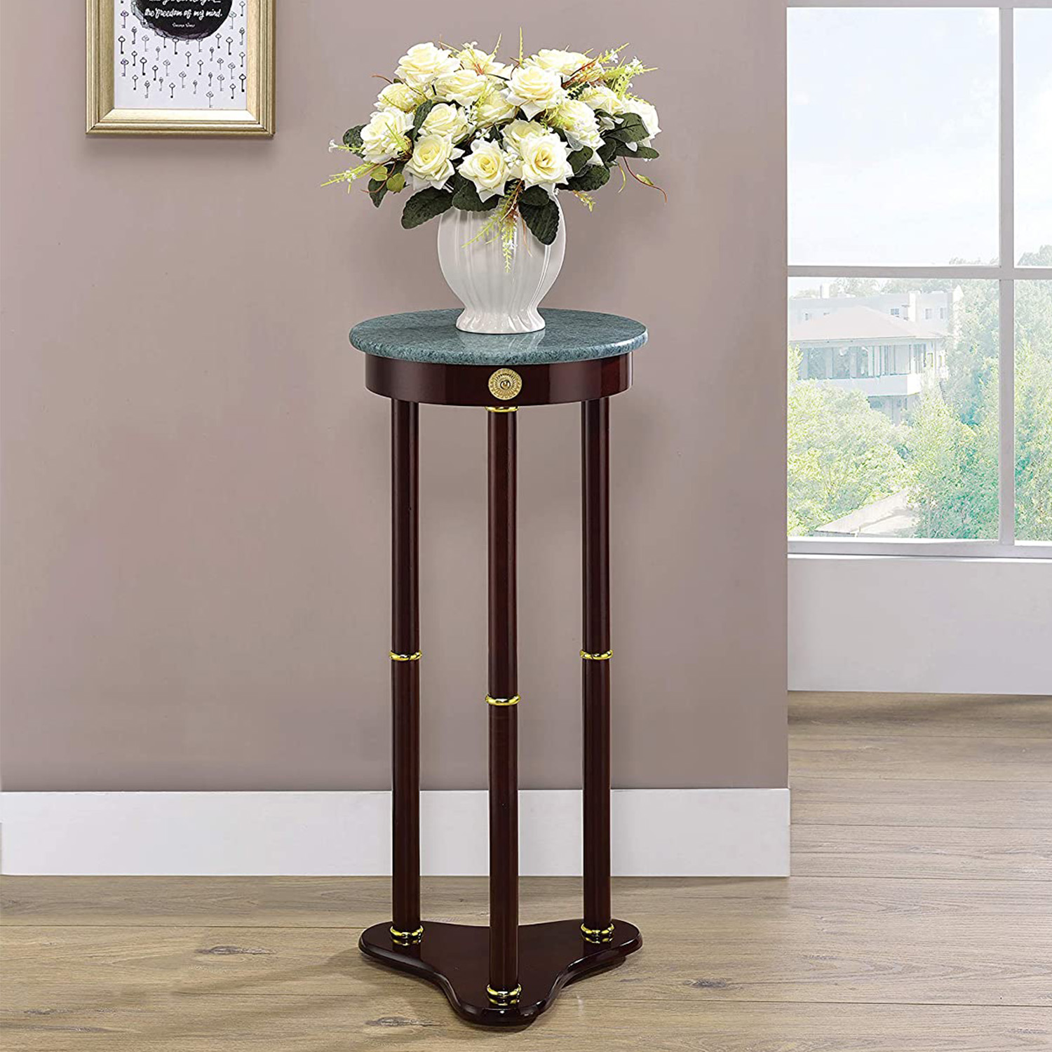 Modern accent table provides a decorative space to display potted plants or rest snacks, drinks, books, and more next to chairs or beds Wooden spinner-like base and 3-pronged legs bring an elegant feel to any space in your home Rich merlot wood finish, a round green marble tabletop, and 3-corner design show class Ideal for use in bedrooms, living rooms, sitting areas, and offices Assembly is required before use in your home or office space Weight limit: 13.20 pounds Set includes: One (1) accent table Material: Wood Color: Merlot and green Dimensions (L x W x H): 12.00 x 12.00 x 27.50 inches Weight: 8.80 pounds