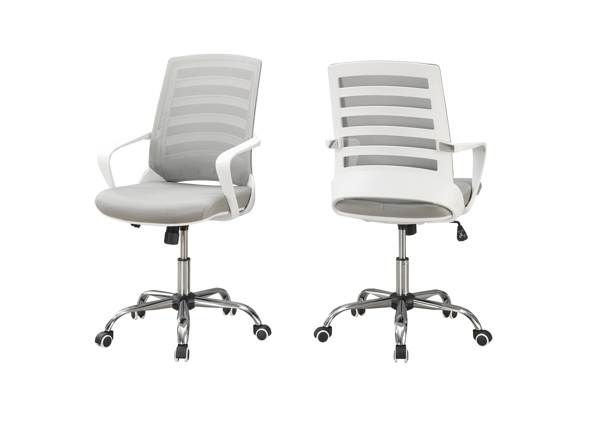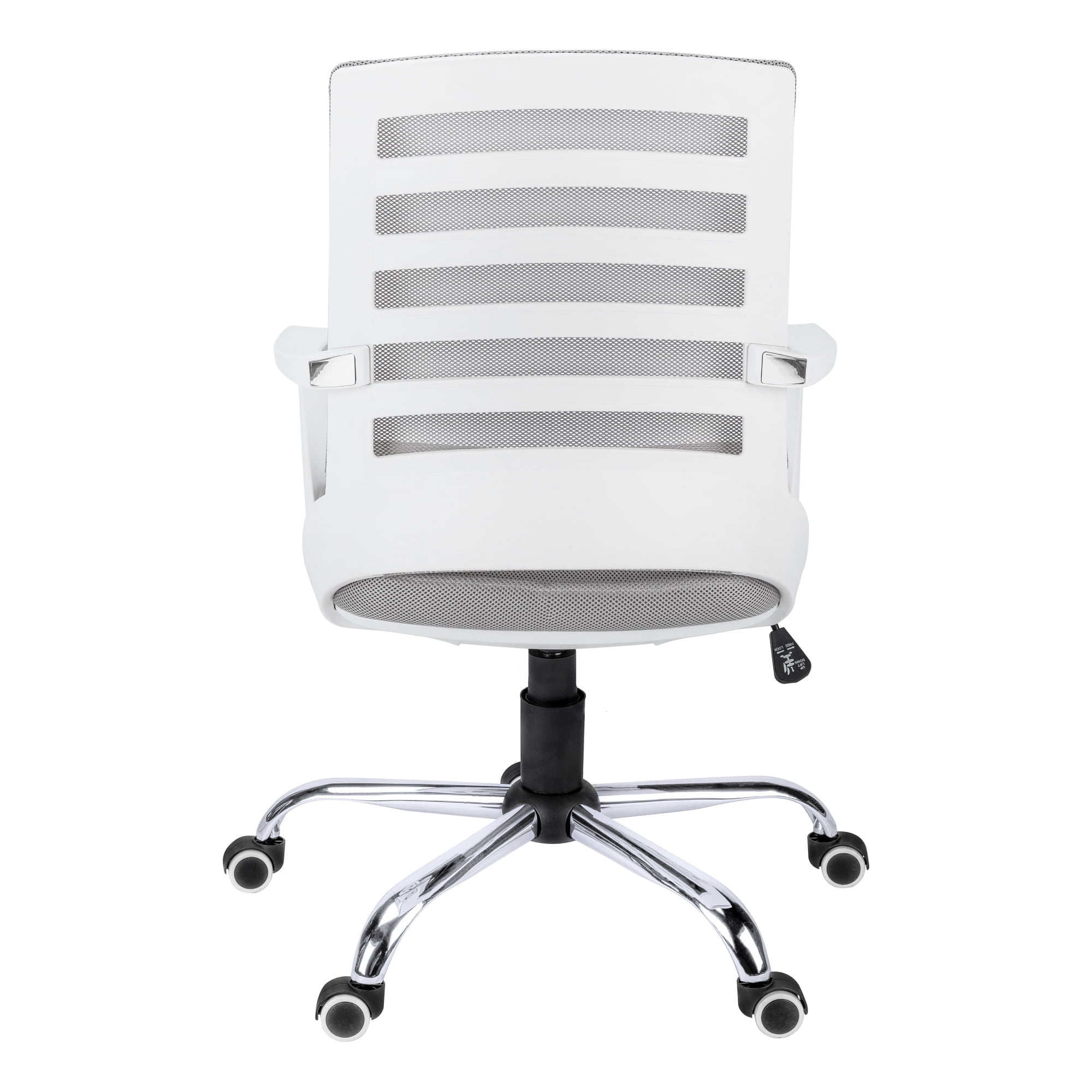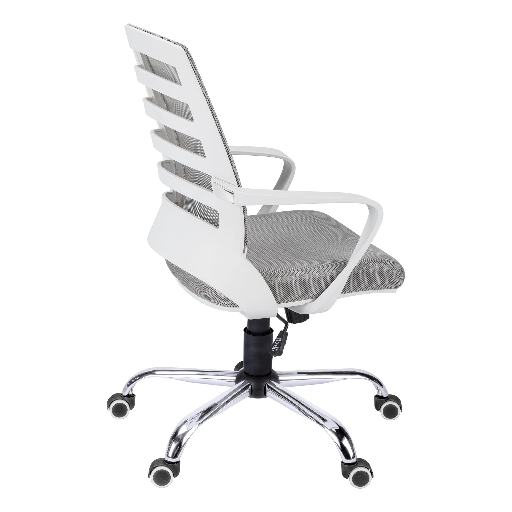 Mid-back office chair with fixed armrests in white, ladder-back design on the backrest exterior, and breathable, polyester mesh fabric in grey Ergonomically designed, curved backrest provides superior support and deep, extra-wide seat that is generously padded delivers outstanding comfort 360-degree swivel seat and 5-star chrome metal base with hooded casters offer mobility, while an adjustable height mechanism with tilt-back/lock-in control allows the chair to be optimized for the sitter