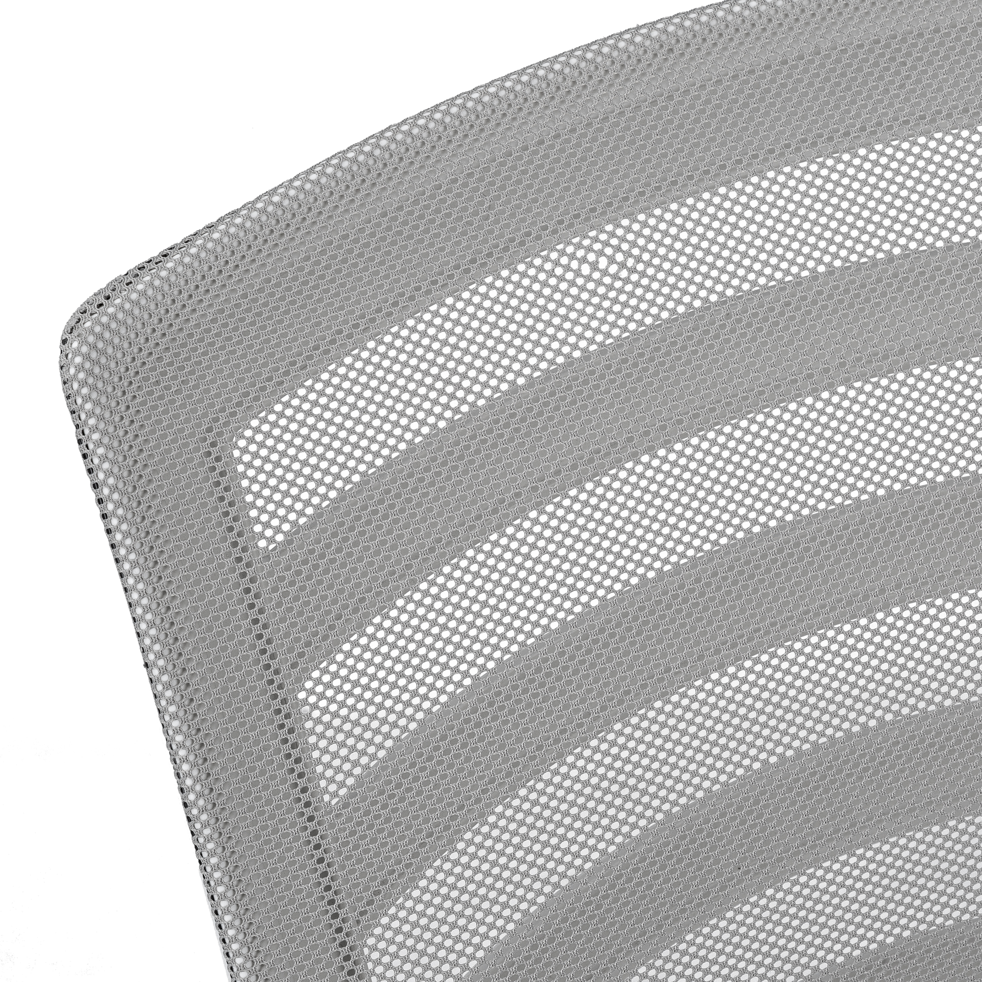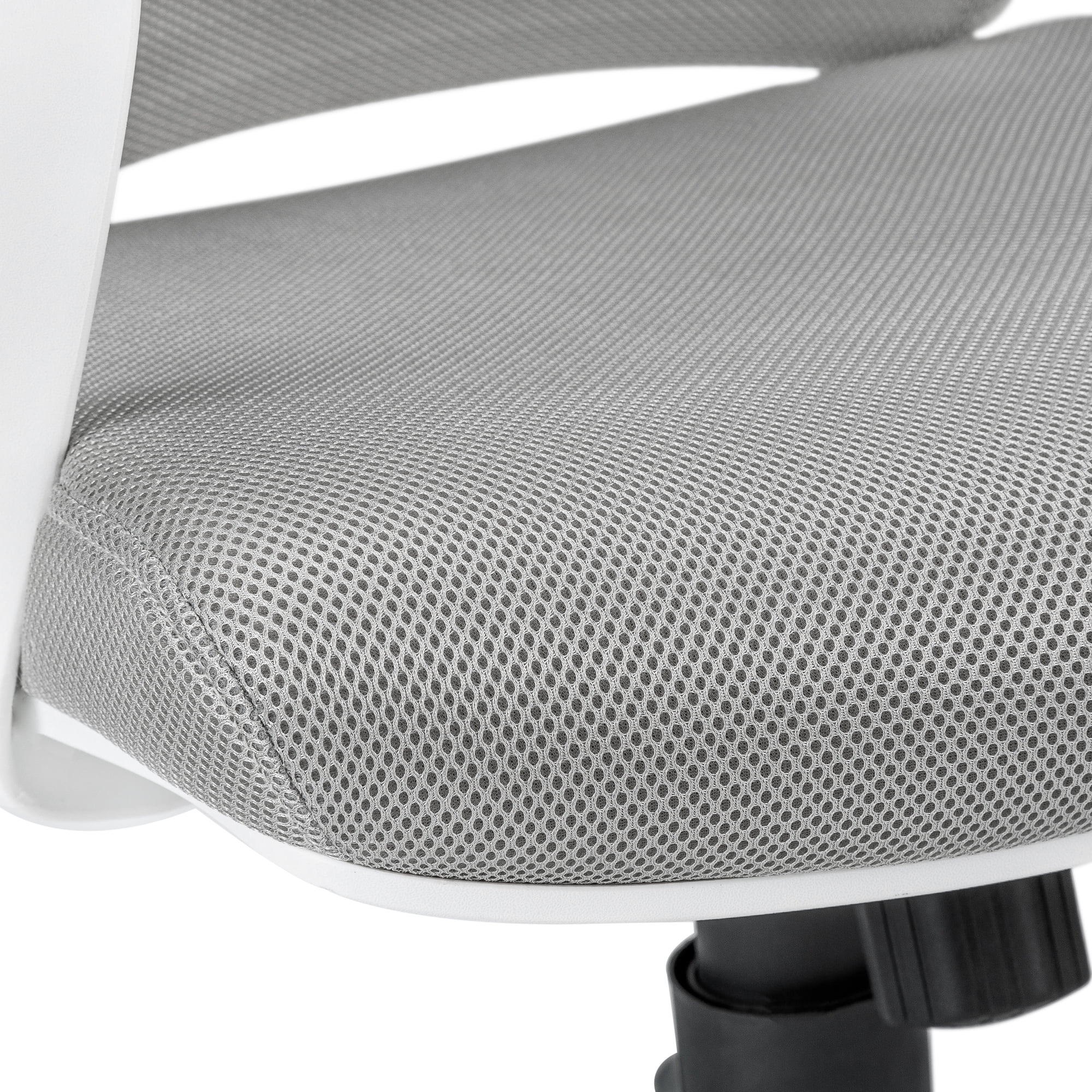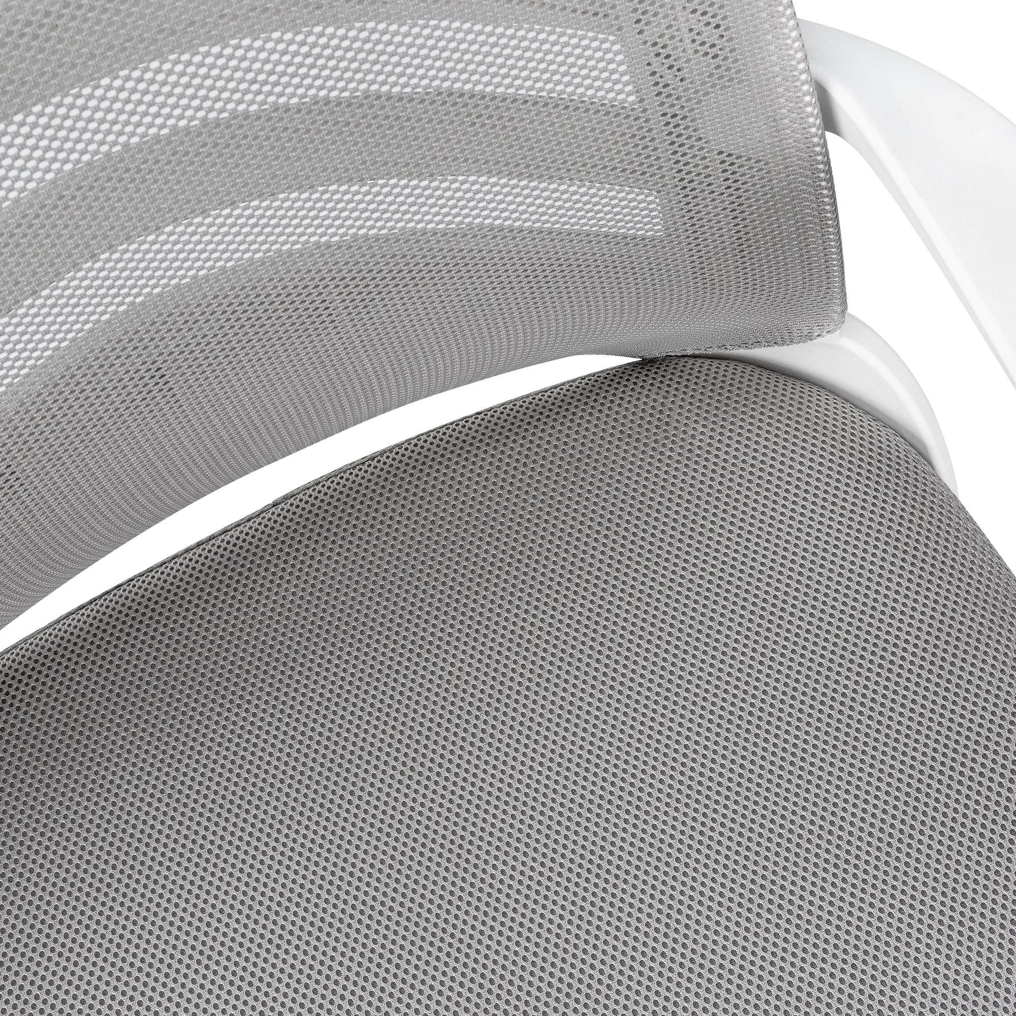 Mid-back office chair with fixed armrests in white, ladder-back design on the backrest exterior, and breathable, polyester mesh fabric in grey Ergonomically designed, curved backrest provides superior support and deep, extra-wide seat that is generously padded delivers outstanding comfort 360-degree swivel seat and 5-star chrome metal base with hooded casters offer mobility, while an adjustable height mechanism with tilt-back/lock-in control allows the chair to be optimized for the sitter
