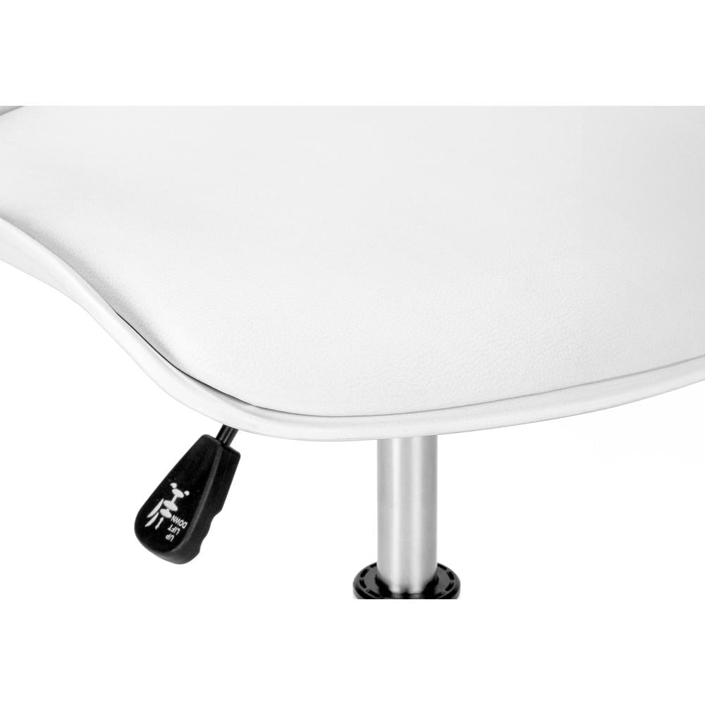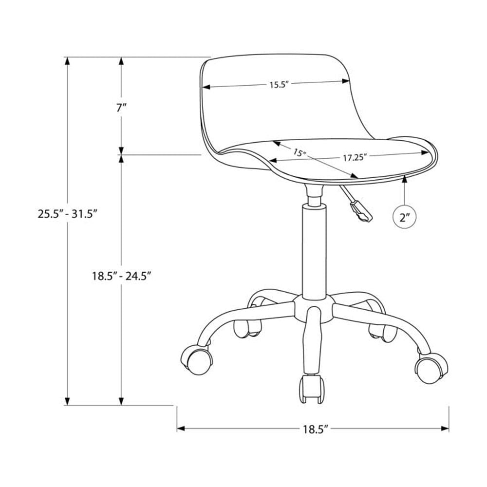 Sized especially for kids, this small desk chair will provide your child with a supportive, comfortable place to sit when they work and play. It features ergonomic design with a lowered back rest to promote good posture and a padded seat with a soft feel. A convenient lever underneath the seat allows the chair to be adjusted to the best height for your child’s size. A swivel seat and a stable, 5-star base with casters that roll smoothly in all directions make moving the chair easy and fun! You and your child will give this juvenile, low-back office chair in white with a white metal base good grades for its support, comfort, and functionality. Features: Materials: Metal, foam, polypropylene, polyurethane Finish: White Low-back office chair for kids in white with a white metal base Ergonomically designed backrest curves and is extra-wide to provide superior lower back support and the seat is padded for comfort 360-degree swivel seat and white 5-star base with hooded casters offer mobility, while an adjustable height mechanism allows the chair to be optimized for your child’s size Assembly required: Illustrated instructions and all hardware are provided for convenience (additional tools may be needed) Specifications: Product Dimensions: 25.5″H x 18.5″W x 18.5″D Product Weight: 12 lbs