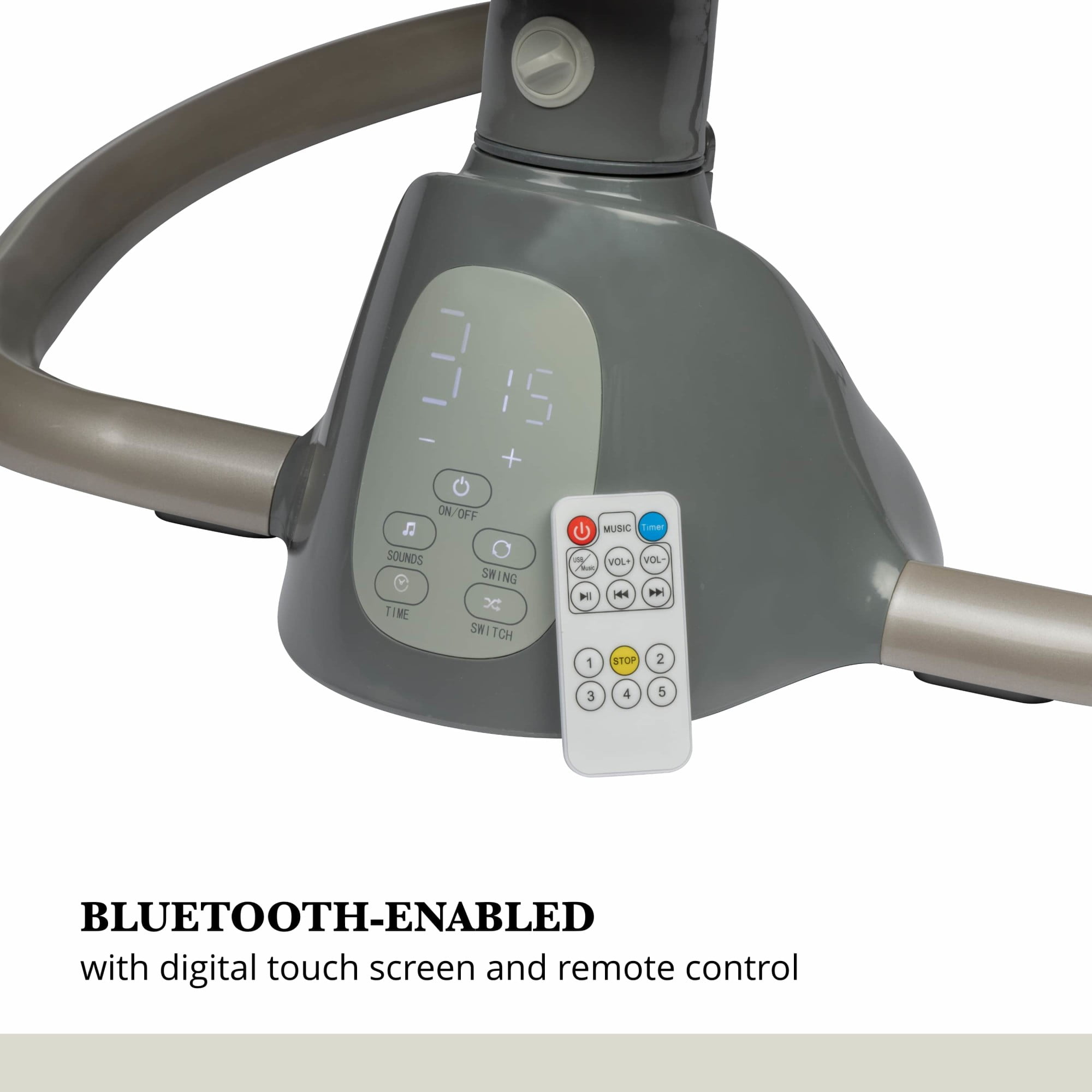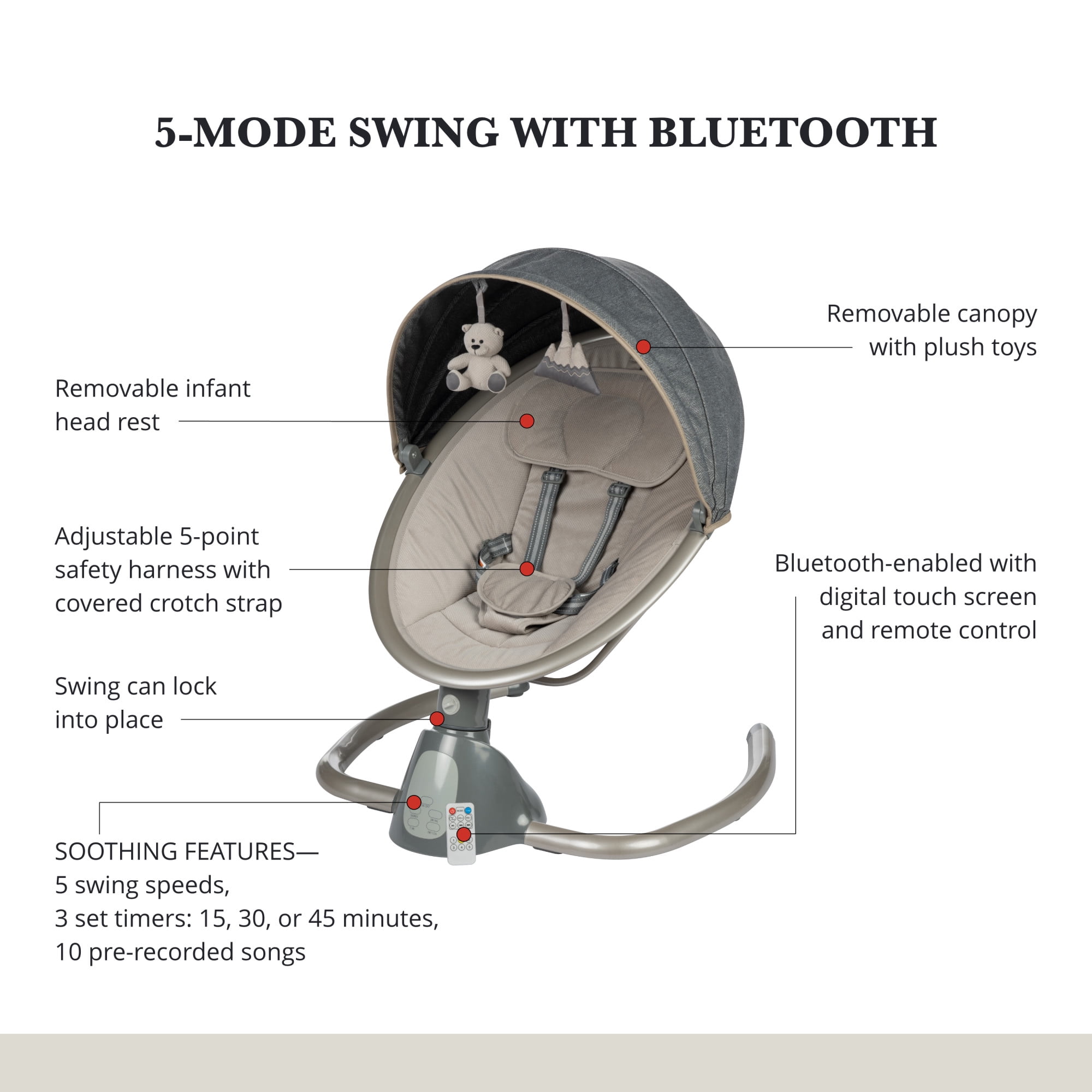 Monbebe 5-Mode Baby Swing with Bluetooth, Castle Point Bluetooth®-enabled with digital touch screen and remote control 5 swing speeds 3 set timers: 15, 30, or 45 minutes 10 pre-recorded songs Removable infant head rest Adjustable 5-point safety harness with covered crotch strap Swing can lock in place Removable canopy with plush toys Deep seat for baby’s comfort Powered by AAA batteries (not included) or AC adaptor Use from birth to approximately 9 months or up to 25 lbs. The Bluetooth® word mark and logos are registered trademarks of Bluetooth SIG, Inc. Other trademarks and trade names are those of their respective owners.