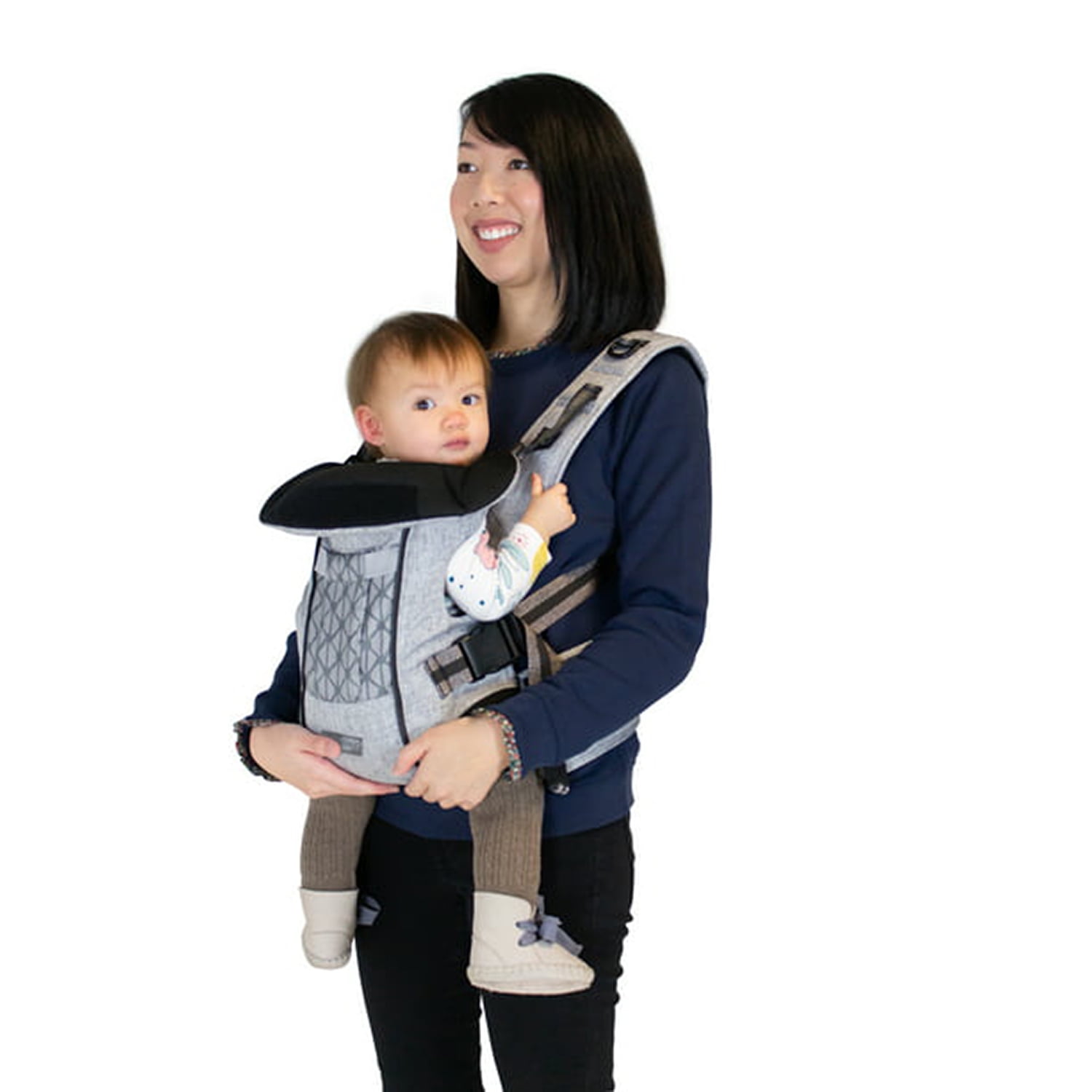 Six carrying positions: Front carry facing in/head support up Front carry facing in/head support down Front carry facing out/head support down Front carry facing out/head support up Back carry facing in/head support up Back carry facing in/head support down Adjustable memory foam shoulder straps Adjustable waist straps Padded head support and adjustable leg openings for baby Breathable mesh lining Generous storage pockets for essentials Machine washable For babies from 7 to 40 lbs
