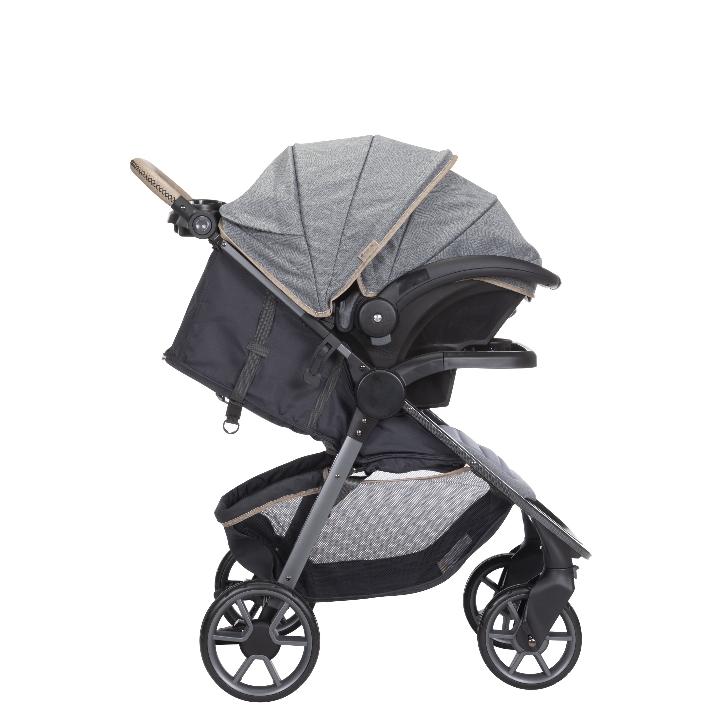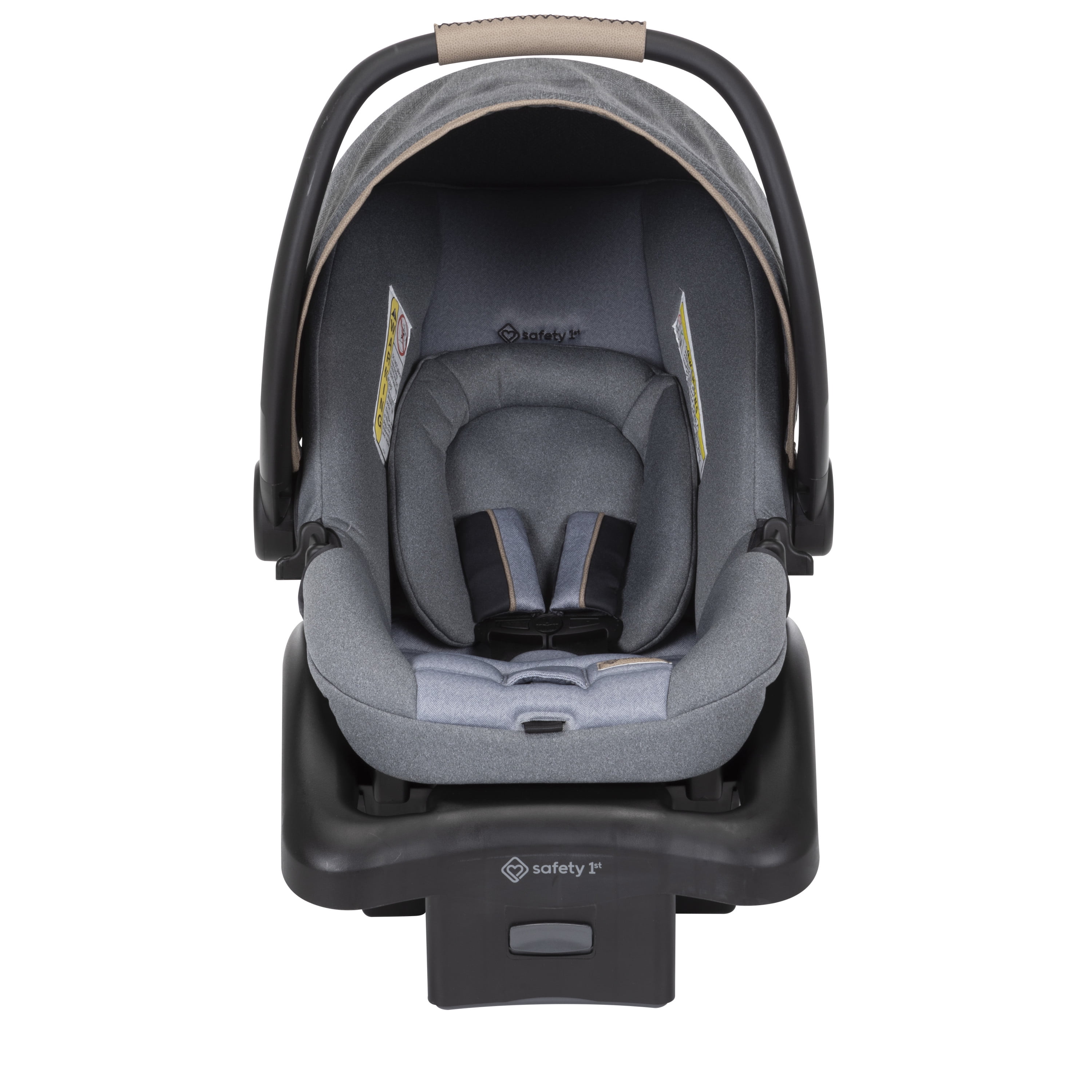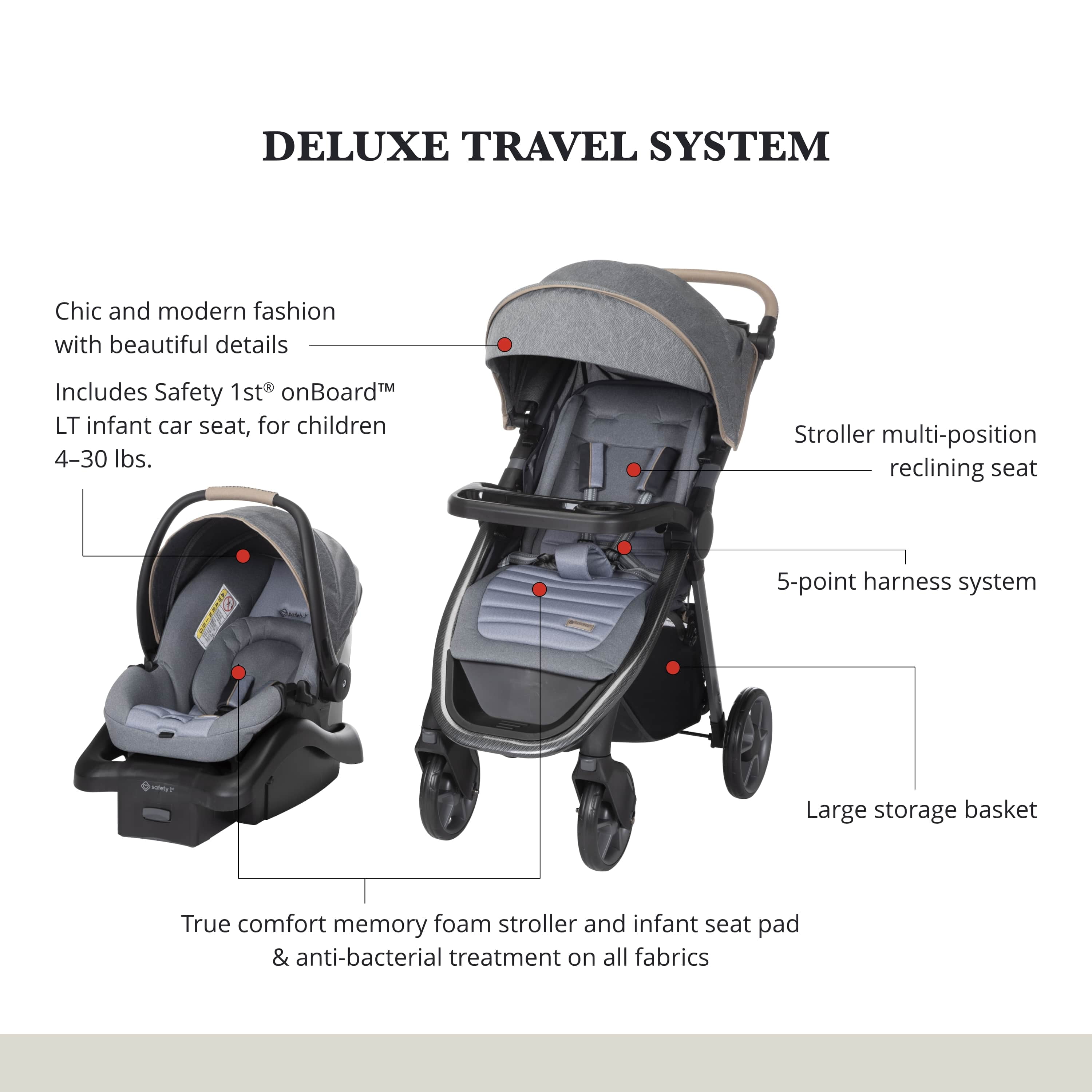 Memory foam on both the stroller and infant seat pad Anti-bacterial treatment on all fabrics as well as both the stroller and car seat handles Stroller multi-position reclining seat and 5-point harness system Plenty of stroller storage with oversized basket and covered handlebar compartment Chic, modern aesthetic with beautiful details Adjustable handle with faux-leather grip Includes Safety 1st® onBoard™ LT infant car seat for children 4–30 lbs. Extra-large sun canopy with extendable visor with peekaboo window for ventilation Large removable child tray with easy-to-clean glossy interiors and cup holder grips Dual parent cup holders Front wheel locks for greater stability Each stroller accommodates children up to 50 lbs.