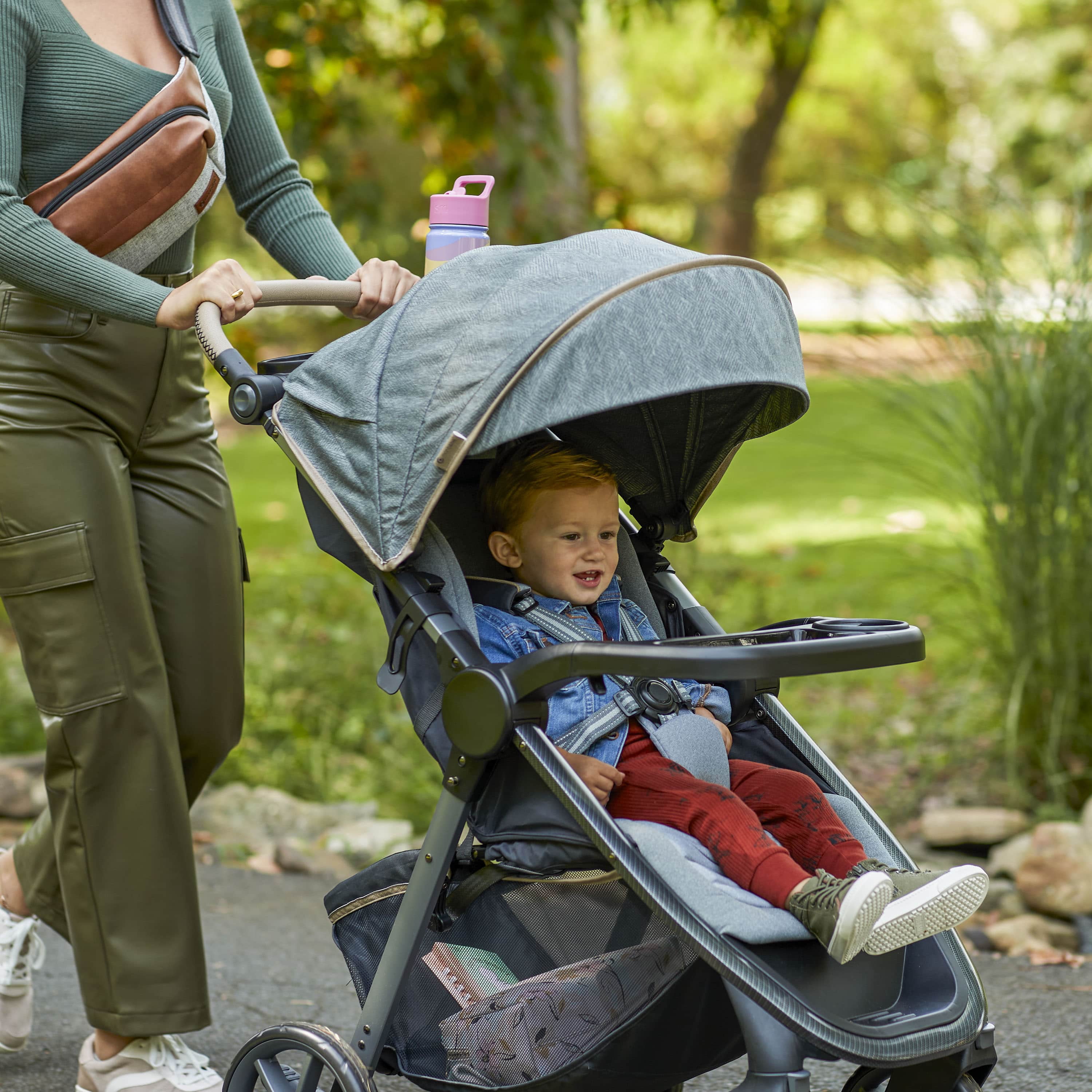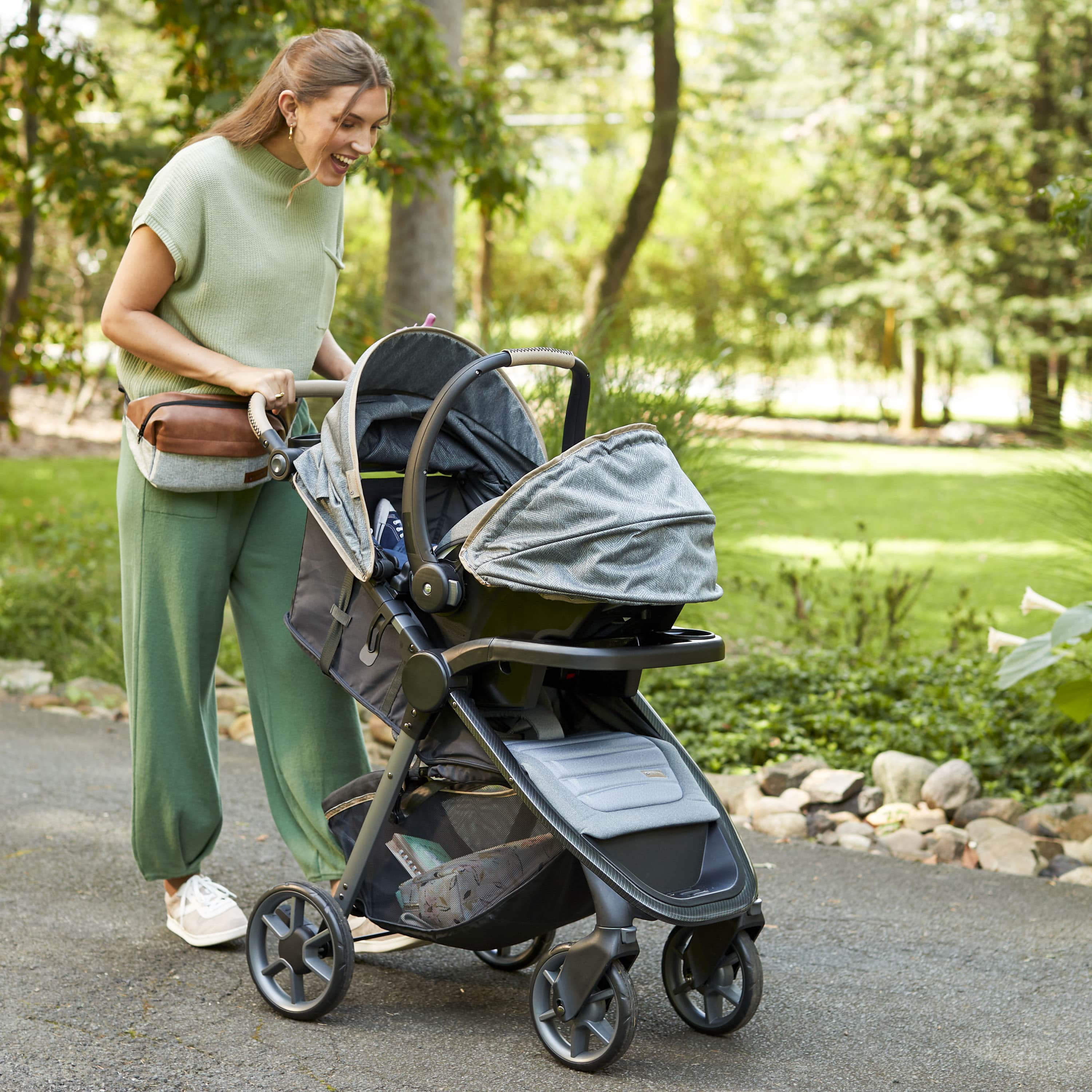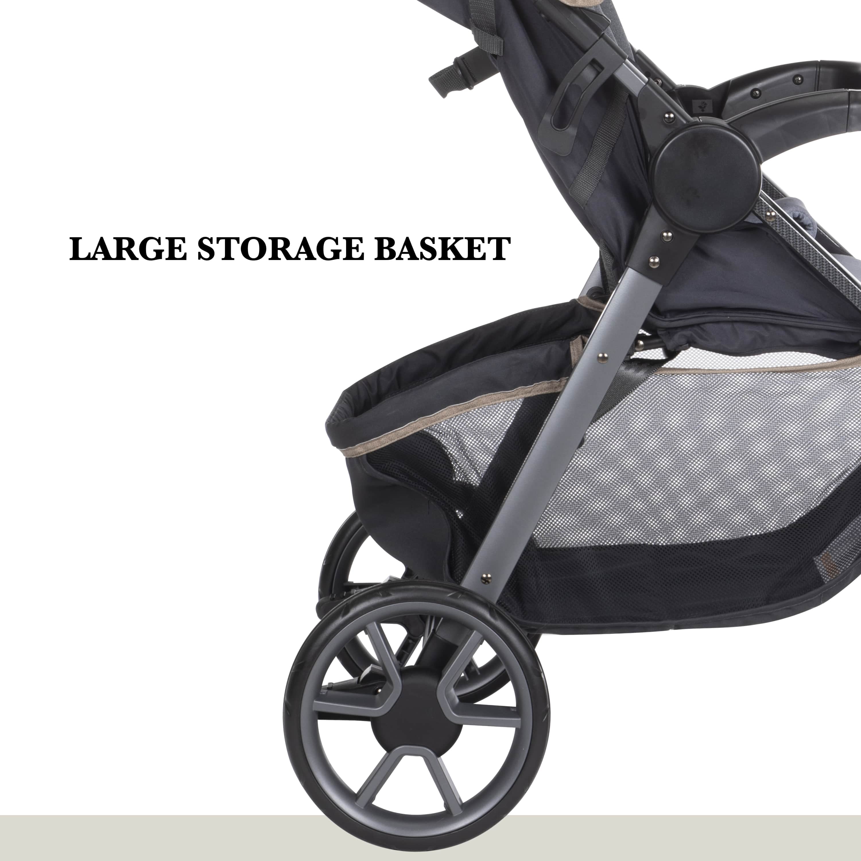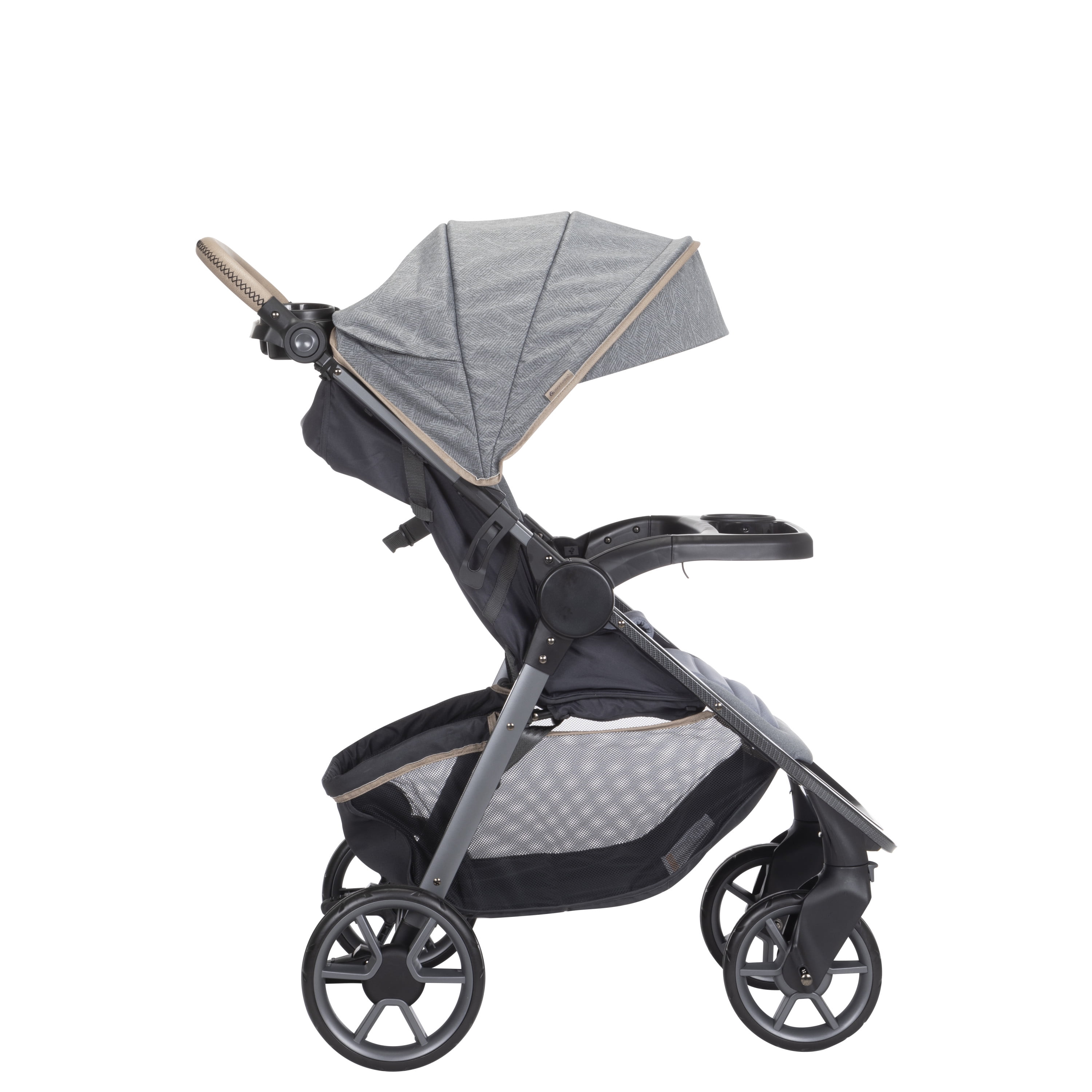Memory foam on both the stroller and infant seat pad Anti-bacterial treatment on all fabrics as well as both the stroller and car seat handles Stroller multi-position reclining seat and 5-point harness system Plenty of stroller storage with oversized basket and covered handlebar compartment Chic, modern aesthetic with beautiful details Adjustable handle with faux-leather grip Includes Safety 1st® onBoard™ LT infant car seat for children 4–30 lbs. Extra-large sun canopy with extendable visor with peekaboo window for ventilation Large removable child tray with easy-to-clean glossy interiors and cup holder grips Dual parent cup holders Front wheel locks for greater stability Each stroller accommodates children up to 50 lbs.