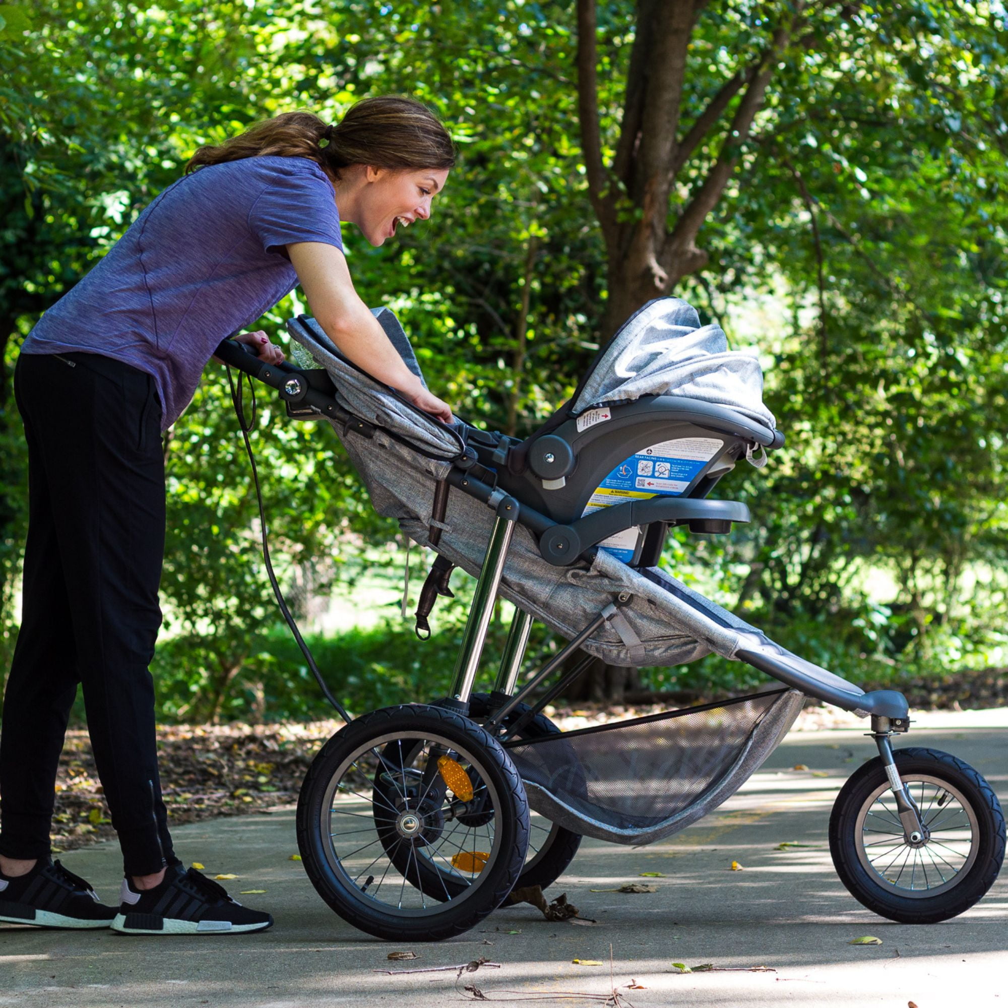 Performance shocks Stroller accommodates children up to 50 lbs Lockable swivel wheel for maneuverability an easy transition from jogging to strolling Air filled bicycle tires with foot brake