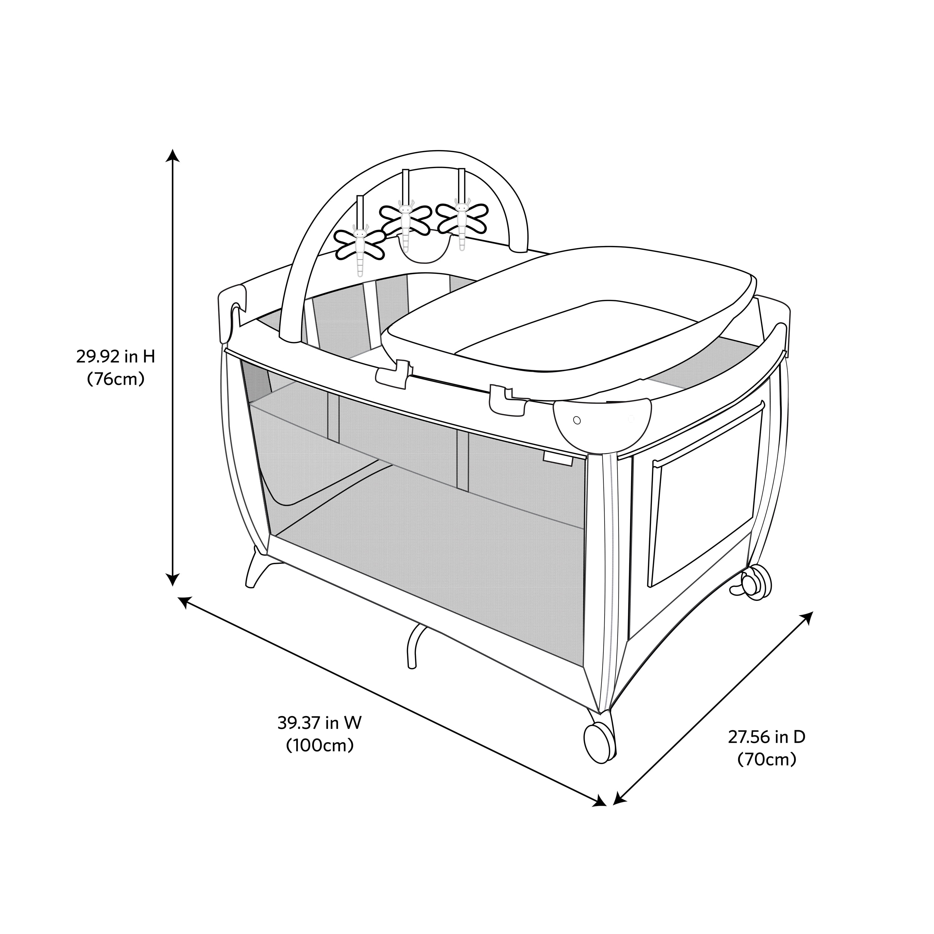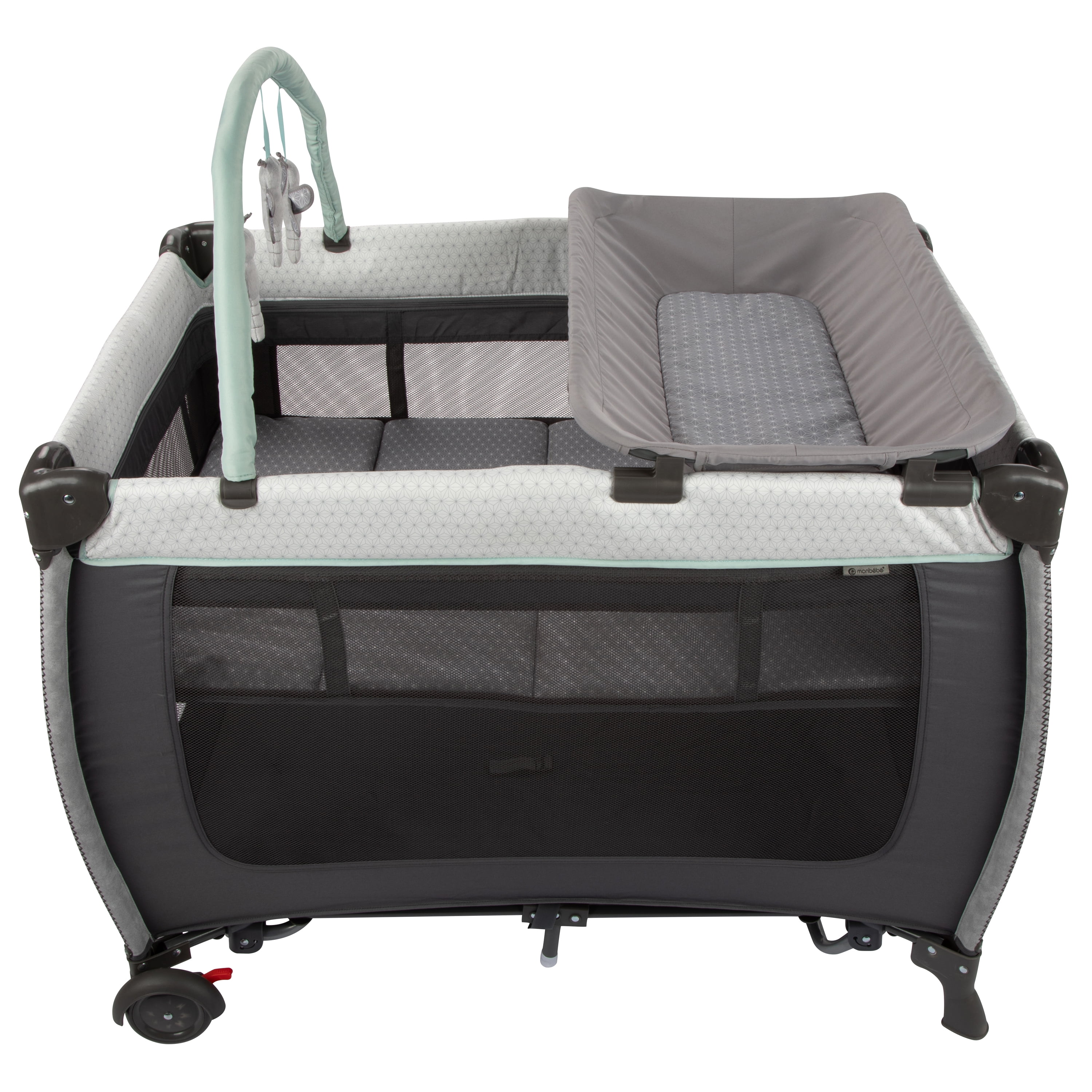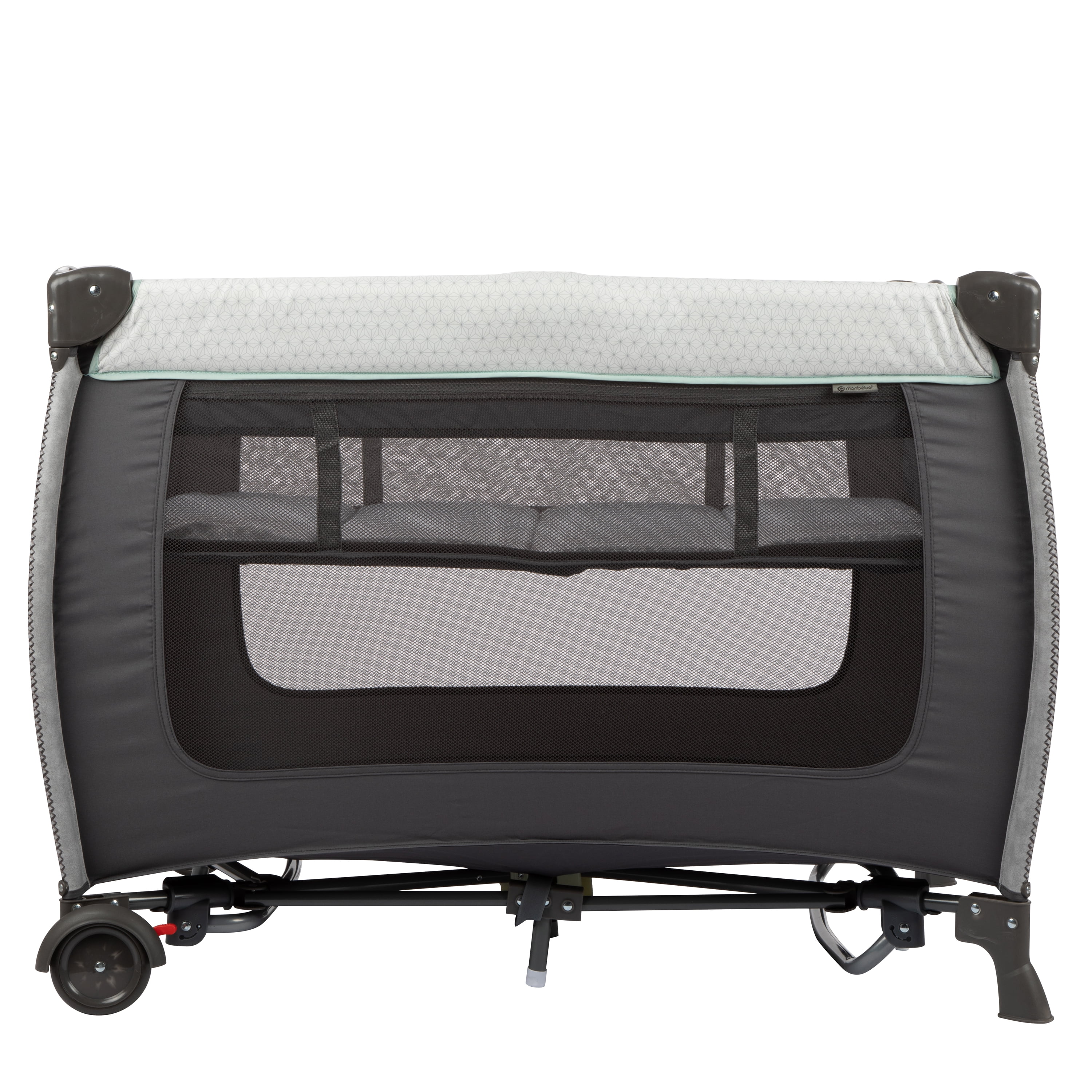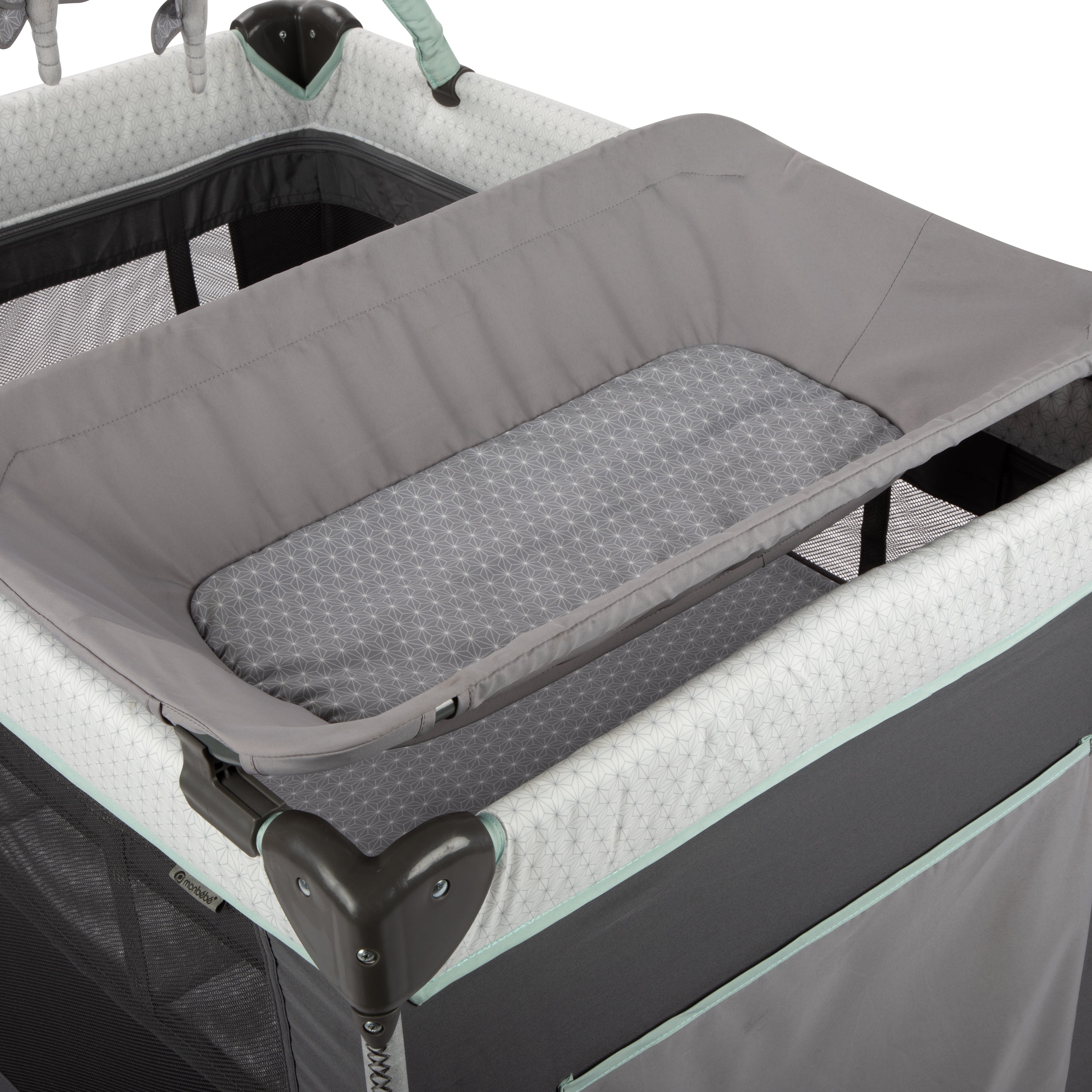 Monbebe Willow Rocking Baby Play Yard with Full Size Bassinet, Stardust: Full size zip in bassinet Rocking or stationary modes Removable, wipeable changer Removable toy bar with 3 toys Large side storage pocket 2 wheels with brakes Carry bag included Suitable for ages 0-36 months and up to 33 lbs. Assembled Weight: 28.7 lb Color: Stardust Designed with a firm, flat sleeping surface that meets the Consumer Product Safety Commission’s recommendations for safe sleep