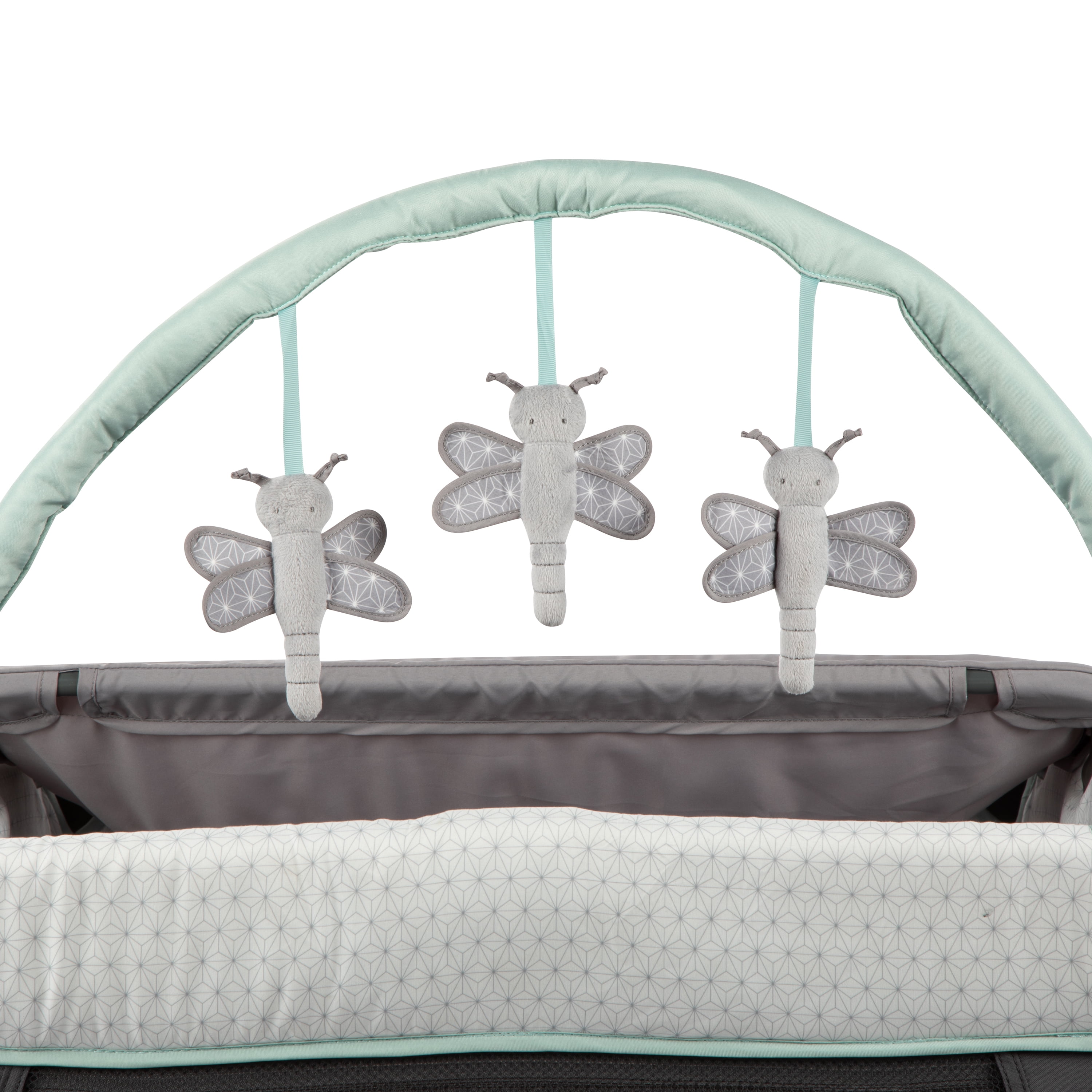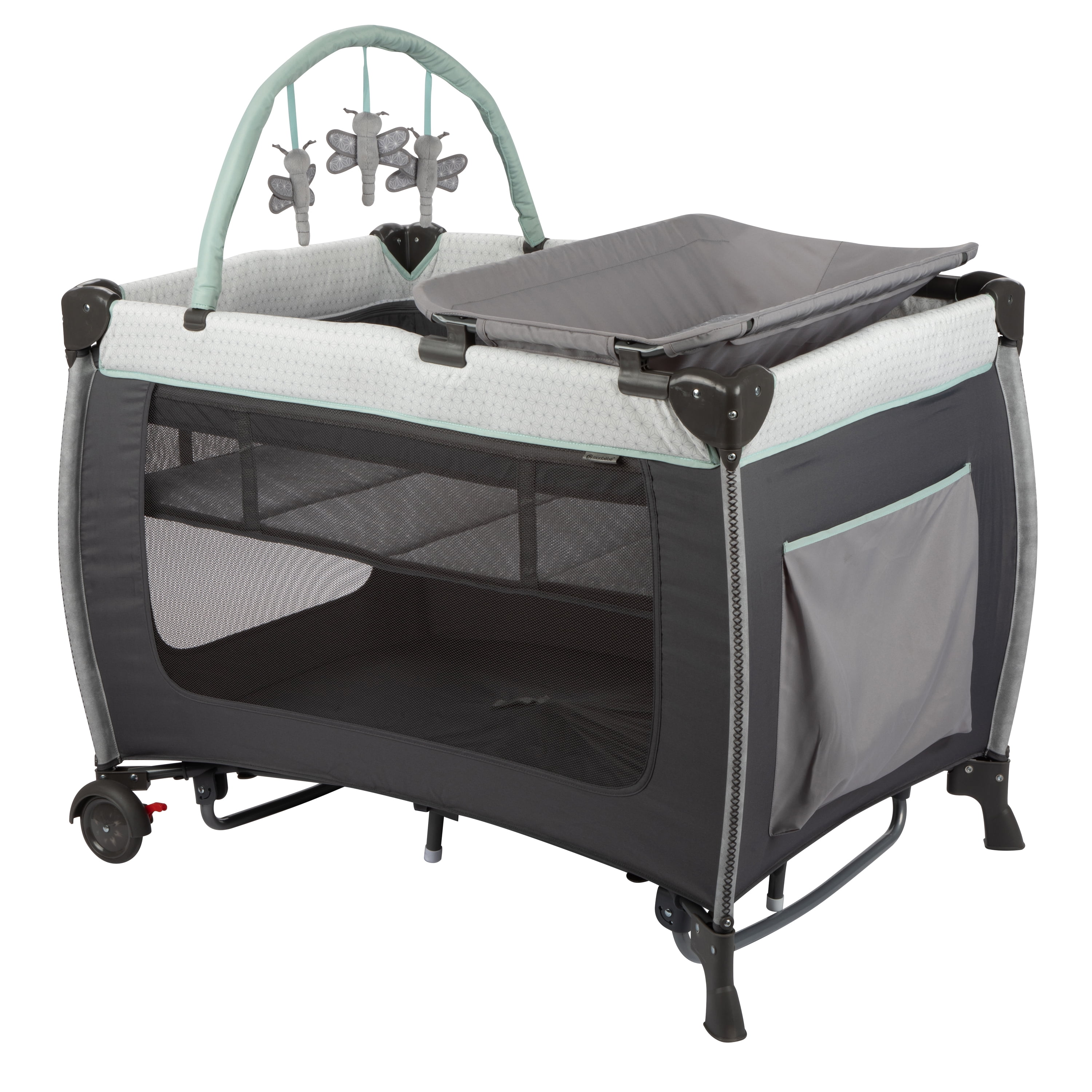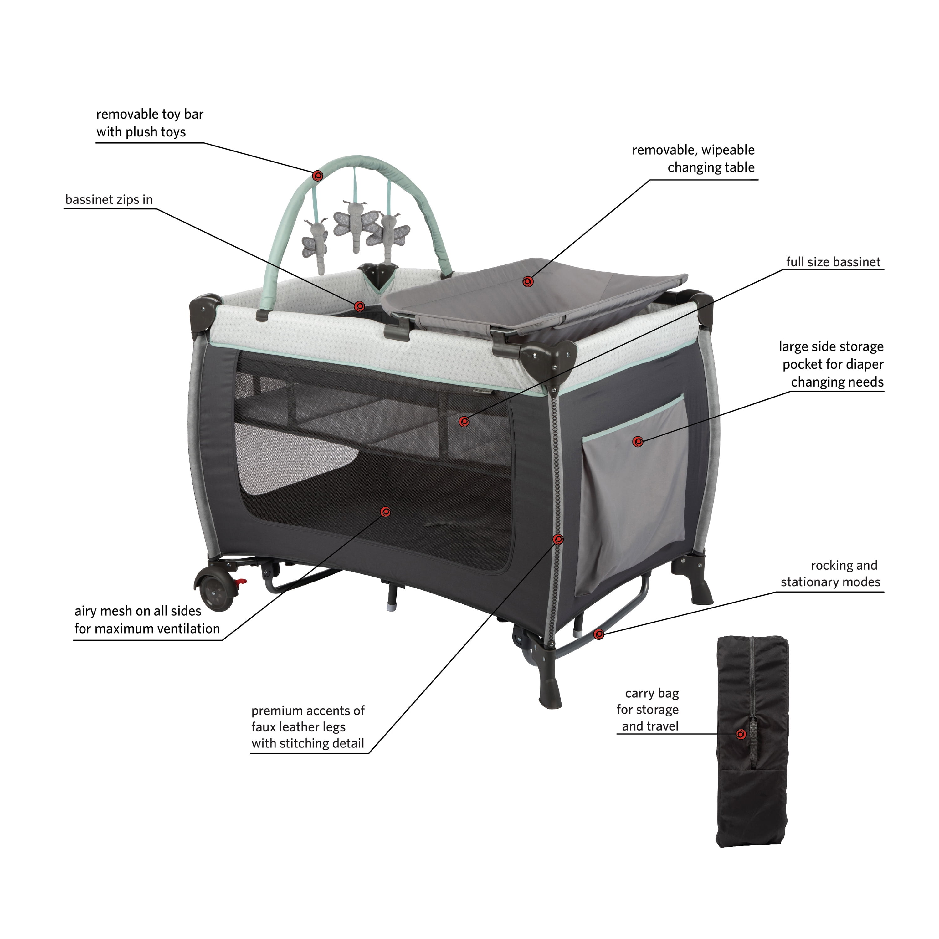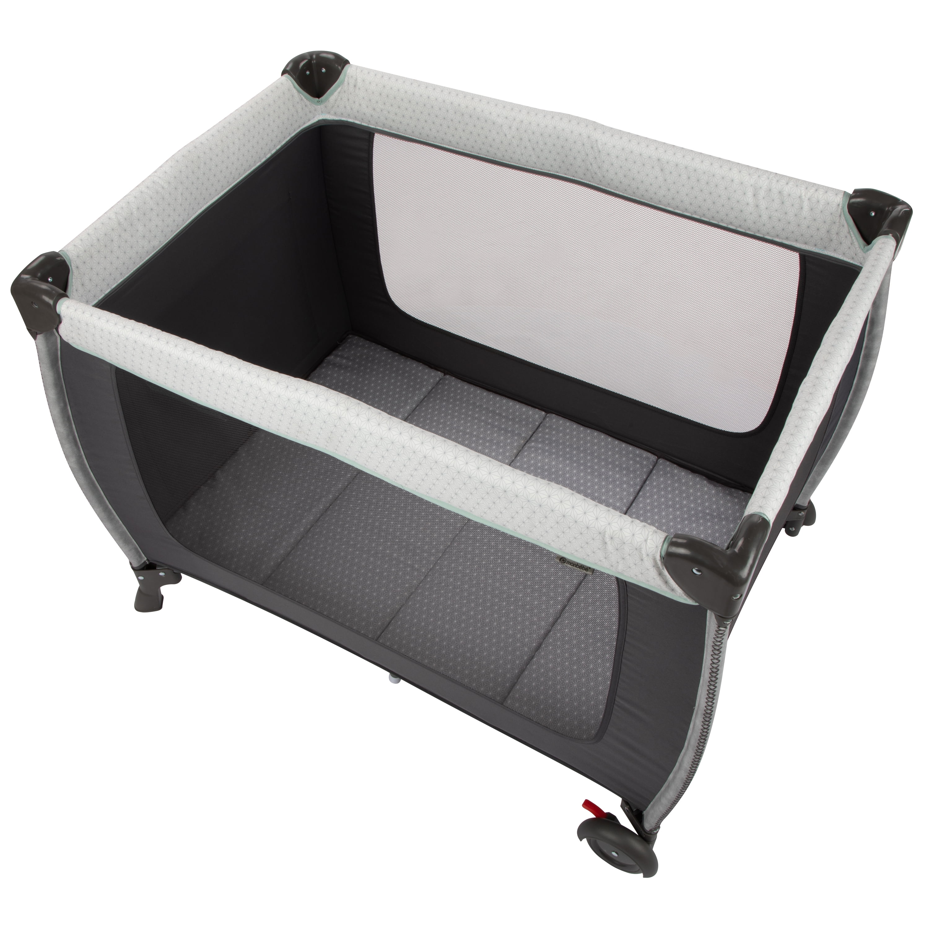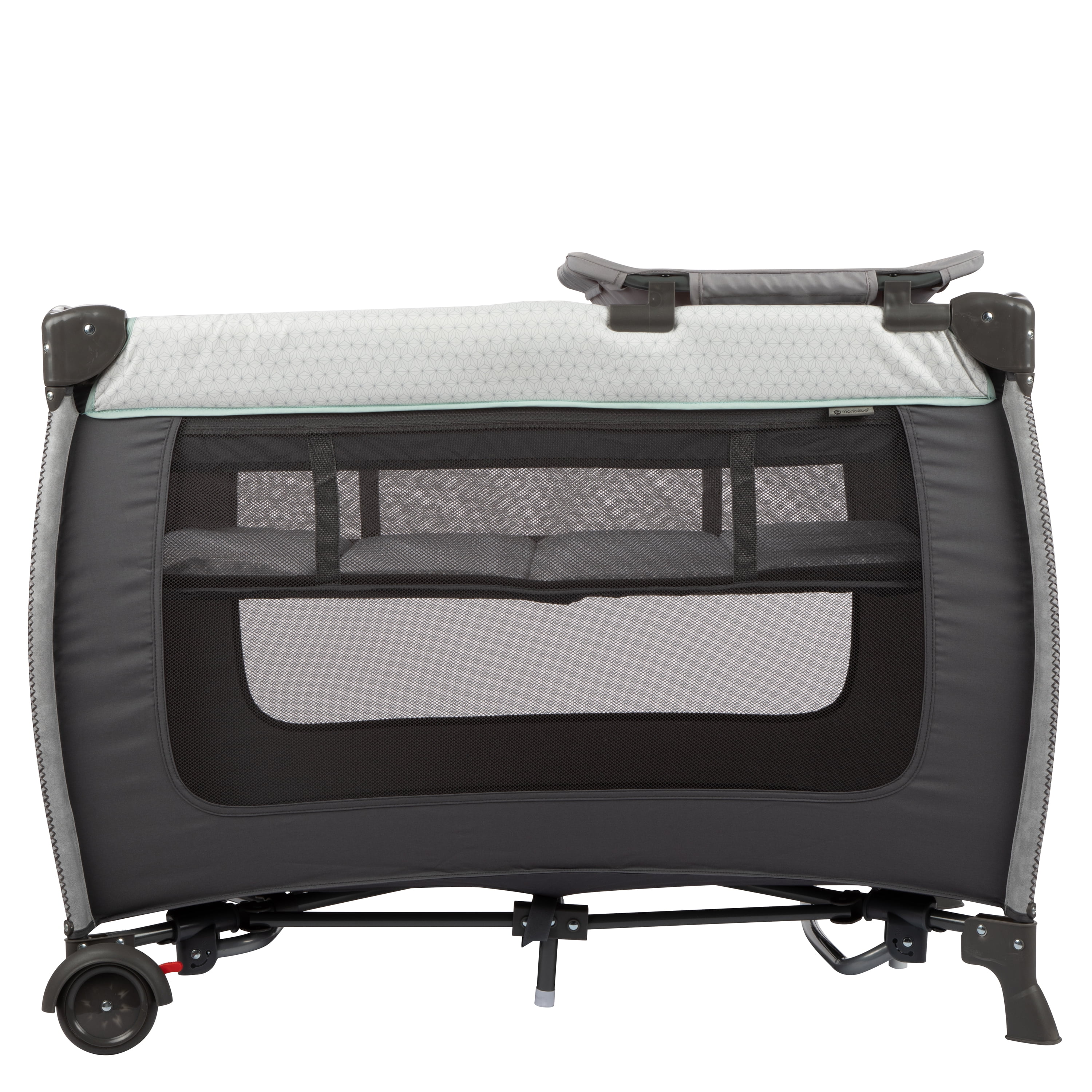 Monbebe Willow Rocking Baby Play Yard with Full Size Bassinet, Stardust: Full size zip in bassinet Rocking or stationary modes Removable, wipeable changer Removable toy bar with 3 toys Large side storage pocket 2 wheels with brakes Carry bag included Suitable for ages 0-36 months and up to 33 lbs. Assembled Weight: 28.7 lb Color: Stardust Designed with a firm, flat sleeping surface that meets the Consumer Product Safety Commission’s recommendations for safe sleep
