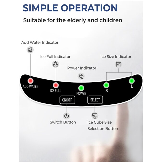 • Easy Operation Interface and Optional Ice Size: The interface is simple to use and features smart indicators that remind you when the ice basket is full and when the water needs to be refilled