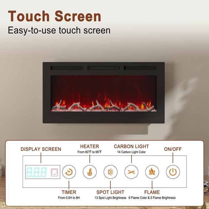 This electric fireplace is designed for wall-mounted/recessed in-wall mounting. Creating a cozy atmosphere of a traditional fireplace, this electronic fireplace has realistic flames with a real fire look. The mult flame settings radiate a soft ember glow up to an intense blaze. Control the heat and flame with the remote control or touch screen. A bit more homey and interesting to your room, it is the excellent choice, whether you want it for aesthetic or heat purposes.
